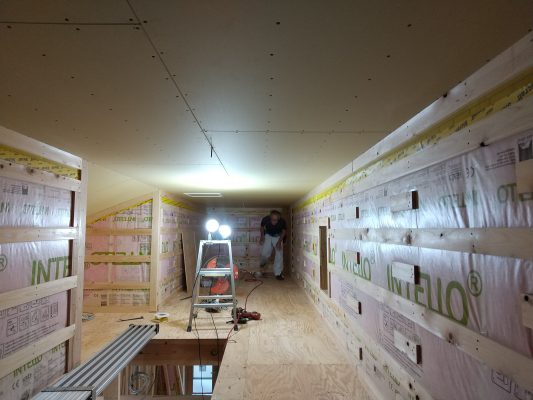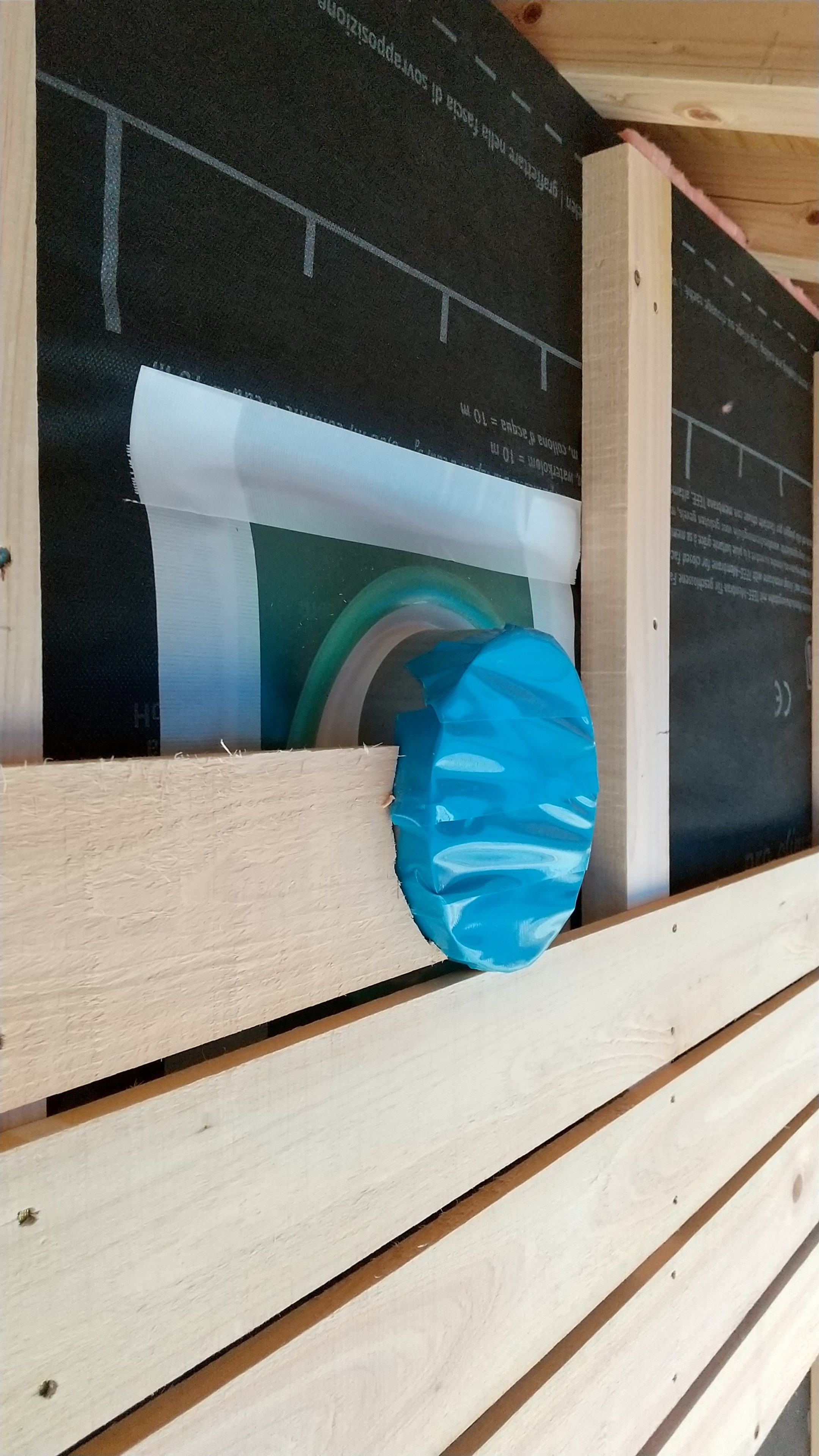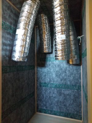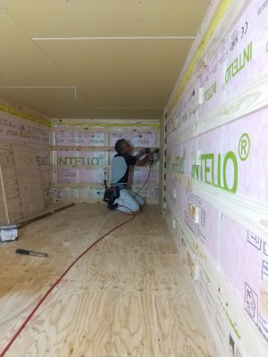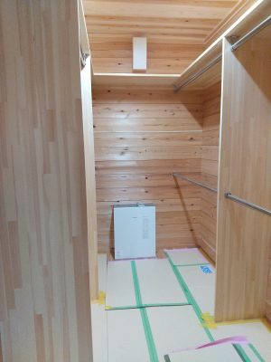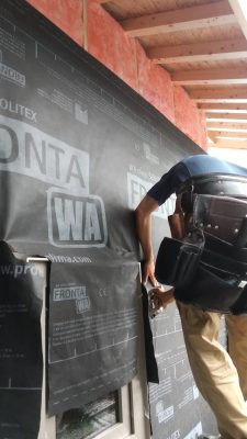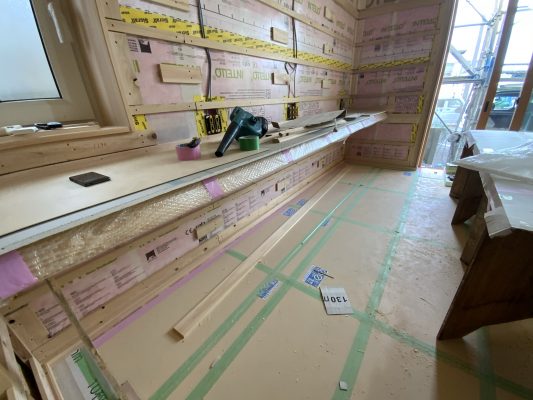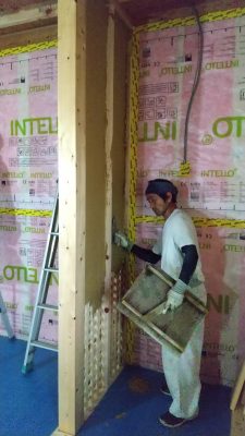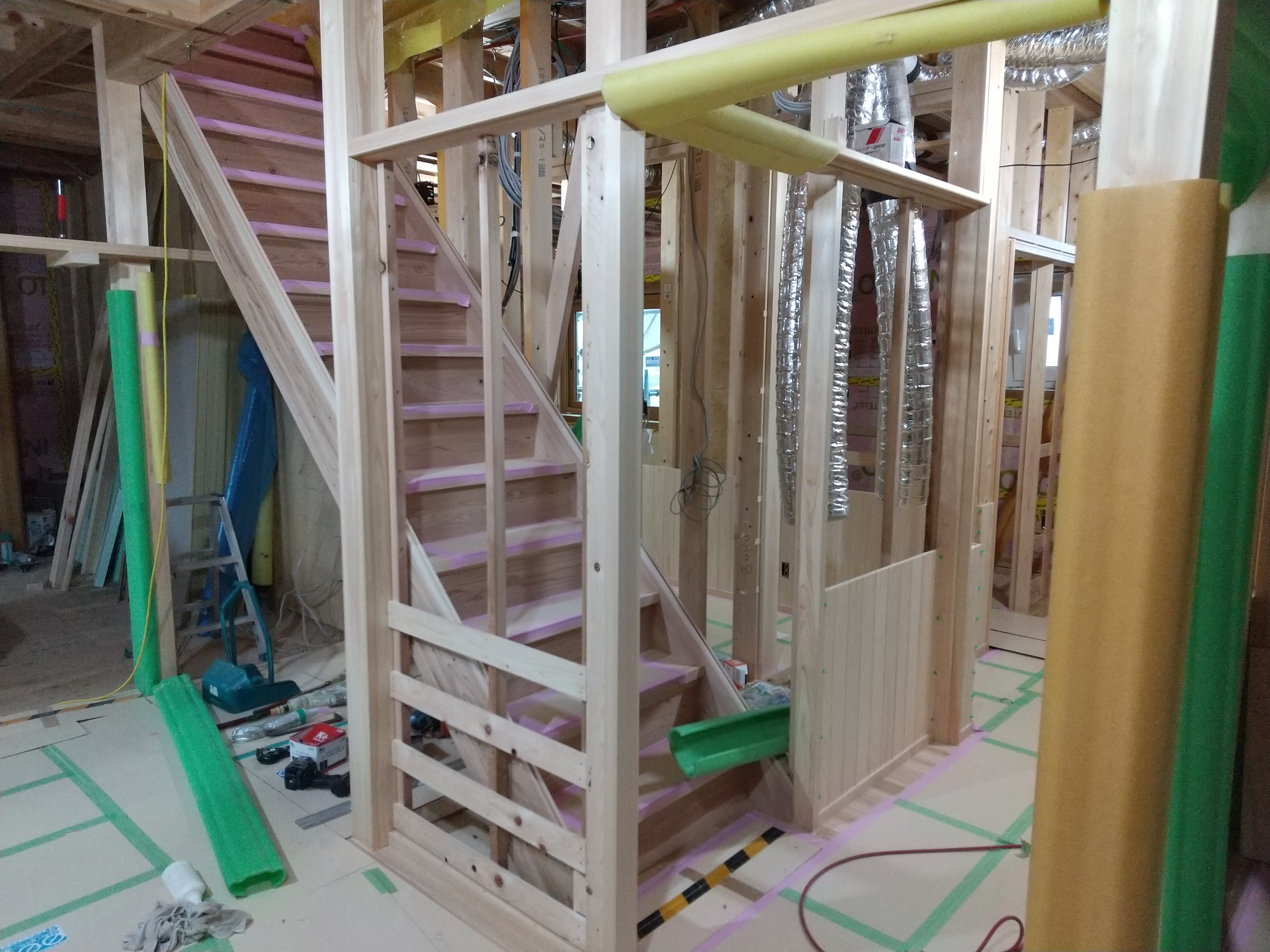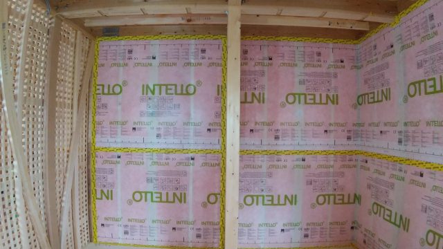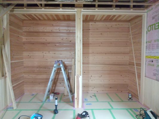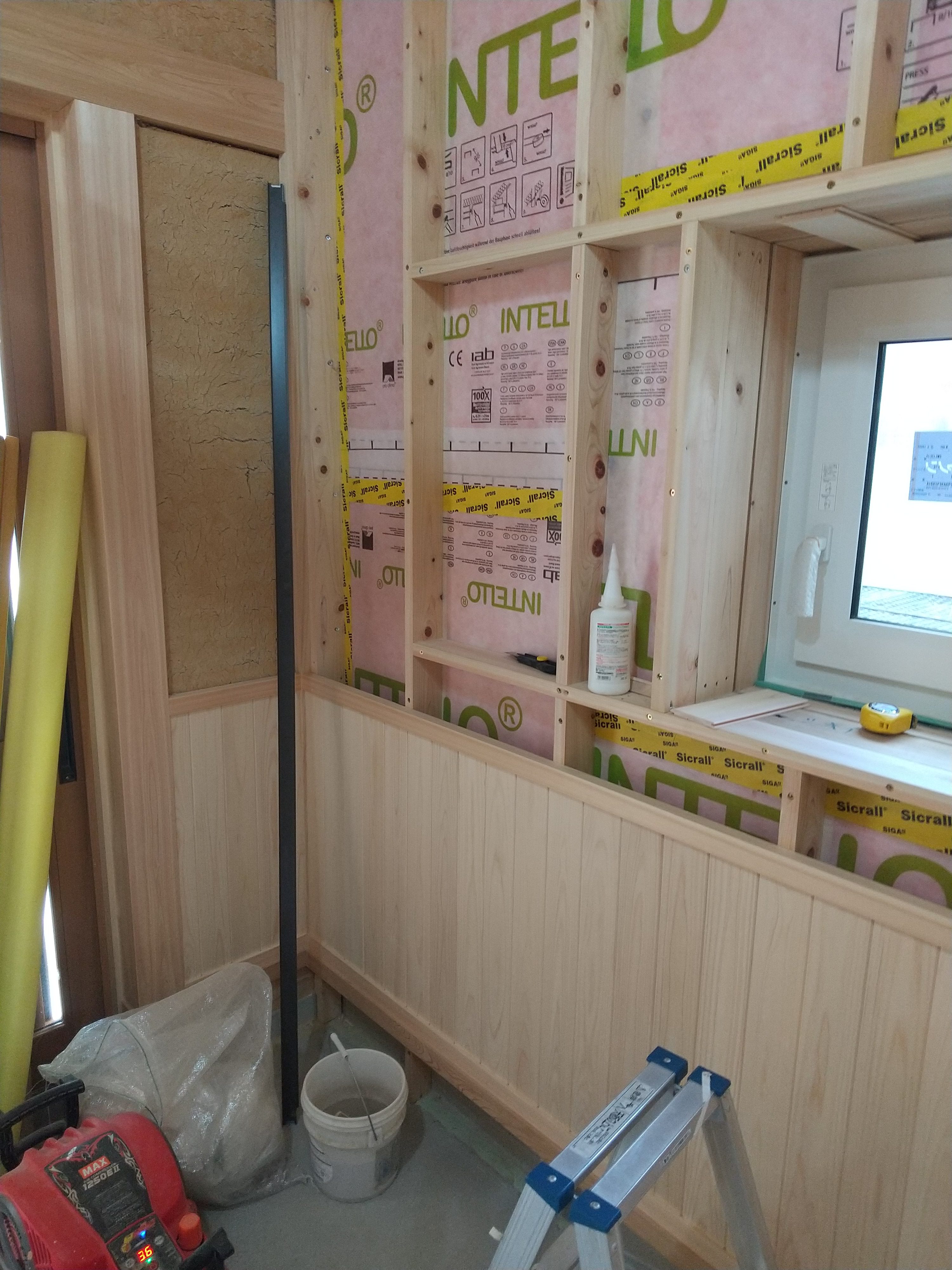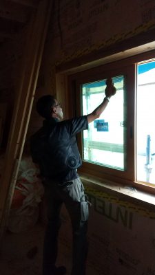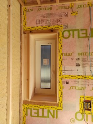 この後、室内で発生した湿気により、壁内部で結露が起きないように、この外側に通気層を設けます。透湿防水シートは、外部からの雨水の侵入を防ぐ防水性と、壁体内の湿気を外部に逃がす透湿性を兼ね備えたシートなのですが、k棟梁はどんな構造になっているんだろうね、凄いよねと商品に感心しながら施工しています。本当に発明した方は凄いですね。
