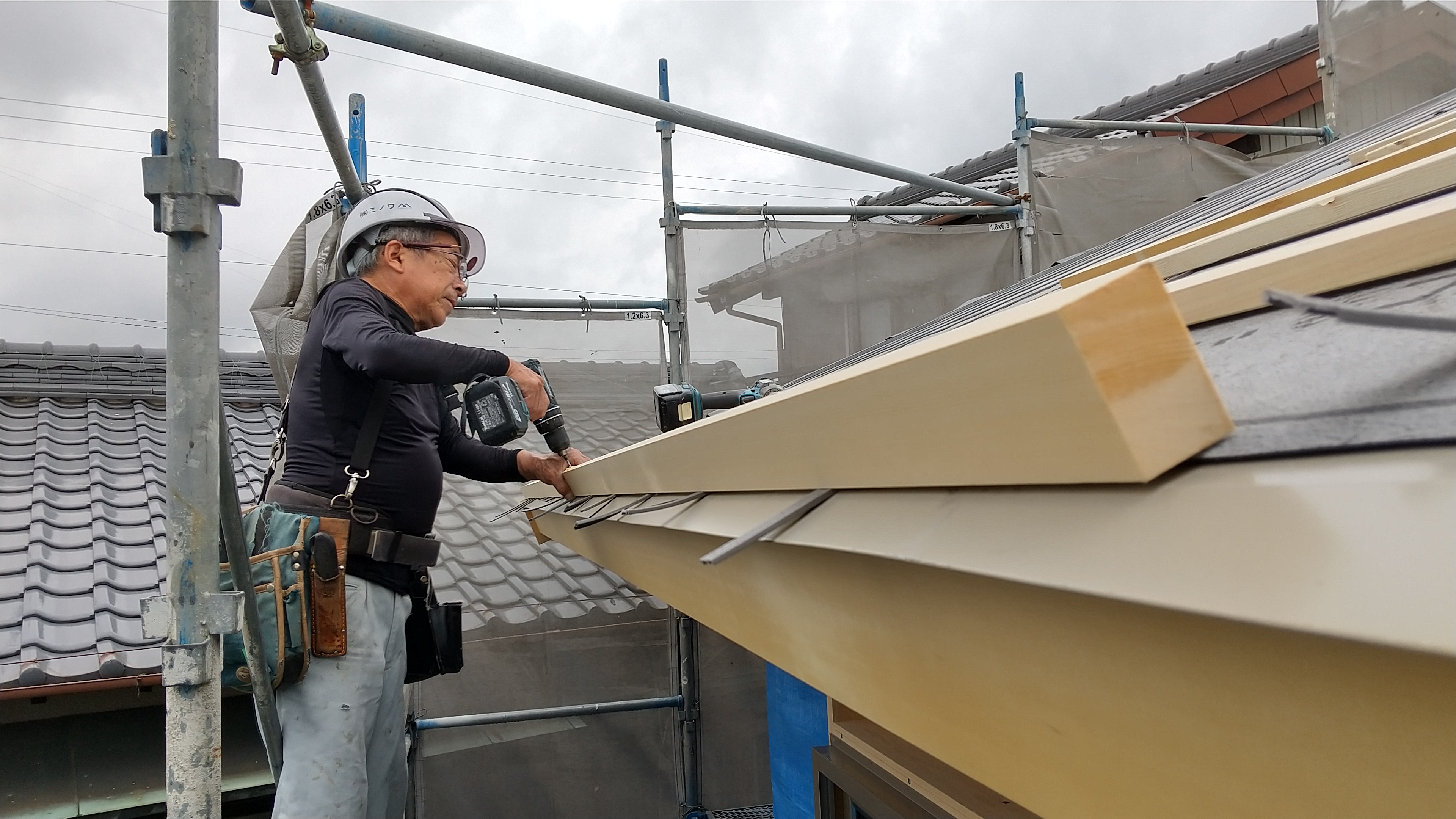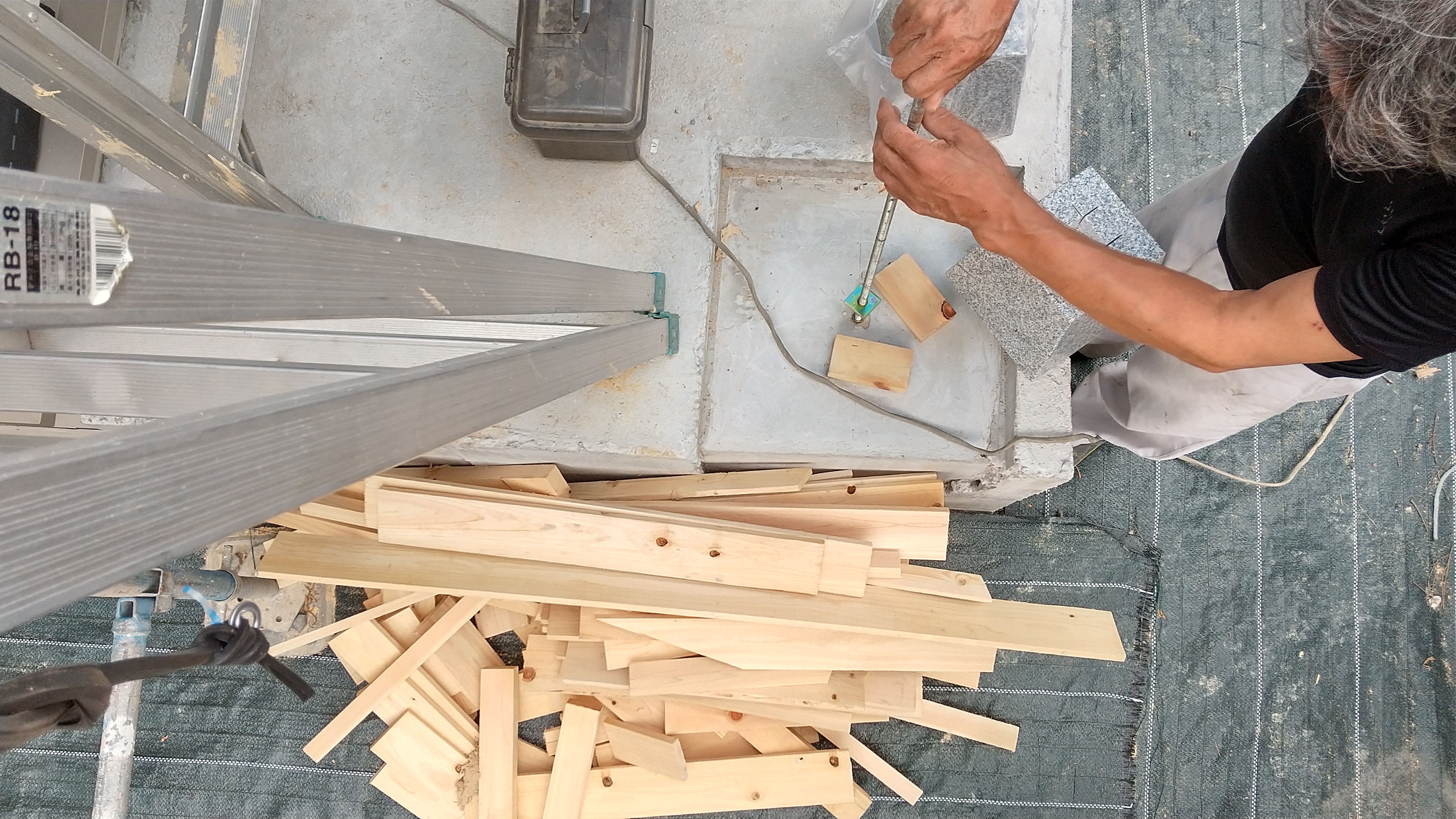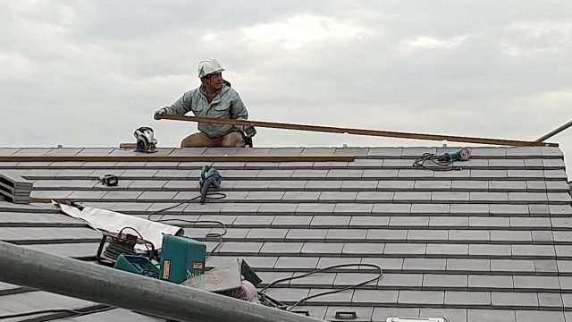 k棟梁は、樹脂製の物もあるんだけどね~と言いつつ、瓦屋さんから注文されたサイズの瓦桟を加工し唐草の上に取り付けていきます。さてさて、皆さん外に居る間に、粗探しです(笑)