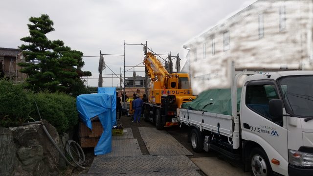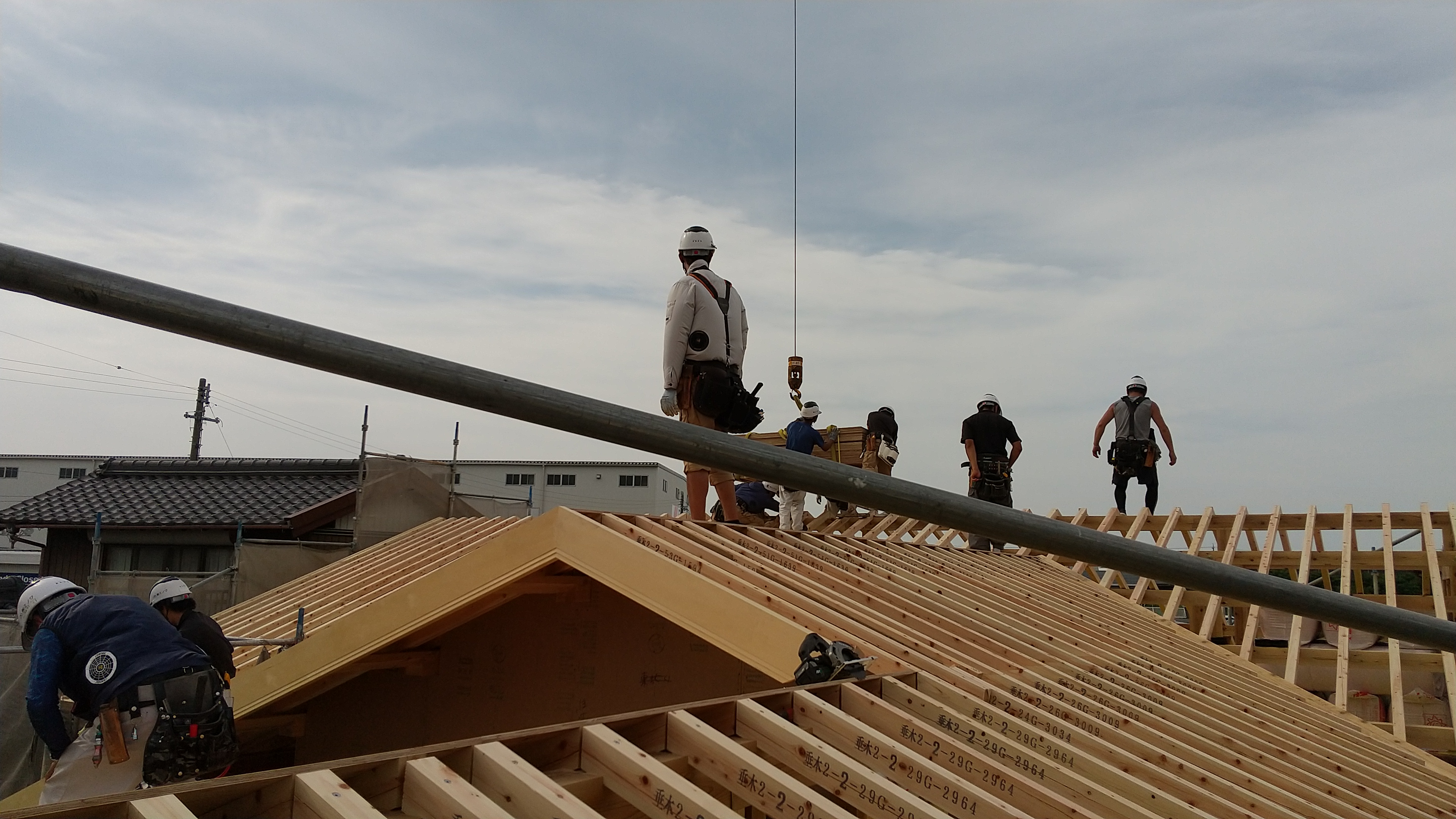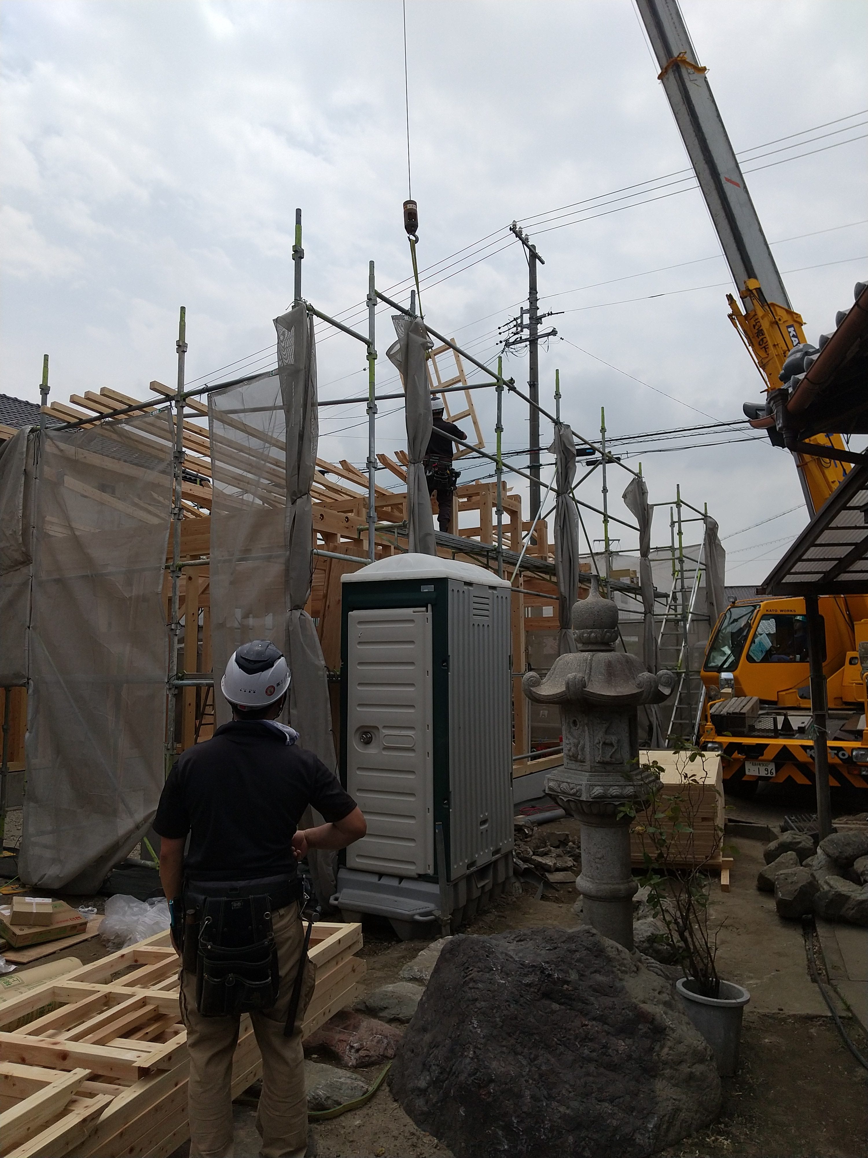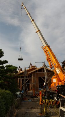 今回は、ひっそりと上棟です。母屋に続いての車庫新築工事なので上棟式等は行いませんが、大きな車庫なので大工さん4人とレッカーさん+新入社員のo本君の6人で行いました。