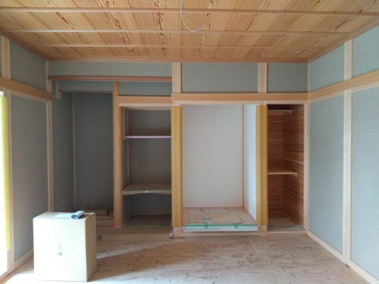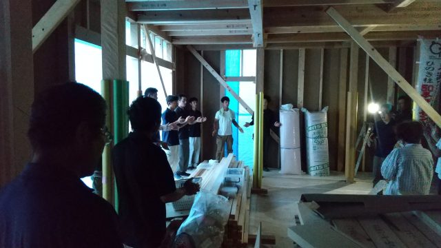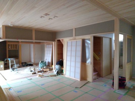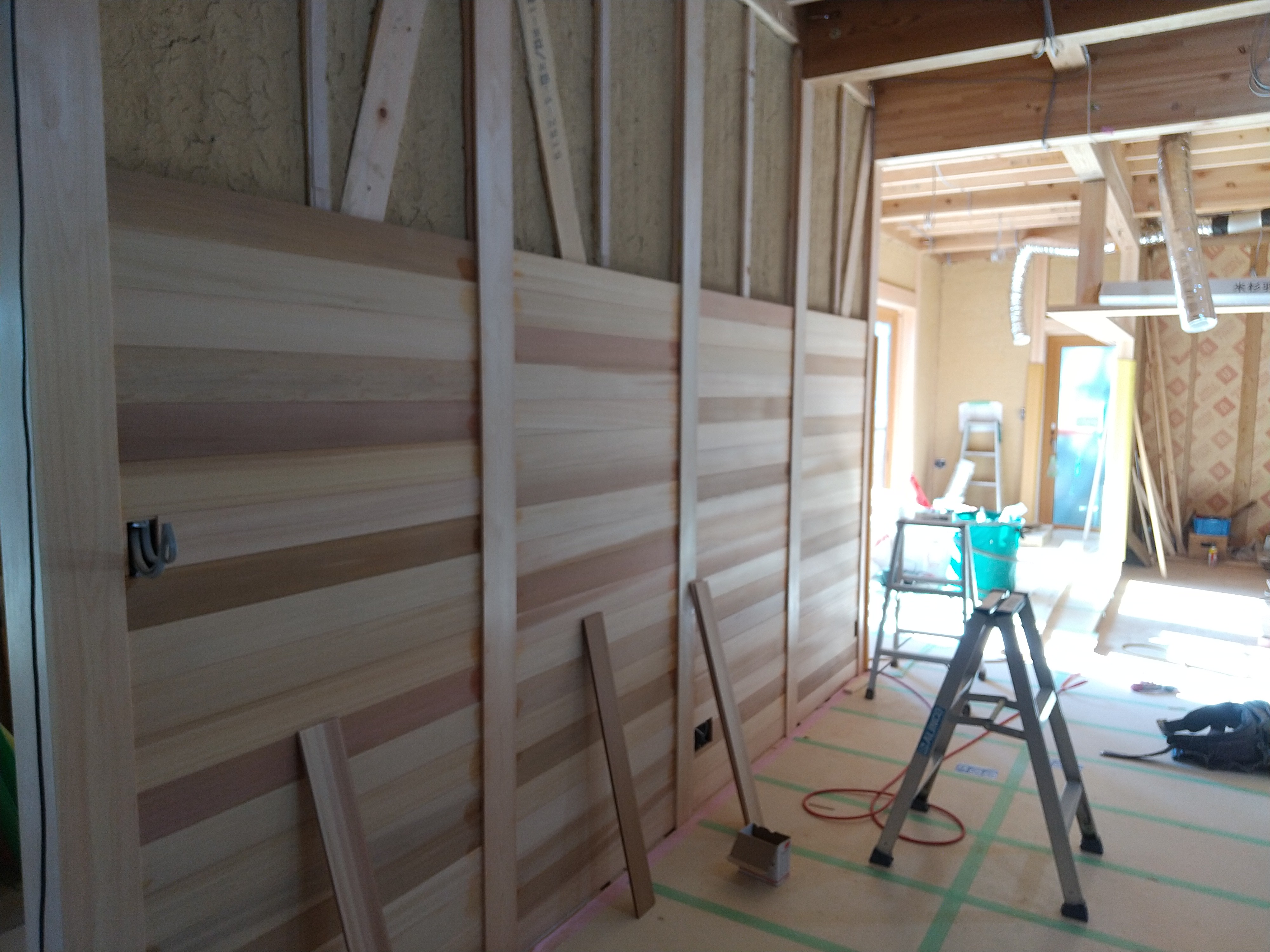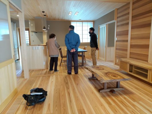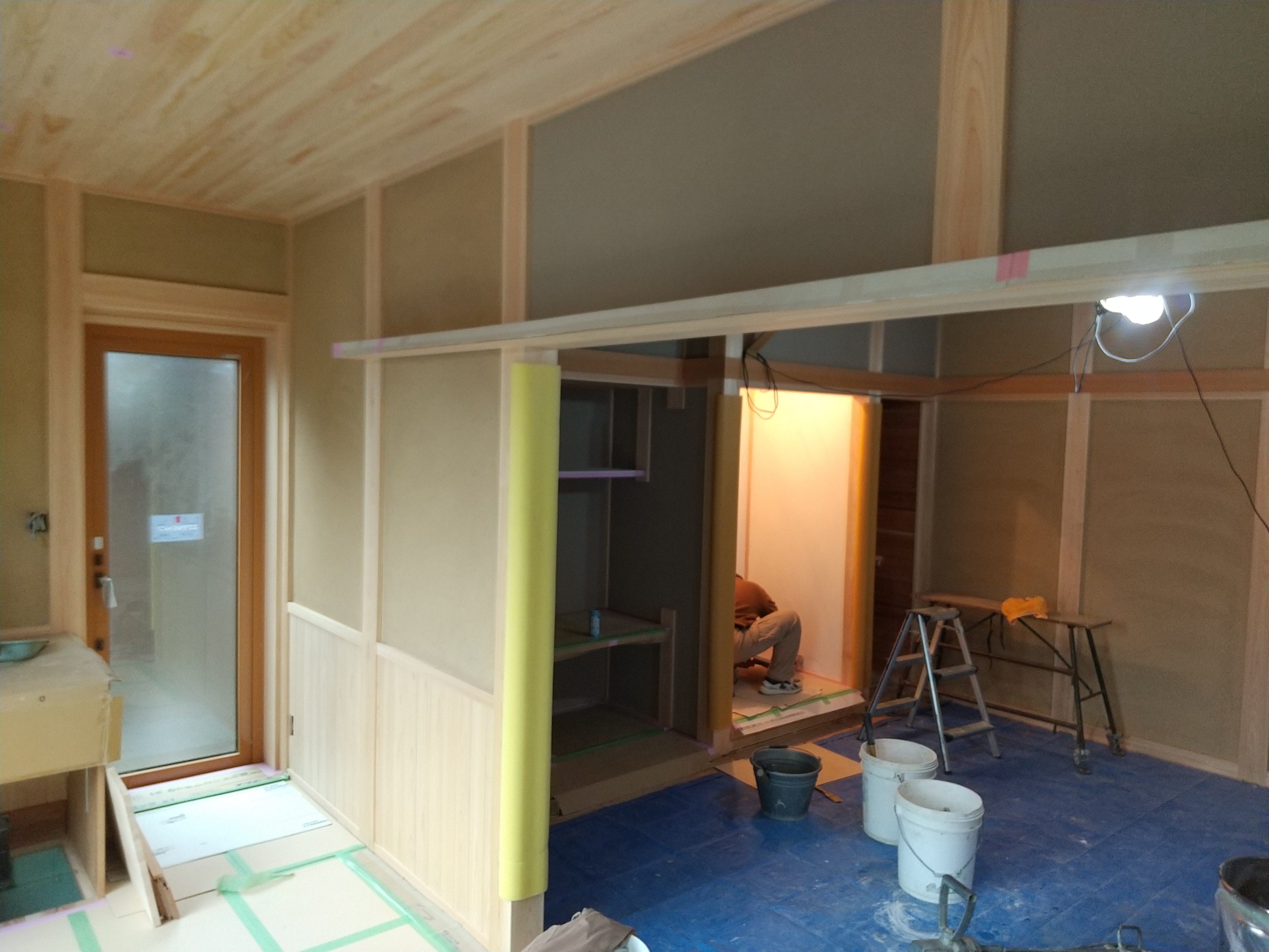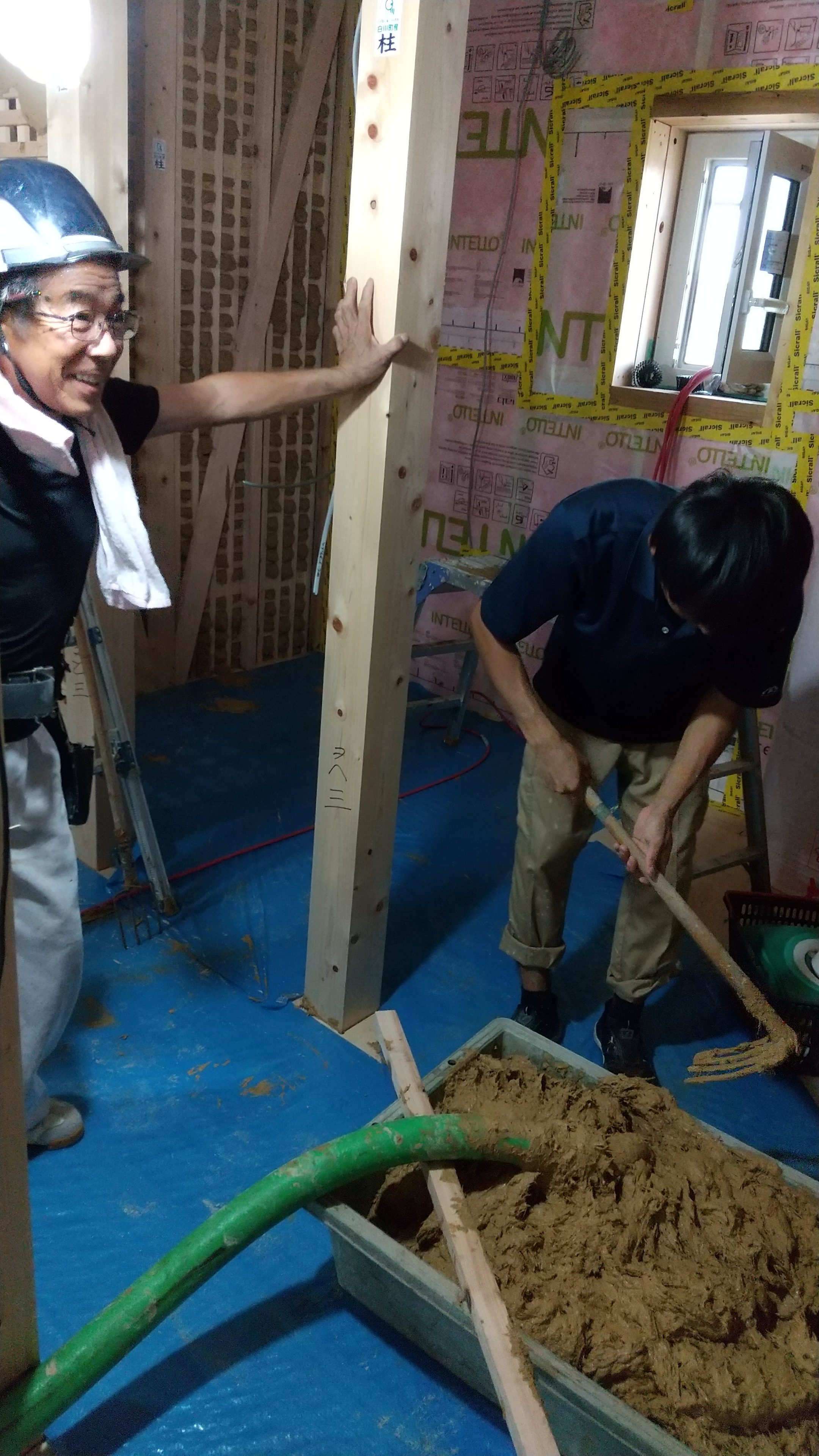 k棟梁も中が賑やかで羨ましくなって、見学に入って来ました。昔は、棟梁も荒壁を塗ったそうです。i様の念願の土壁。お母様は「今日は帰ってきて中を観たら喜ぶね~」と、息子さんが喜ばれる事を楽しみにしてみえました。