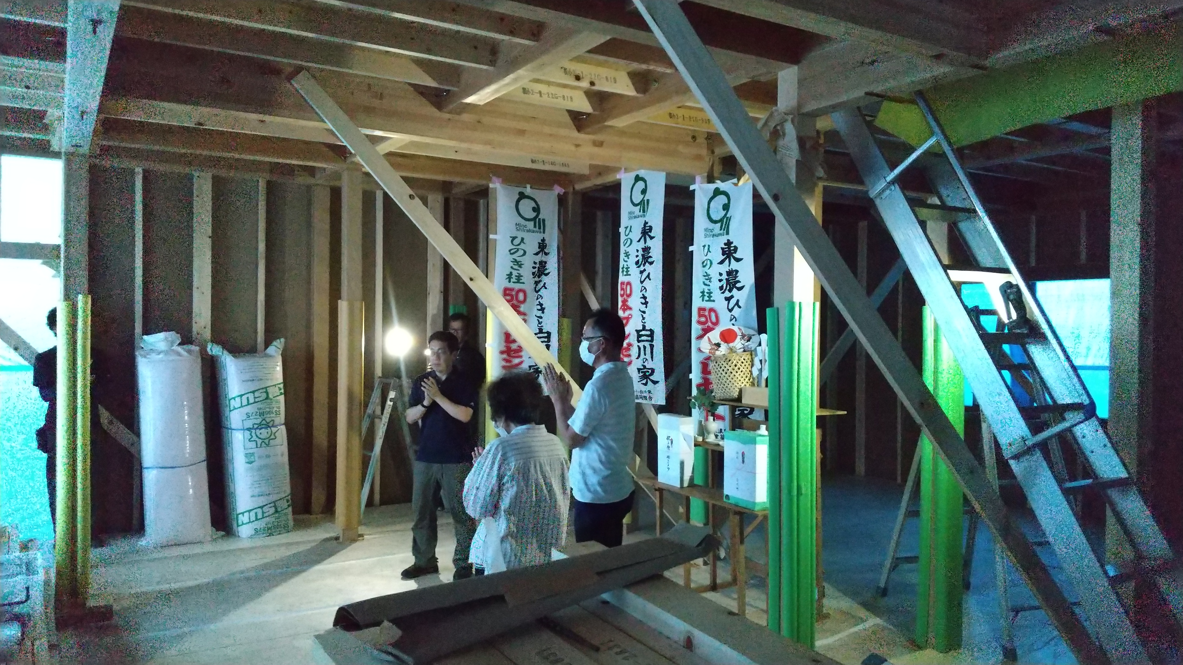 雨仕舞も行い、上棟式です。i様は、お父様が建てられた家も気に入っていたけれど、お母様が段差がなく暖かい家に住みたいとの希望で、建て替えを決意されたそうです。お昼間に伺った80歳のOBの方からは、「私は4回も家を建てたり買ったりしたけれど、今の家はミノワさんで建ててもらって非常に気に入っている。コロナで皆が家から出られないストレスがあると言っているけれど私にはちっとも無いのよ。人生どこにこだわるかだけど、私は家にこだわって良かったわ。今の家にいるのが一番好きだから。」とおっしゃっていただきました。i様にもそんな風に言っていただける家にしたいと思います。上棟おめでとうございました。
