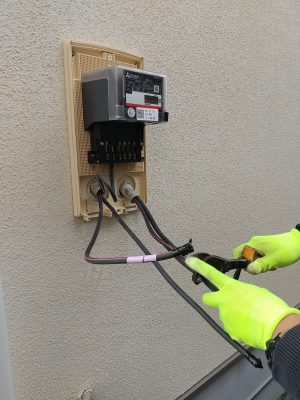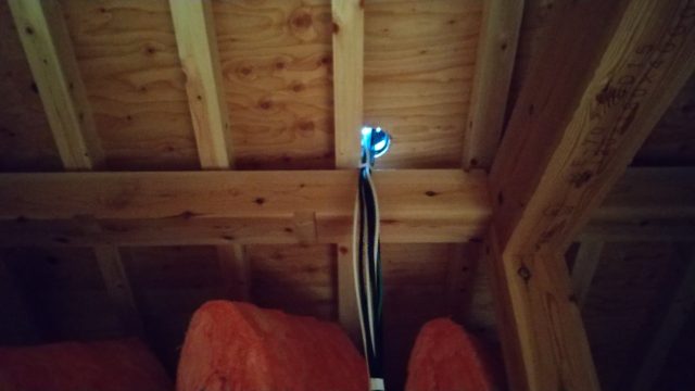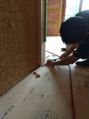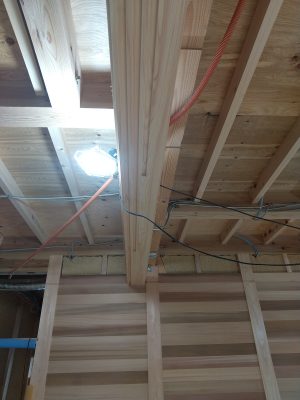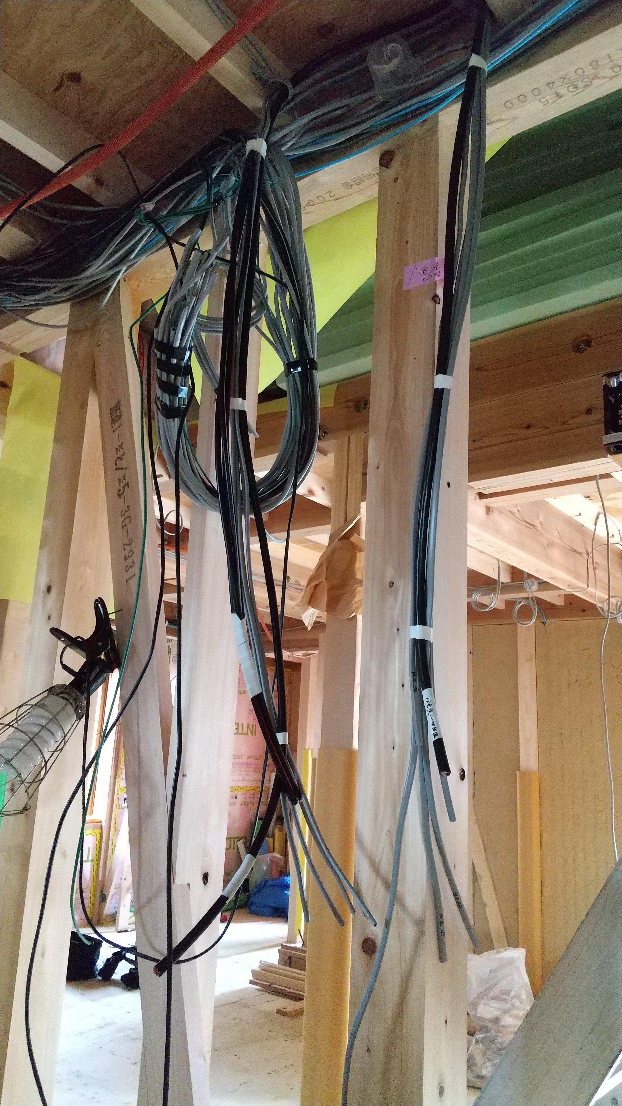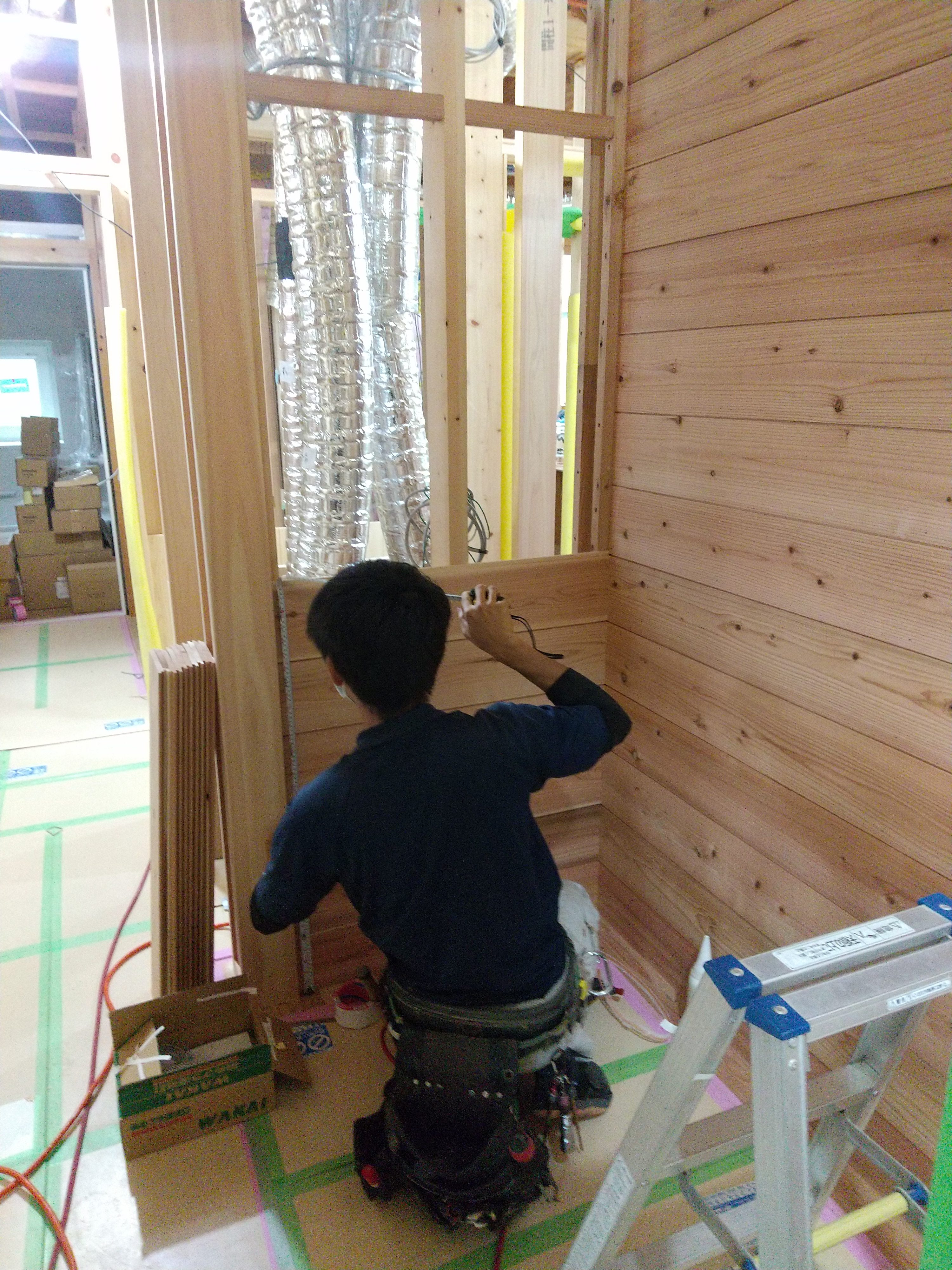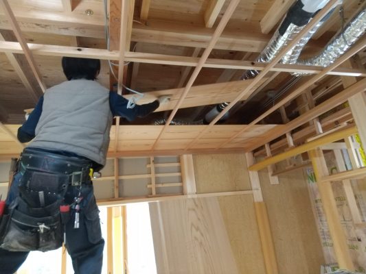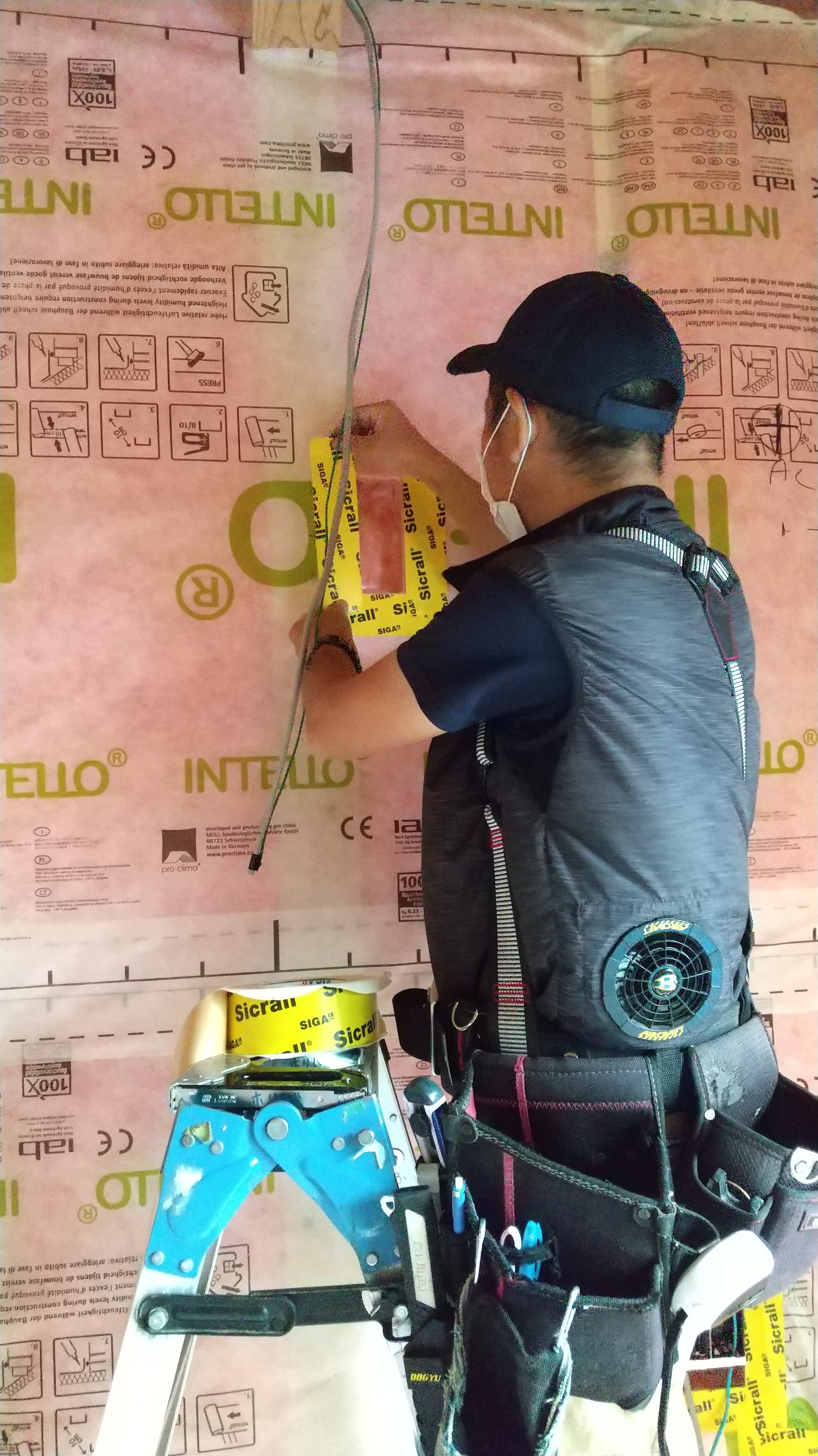 内部では、f電気のh場さんが、慣れた手つきで気密シート部分に電気配線を施していきます。大切な部分なので、大工さんの腕もですが、電気屋さんの腕も大切です。