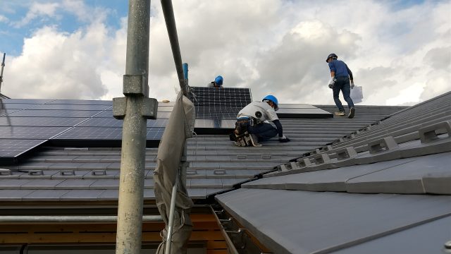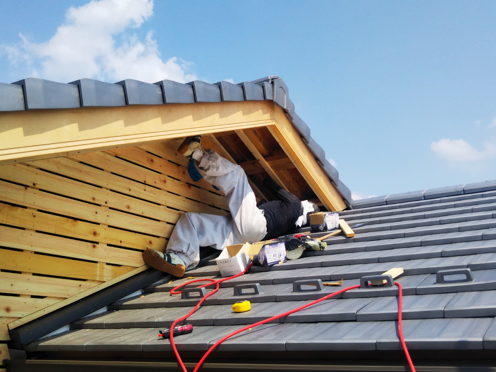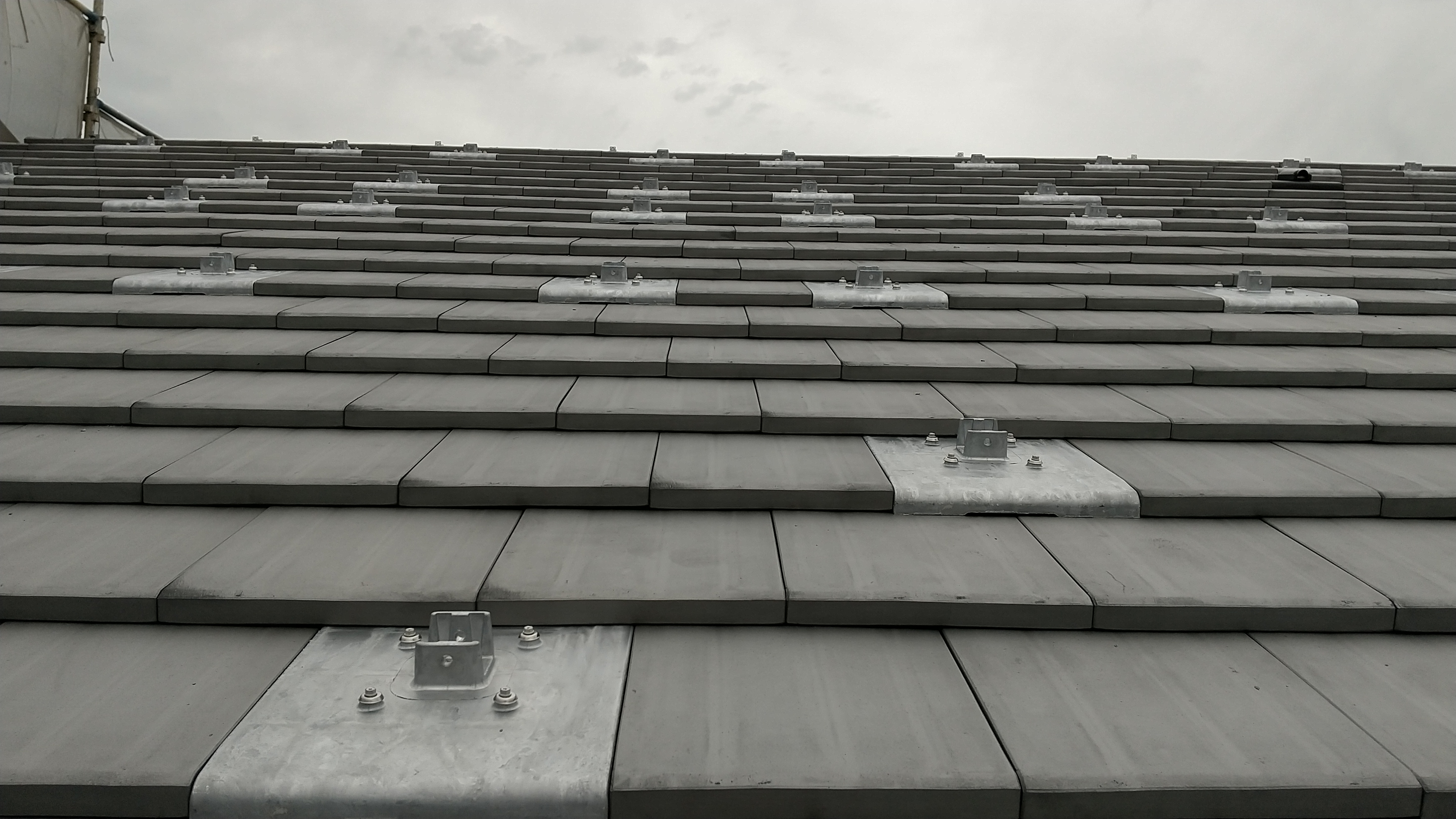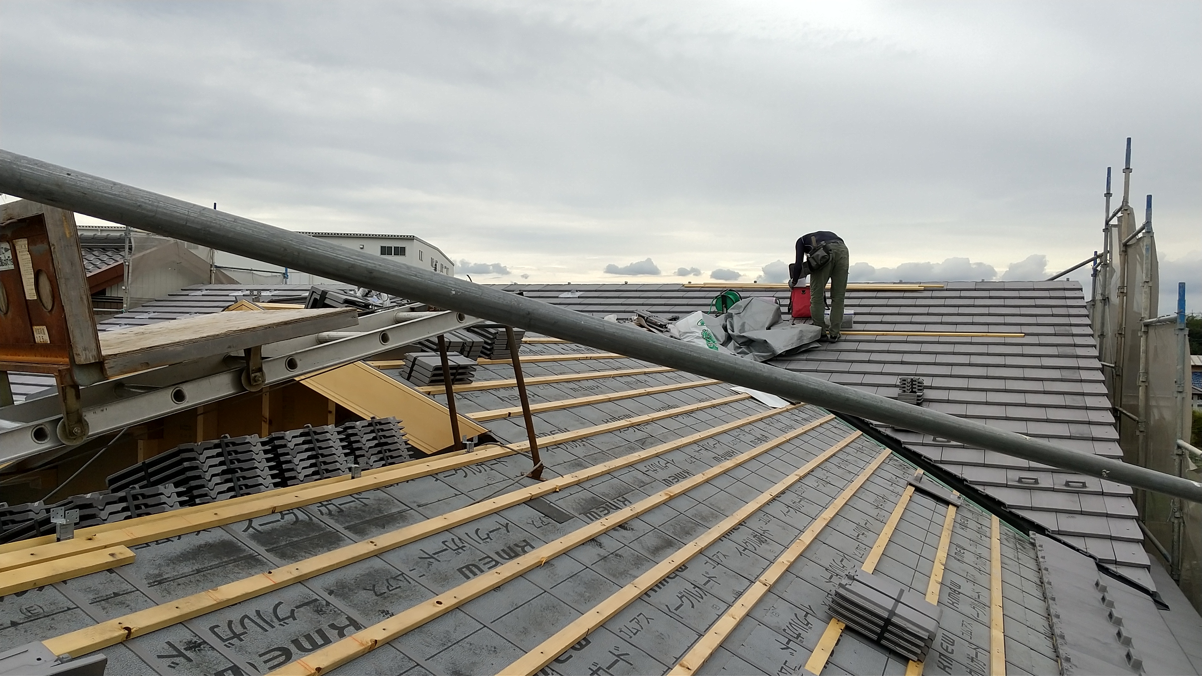 今回は、太陽光発電を設置しますので、支持瓦と配線瓦も取り付けています。配線瓦は、配線の劣化を防ぎ、配線が屋根や壁を伝わないのですっきりした見た目になります👍