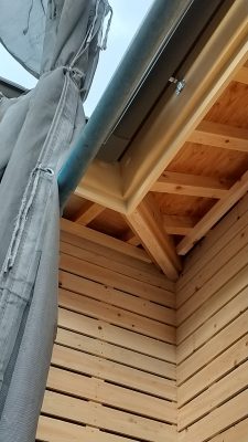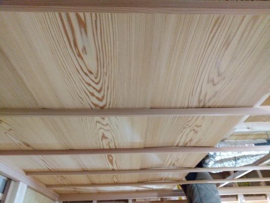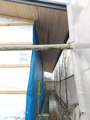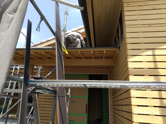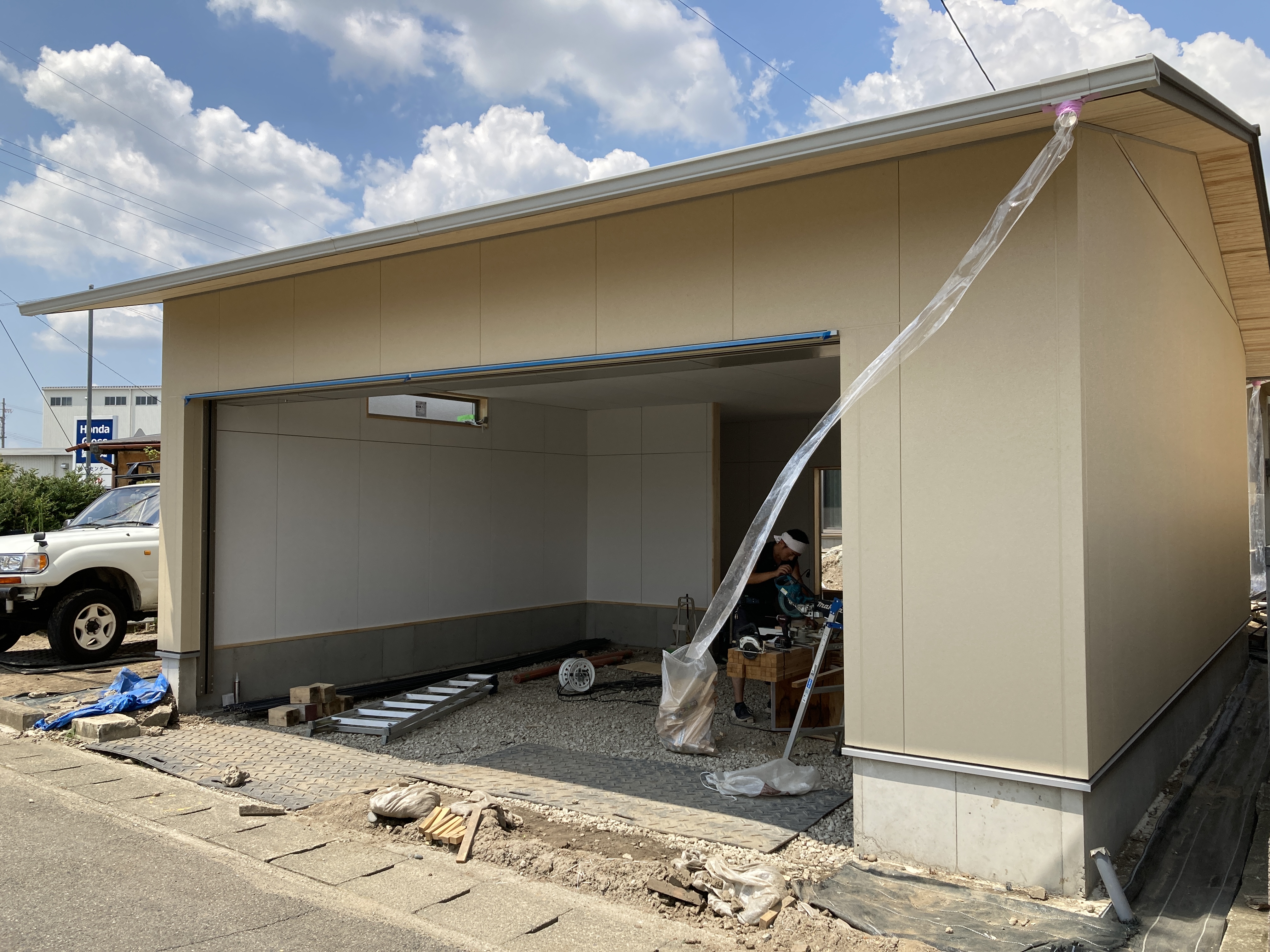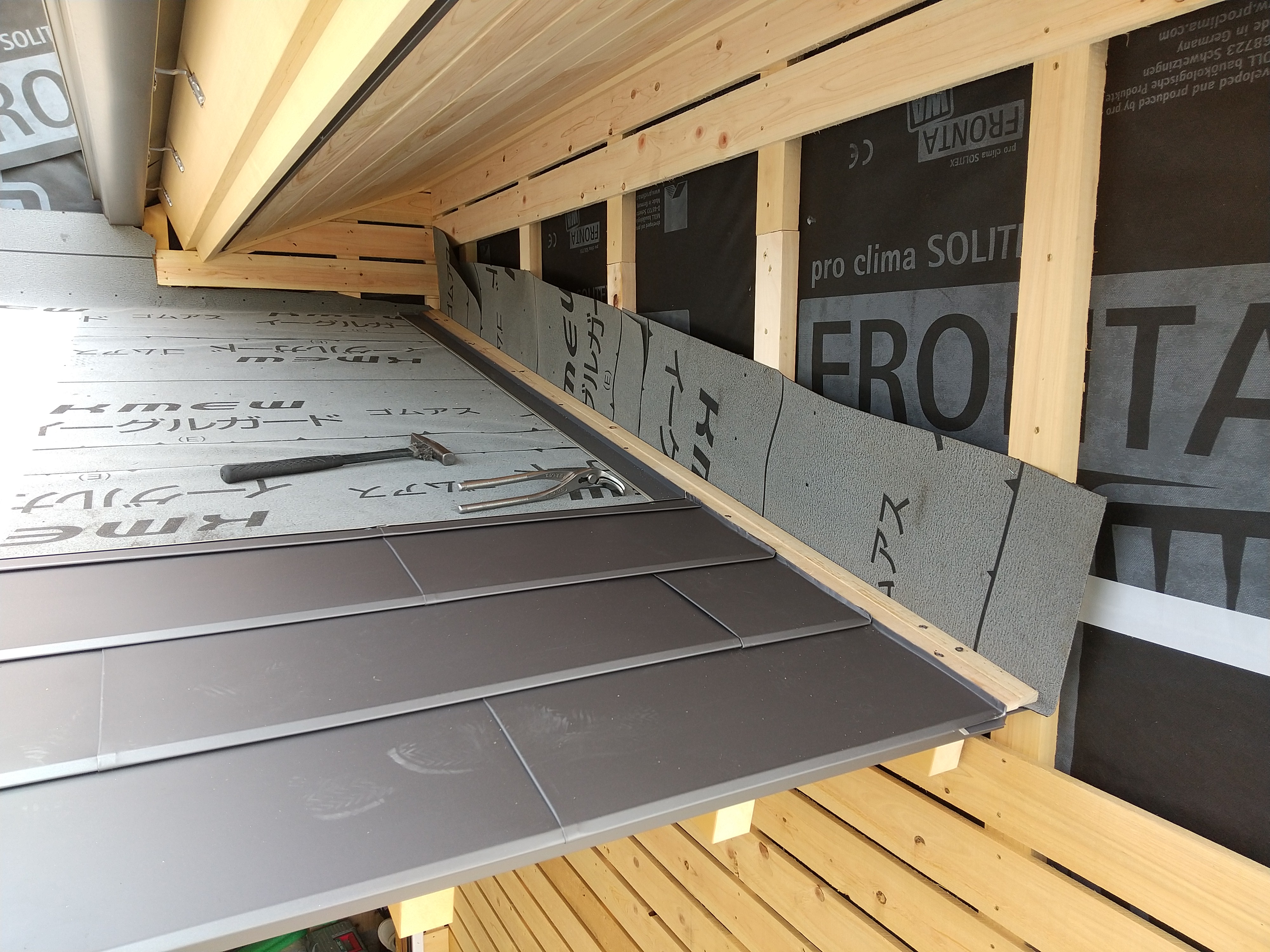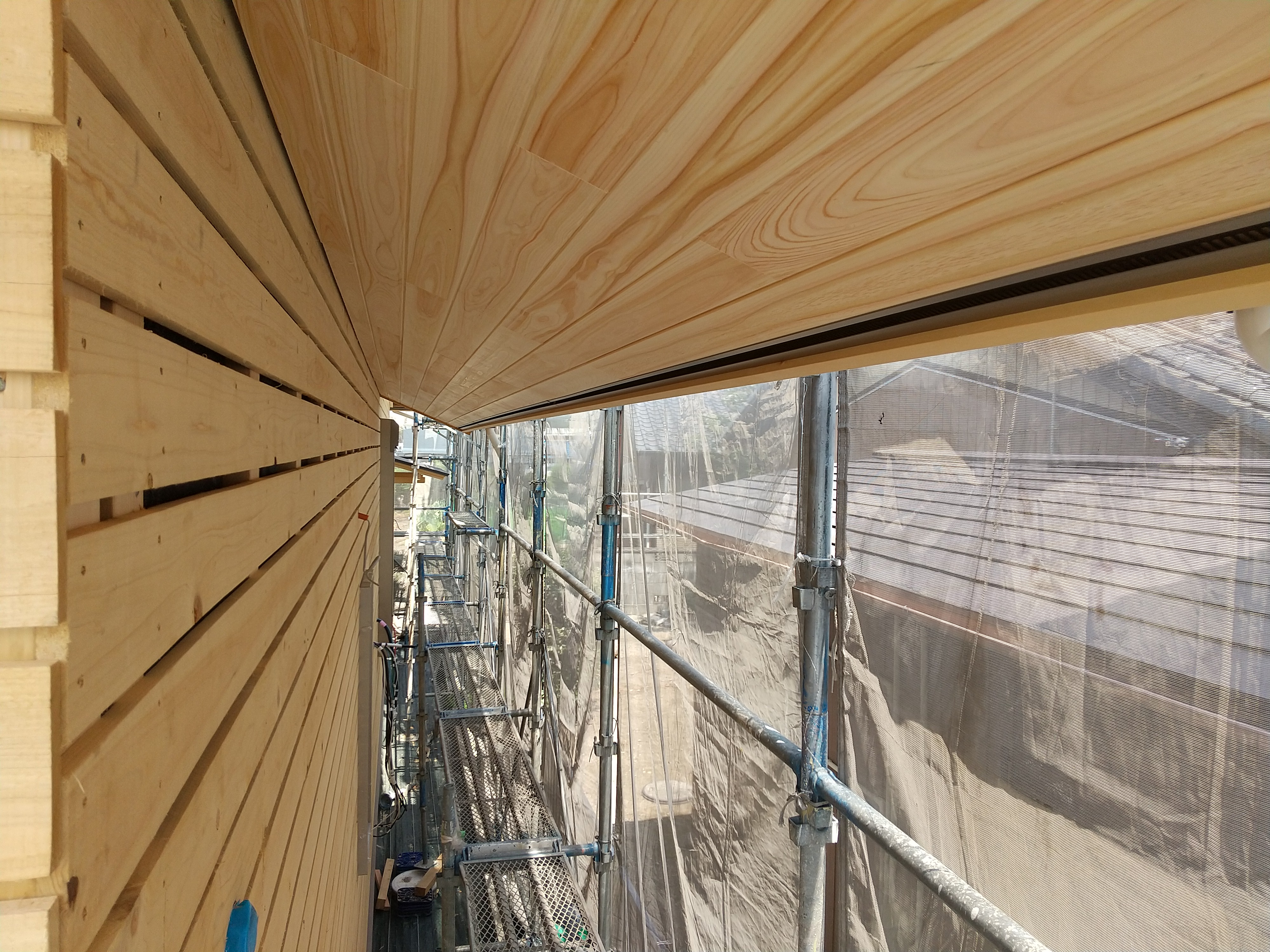 軒裏の羽目板張りと屋根工事が完了しています。今回は車庫なので、コストを抑えつつ見た目も考慮して、羽目板は杉材、屋根材はガルバリウム鋼板横葺きにされました。軒裏を羽目板にするだけで、雰囲気が良くなりますね👍