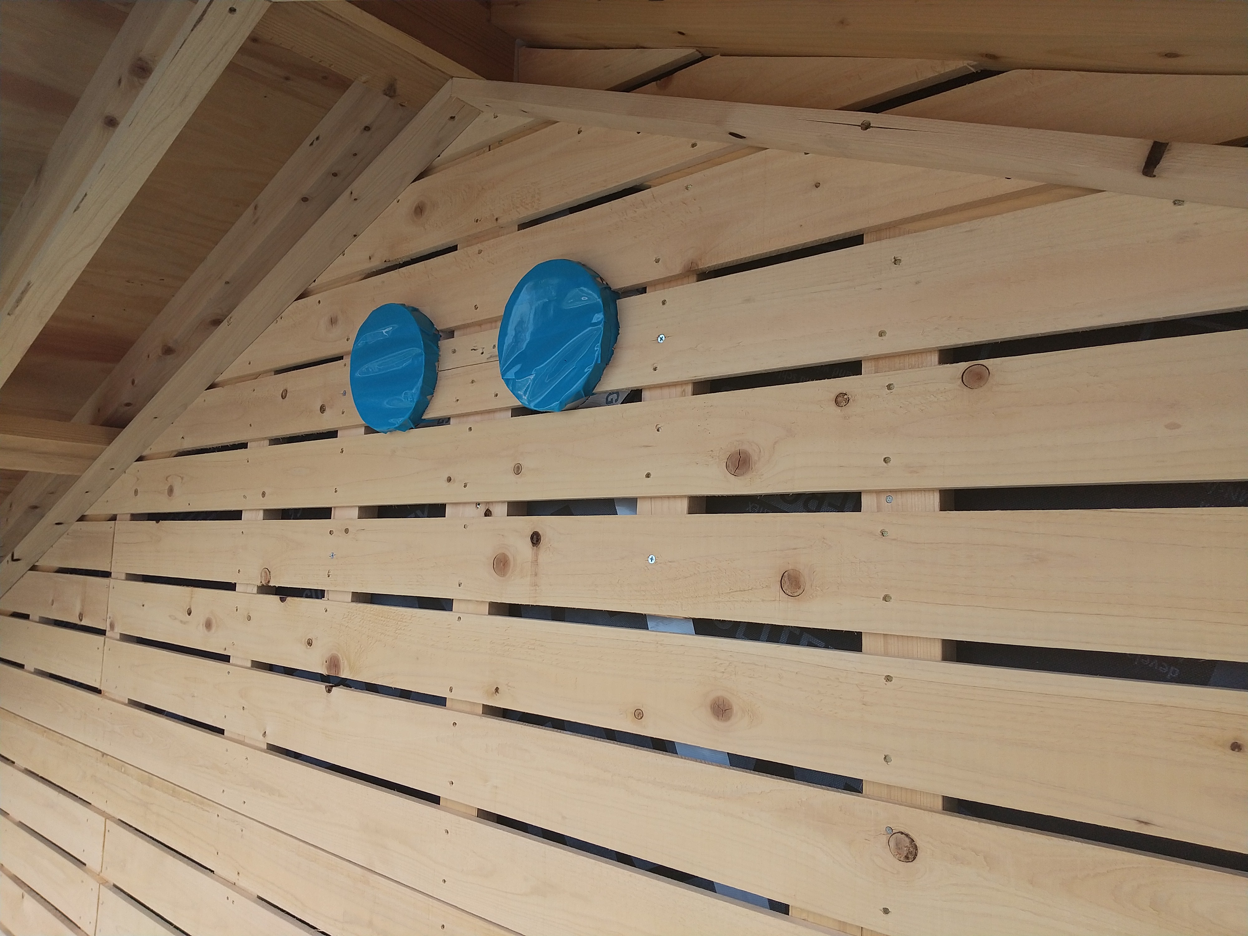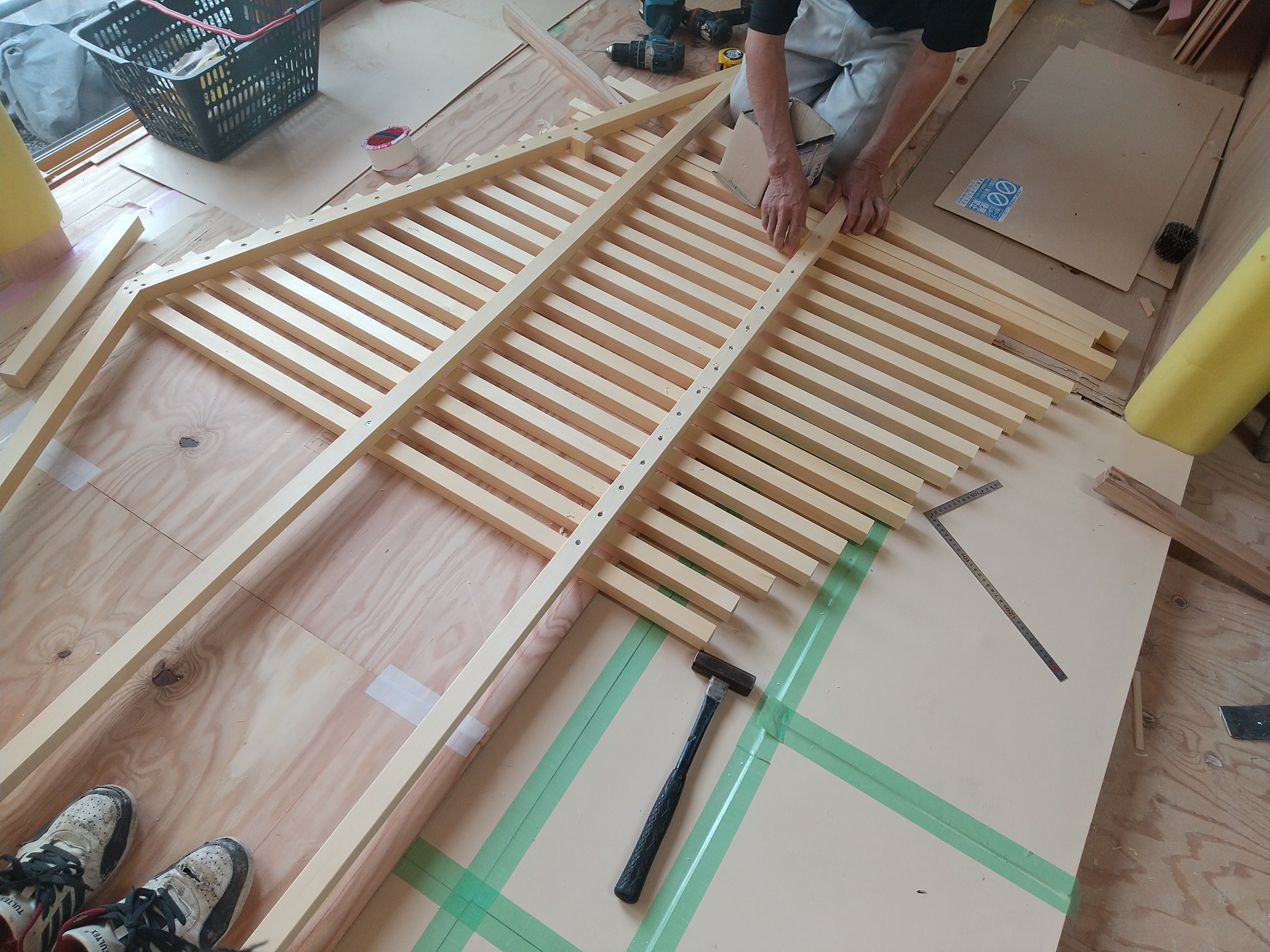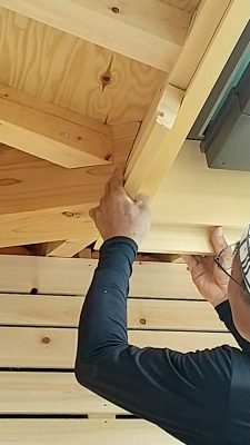 二人が作業をしている中、ちょこっし小屋裏を覗くと、妻側からいい風が吹き込んできていました。均等に配列された垂木に光があたり、お昼寝したくなるような心地いい空間です。(またまた、皆さんにそう思ってもらえない撮り方ですね、がんばります)