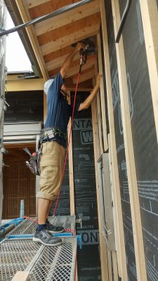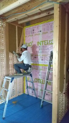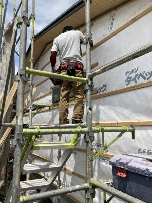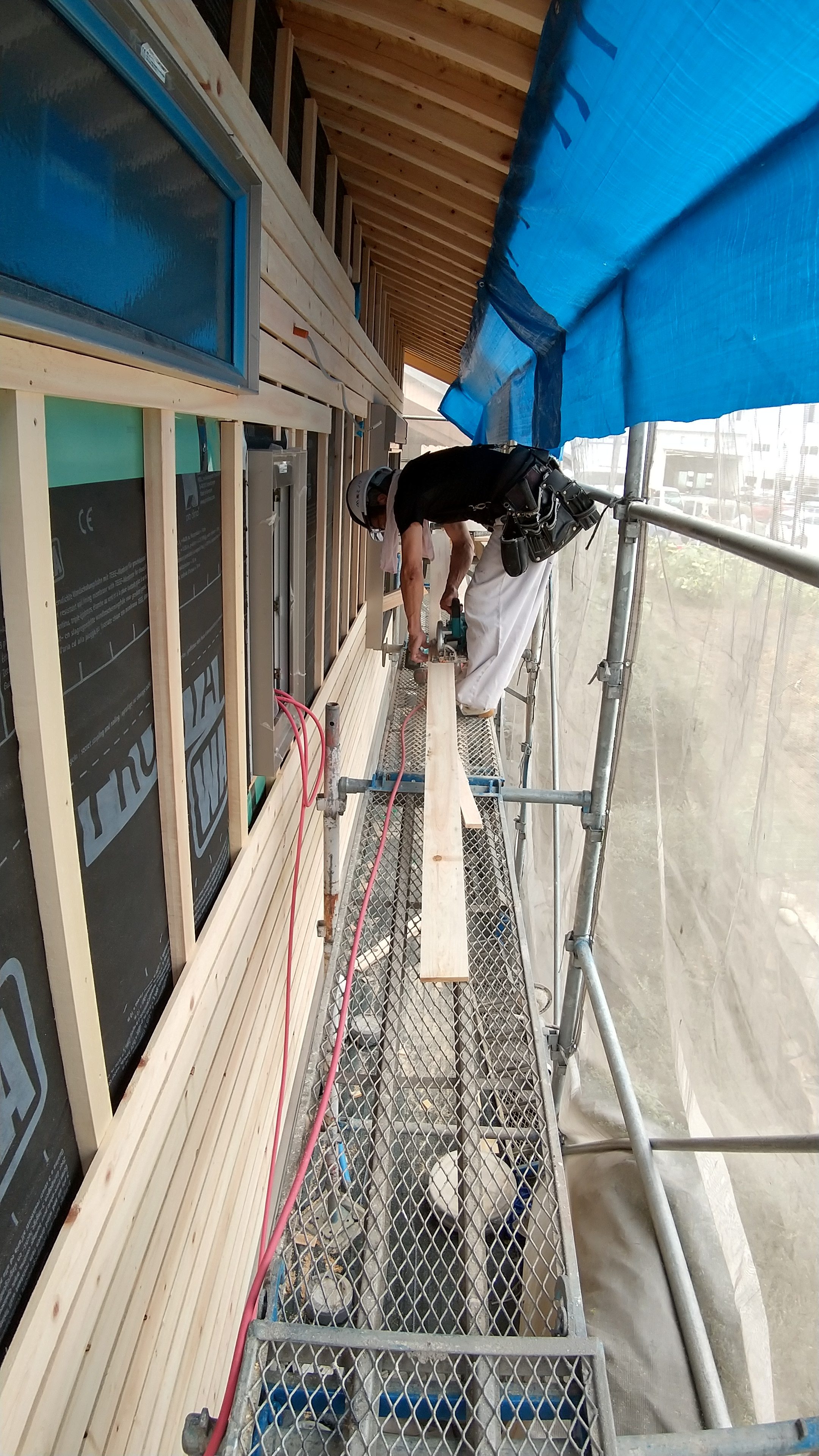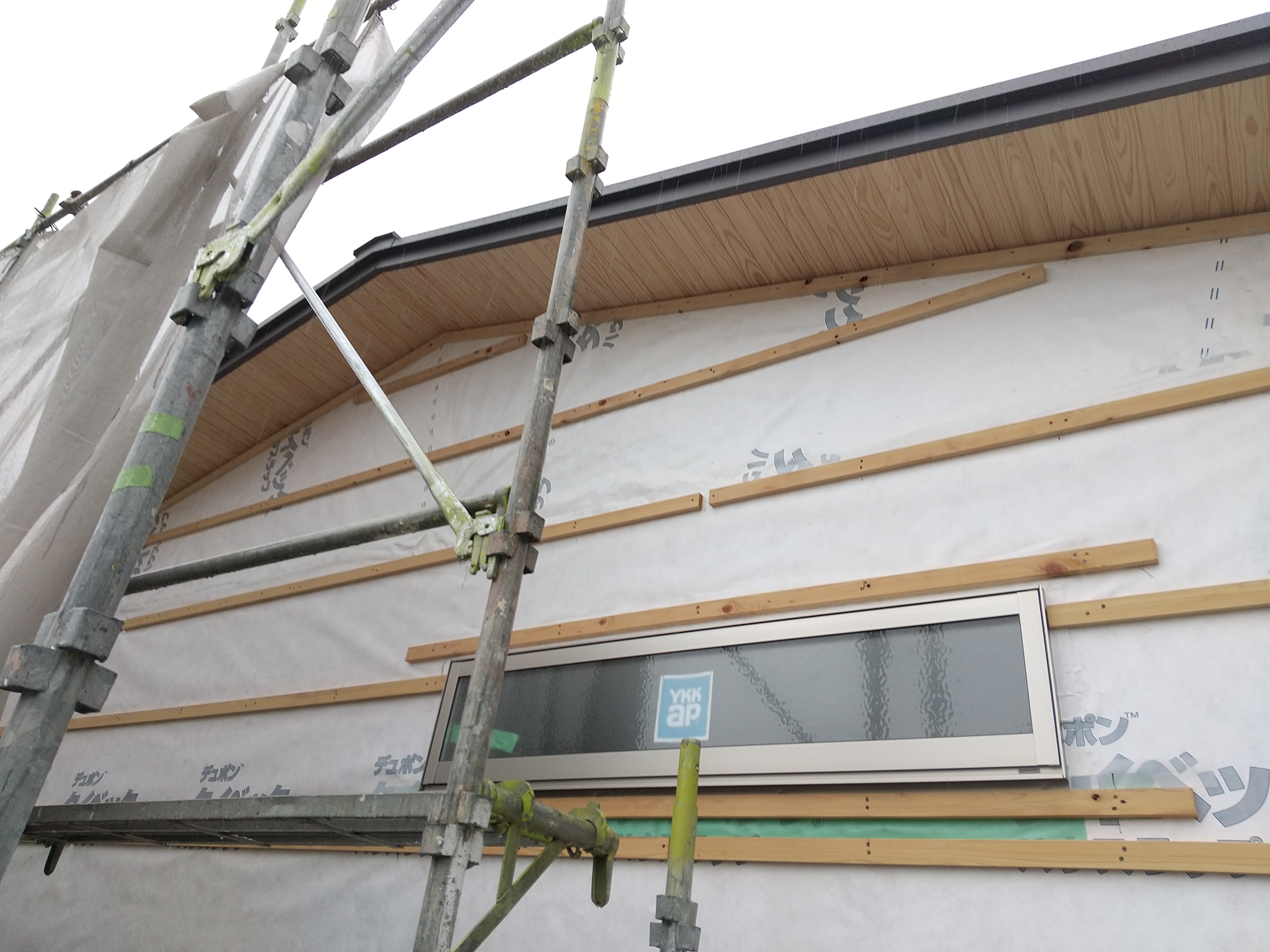 k棟梁とh谷川君も、ここぞとばかりに外部の仕事を進めています。i様邸は、付加断熱105㎜ですので、30×105のタテ下地を取り付けています。