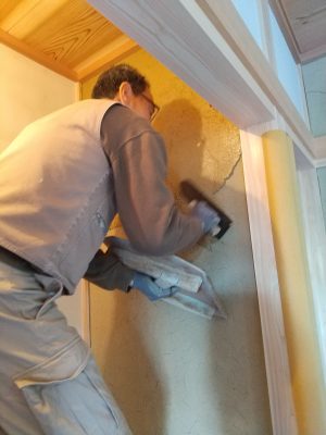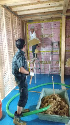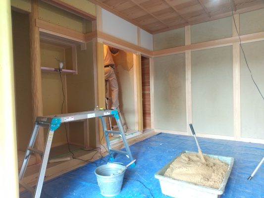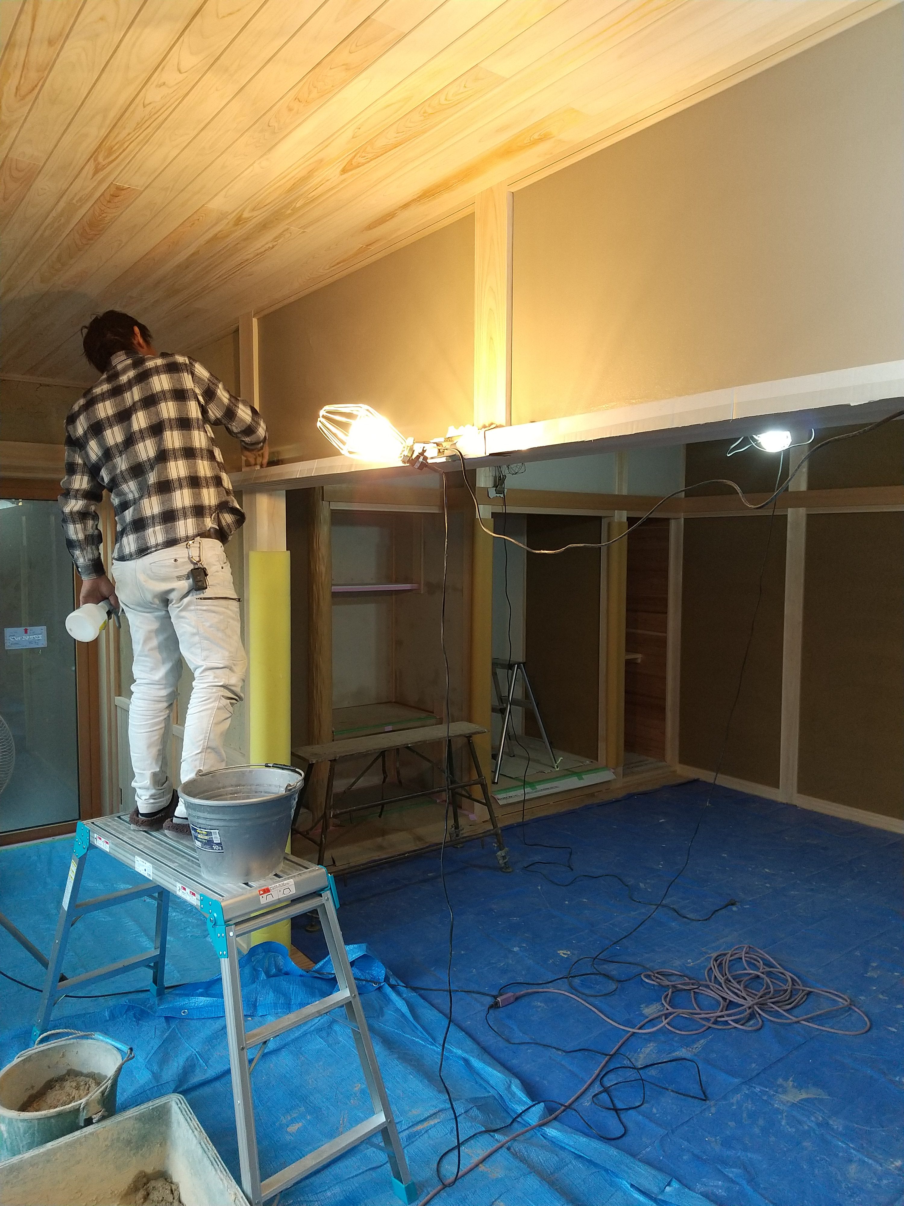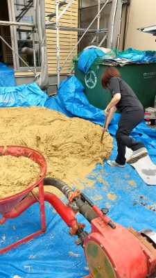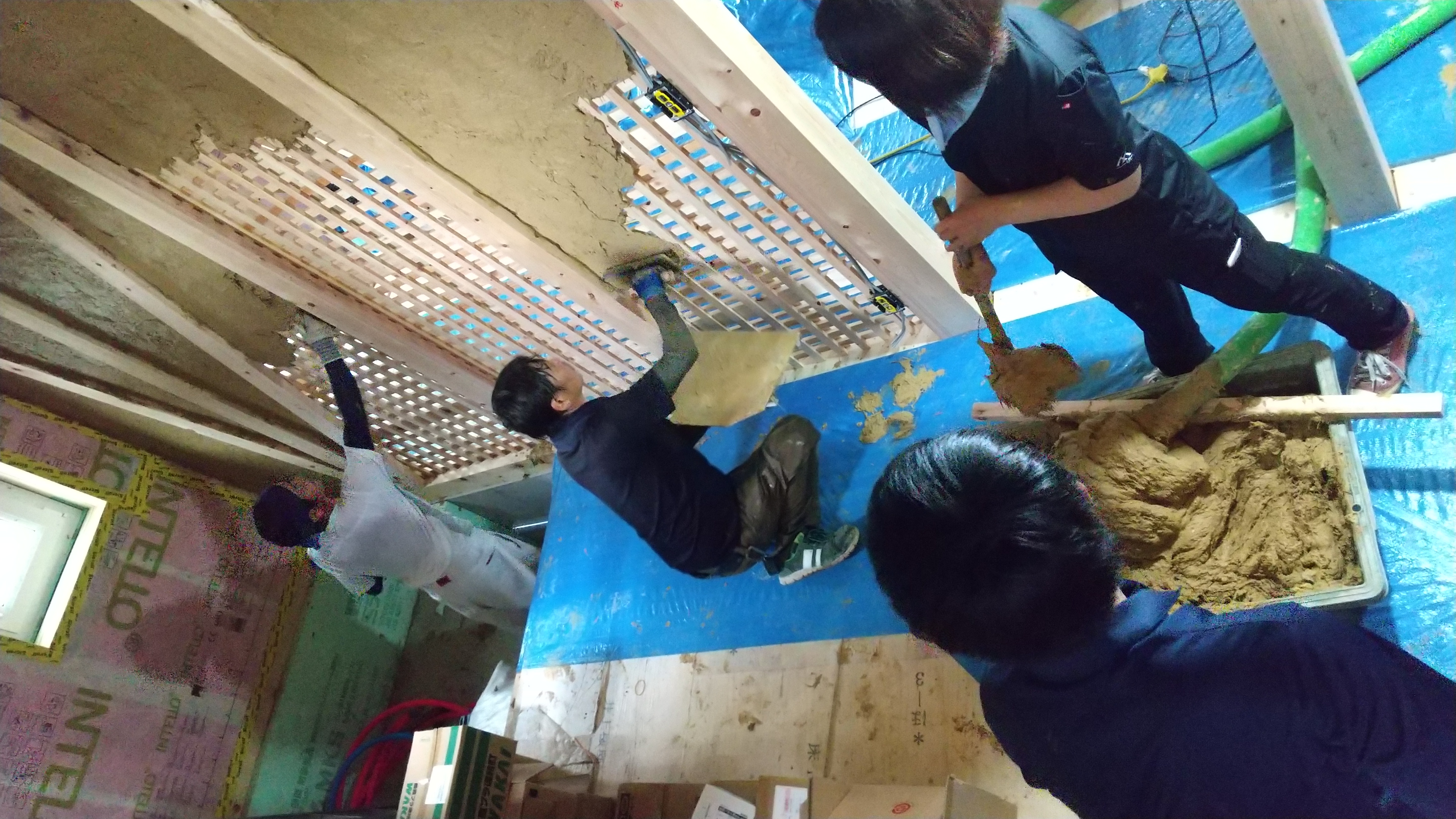 あちらこちら塗る場所があるのもあり、a監督だけでは3人の職人さんを捌き切れず、m紀さん、h谷川君も作業に参戦。土が乾いてしまうので、急いで塗り進めていきます。ところで、m紀さん、すっかり作業のメンバーですが、取材は大丈夫?