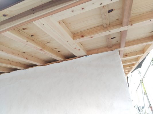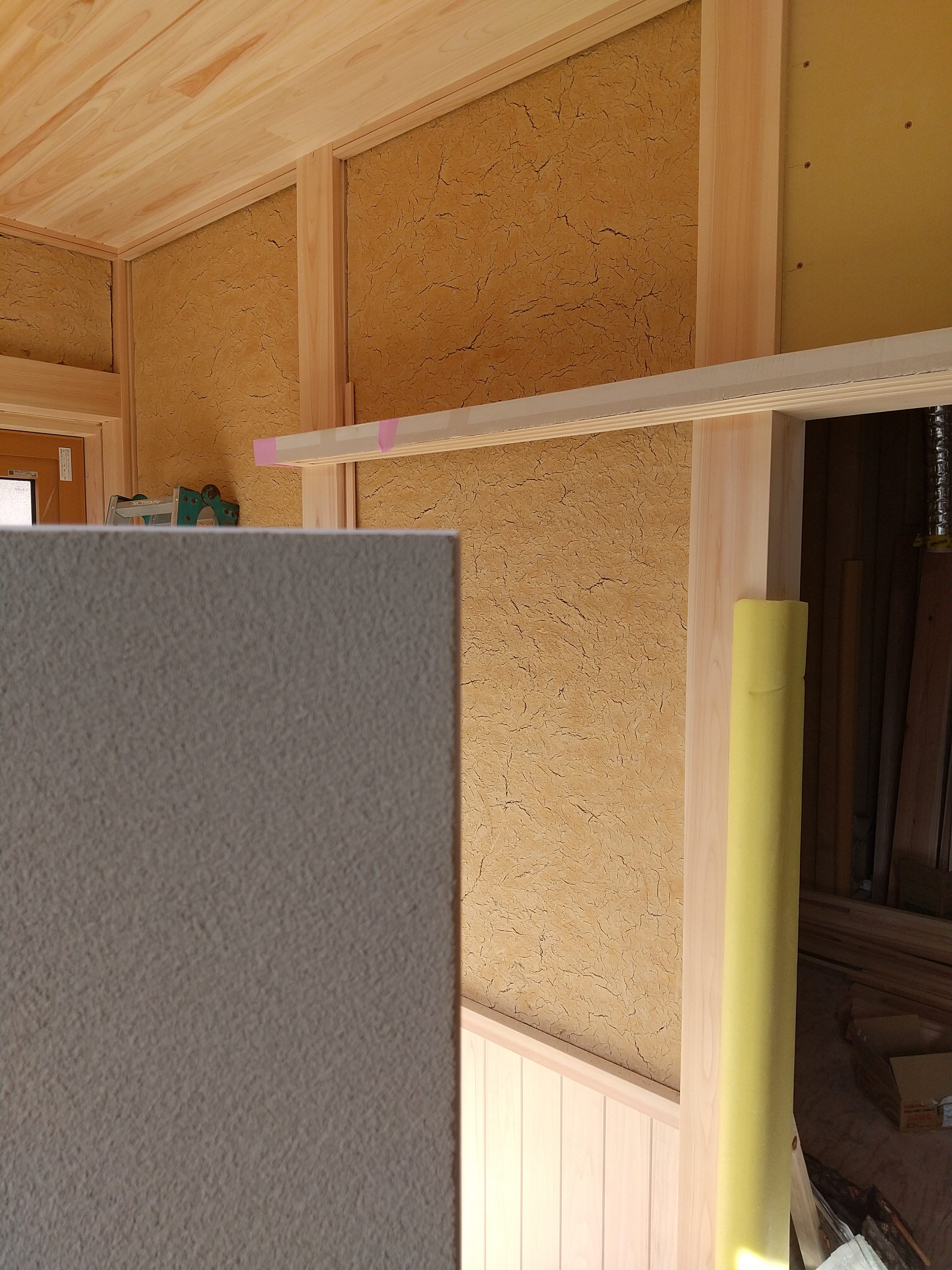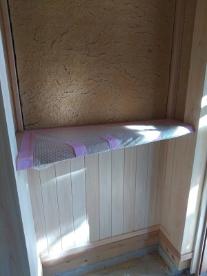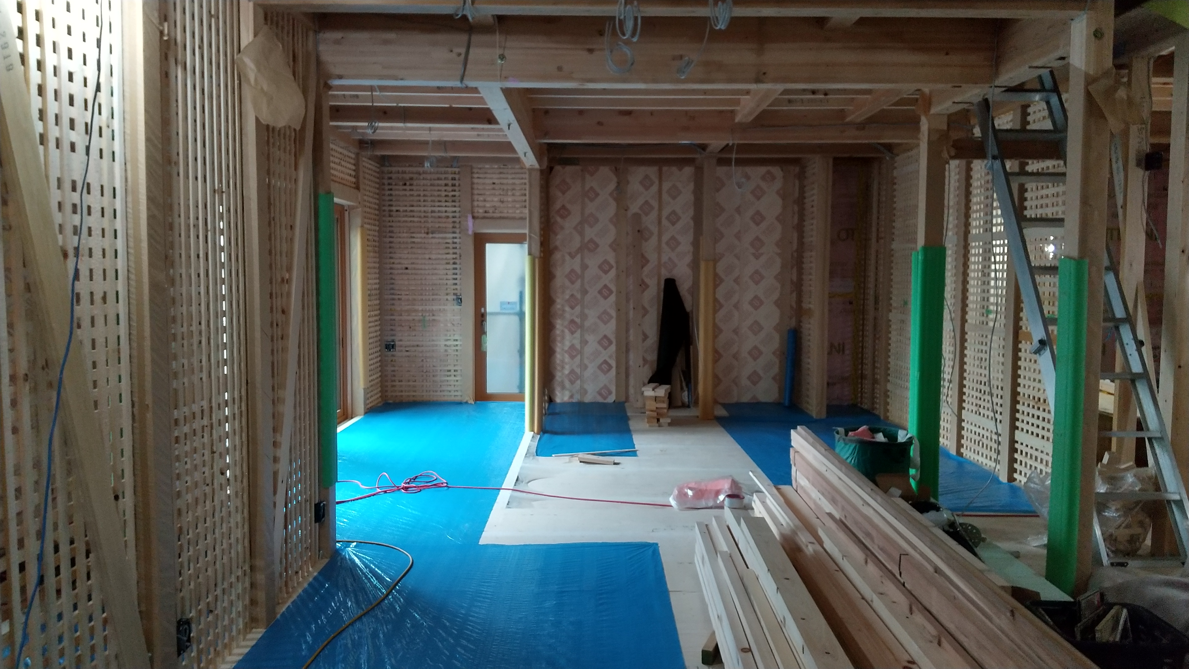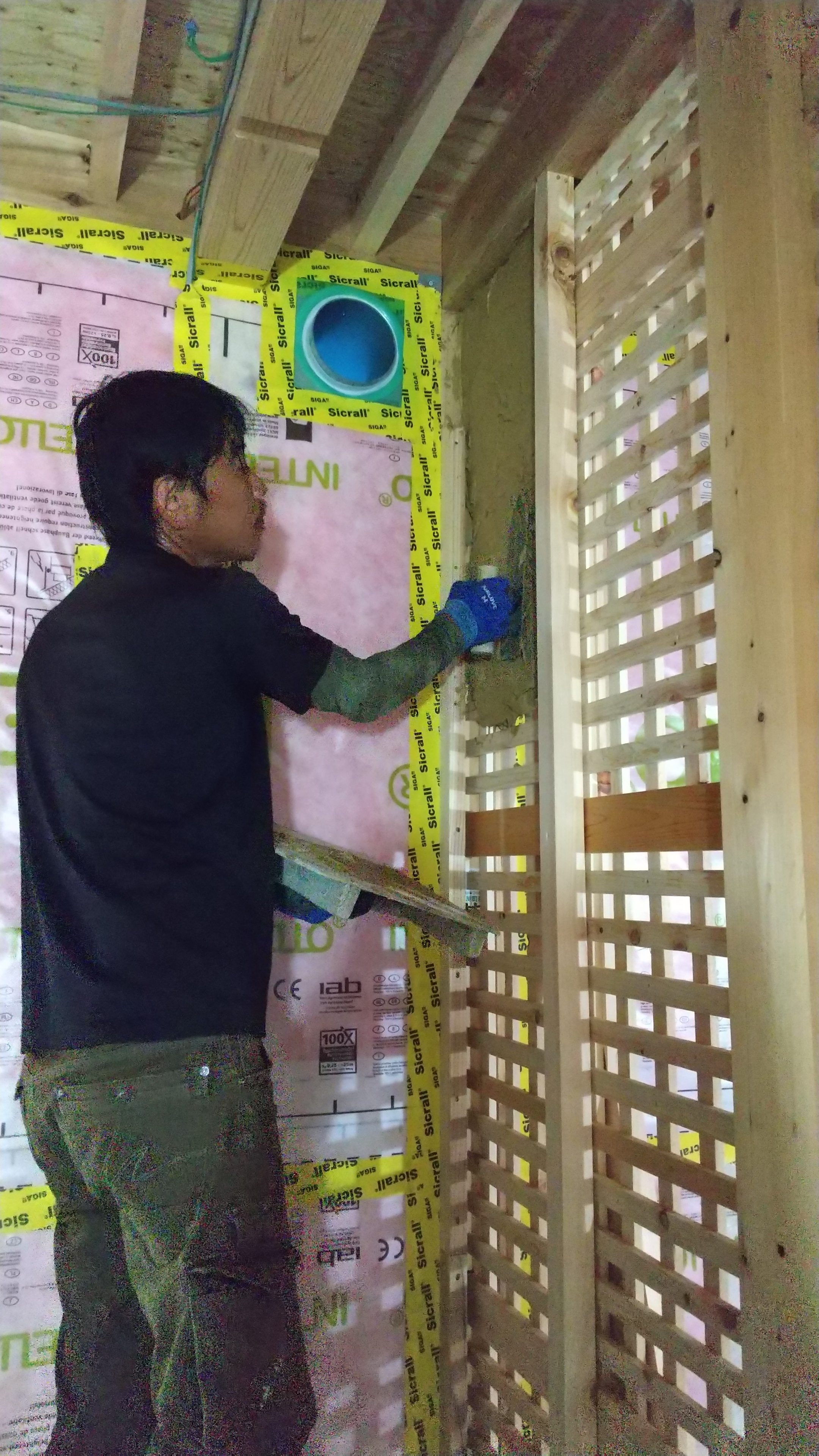 小舞はすべて取り付けられました。真壁となる外壁は、厚みが必要なグラスウールの充填断熱ができない為、薄くても断熱性能が高く燃えにくいフェノール樹脂製の断熱材を充填、その上に気密シートを張り、小舞を取り付けています。私は20年ぶりに荒壁の施工を見れるので楽しみです。
