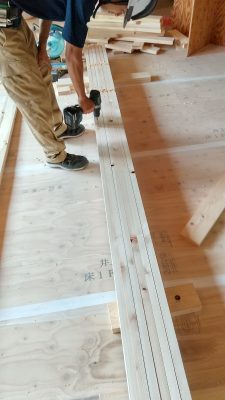 雨が降っていないので、h谷川君が来ています。k保木棟梁から、今回はこちらに駆り出してもらっています。k棟梁は、h谷川君が居ると元気な気がします。急いで通気胴縁と野地板の取付を進めています。