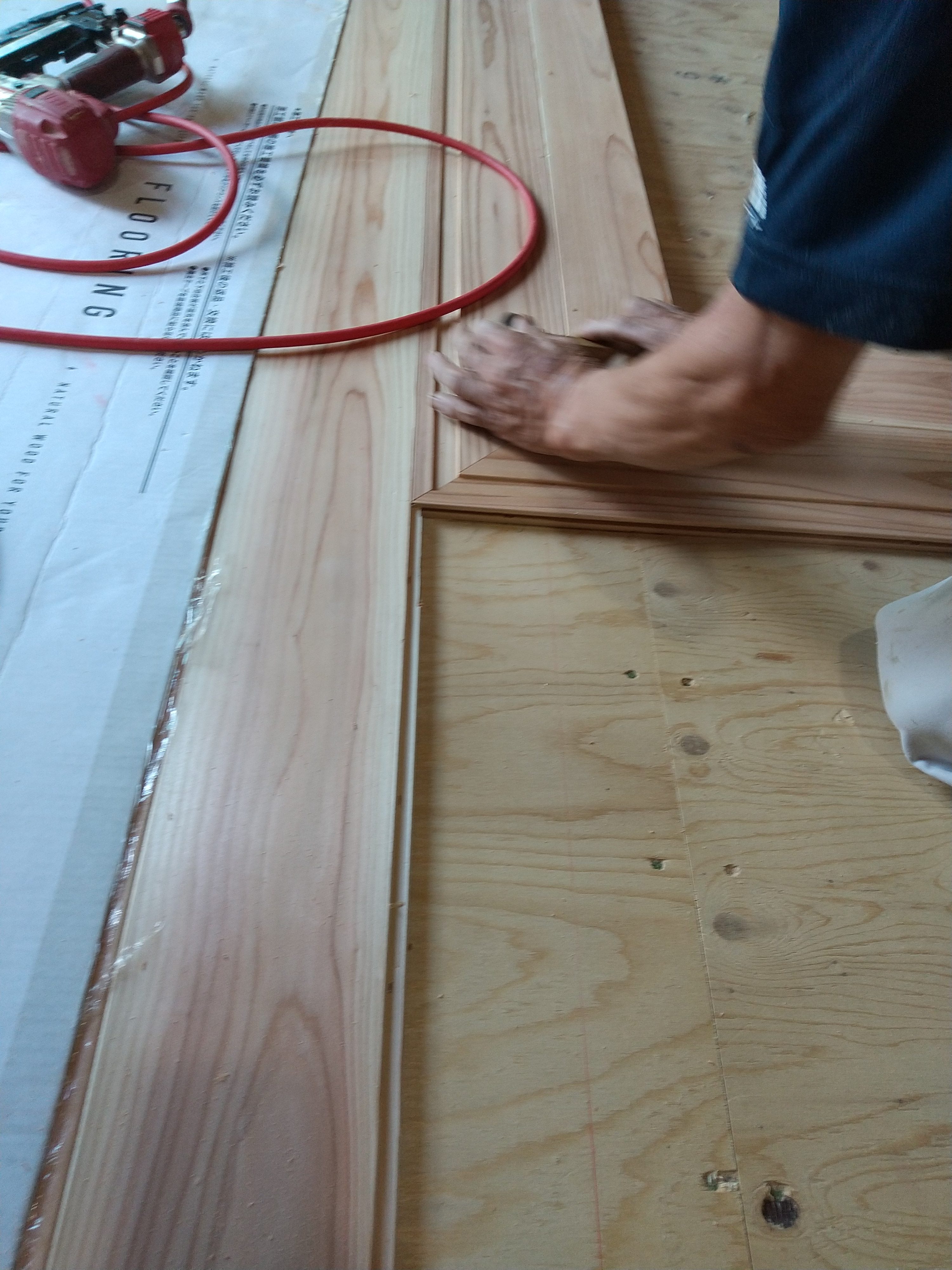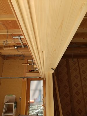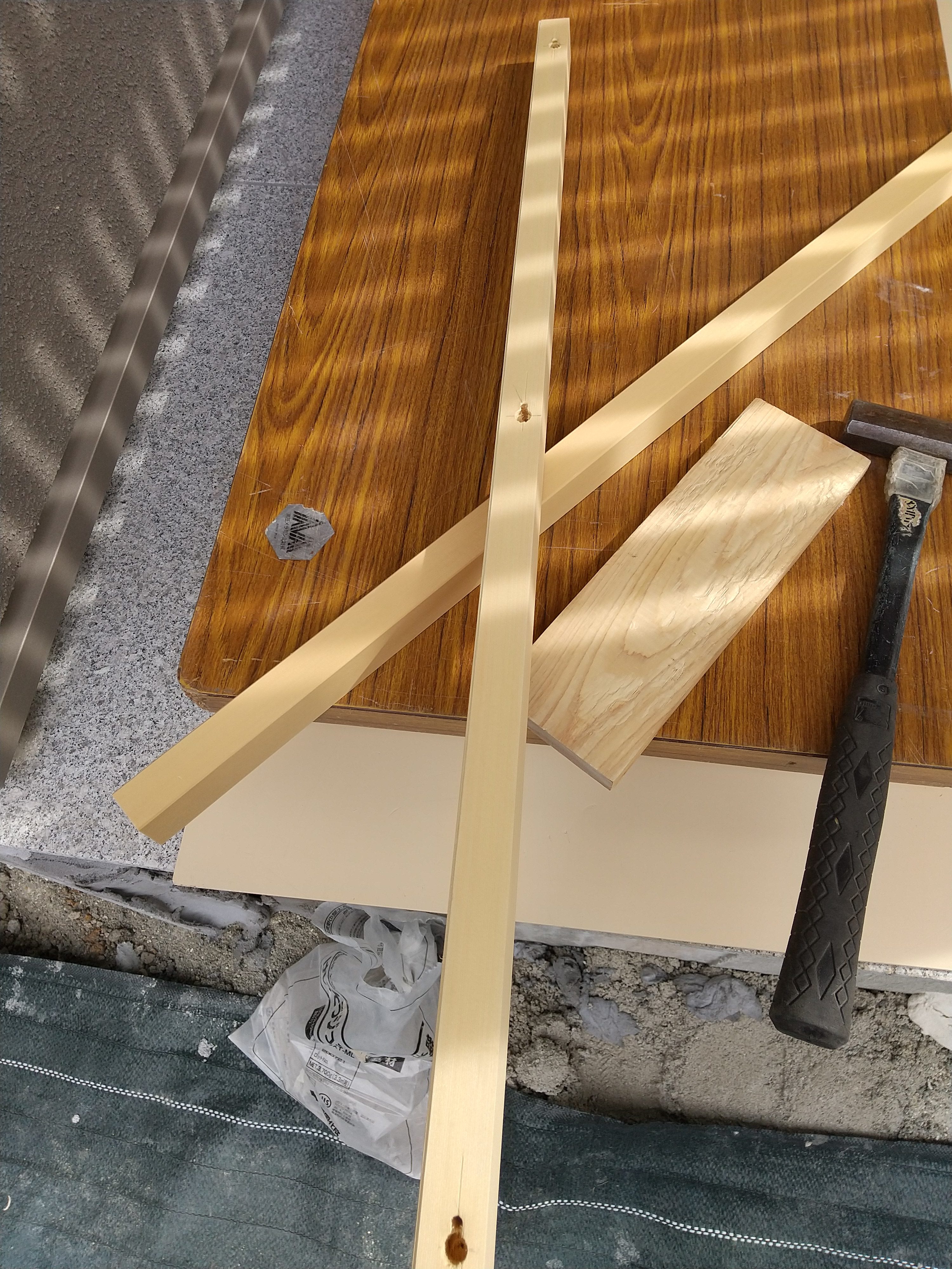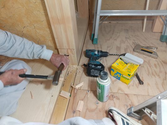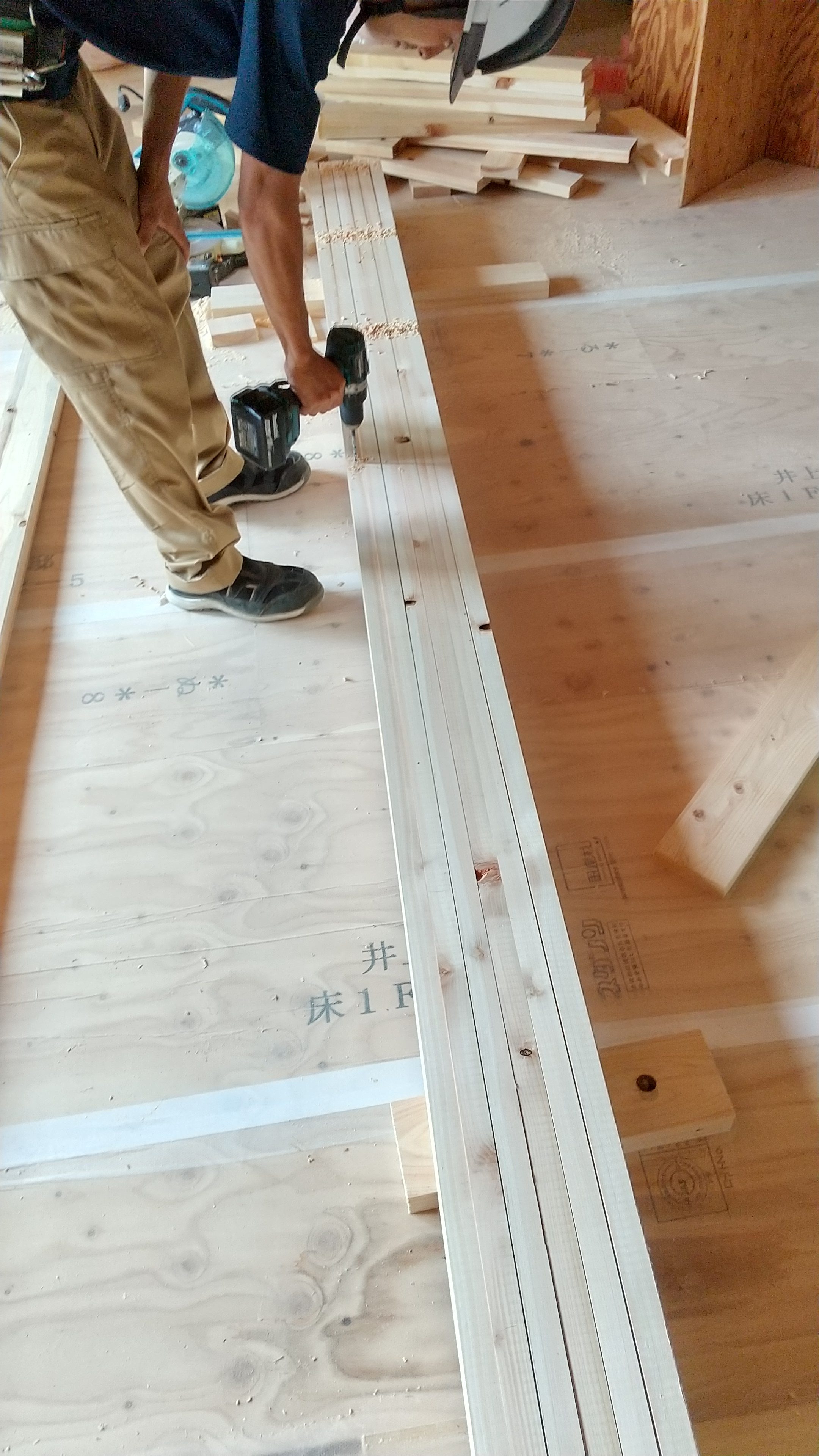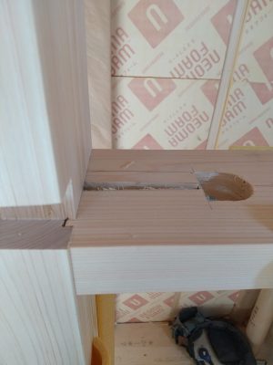 ゴミを拾っていると、sw大工さんに窓台下の間柱を木槌で入れてみてと、木槌をお借りしやってみました。上下交互に木槌を打ち、3本の間柱を嵌める事ができました。今日はもれなく筋肉痛ですが、楽しかったです。