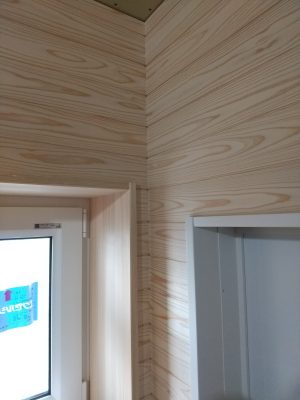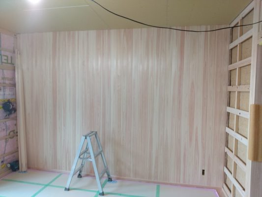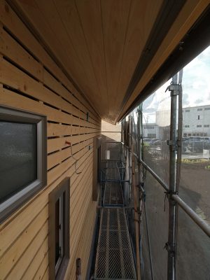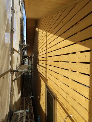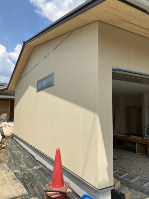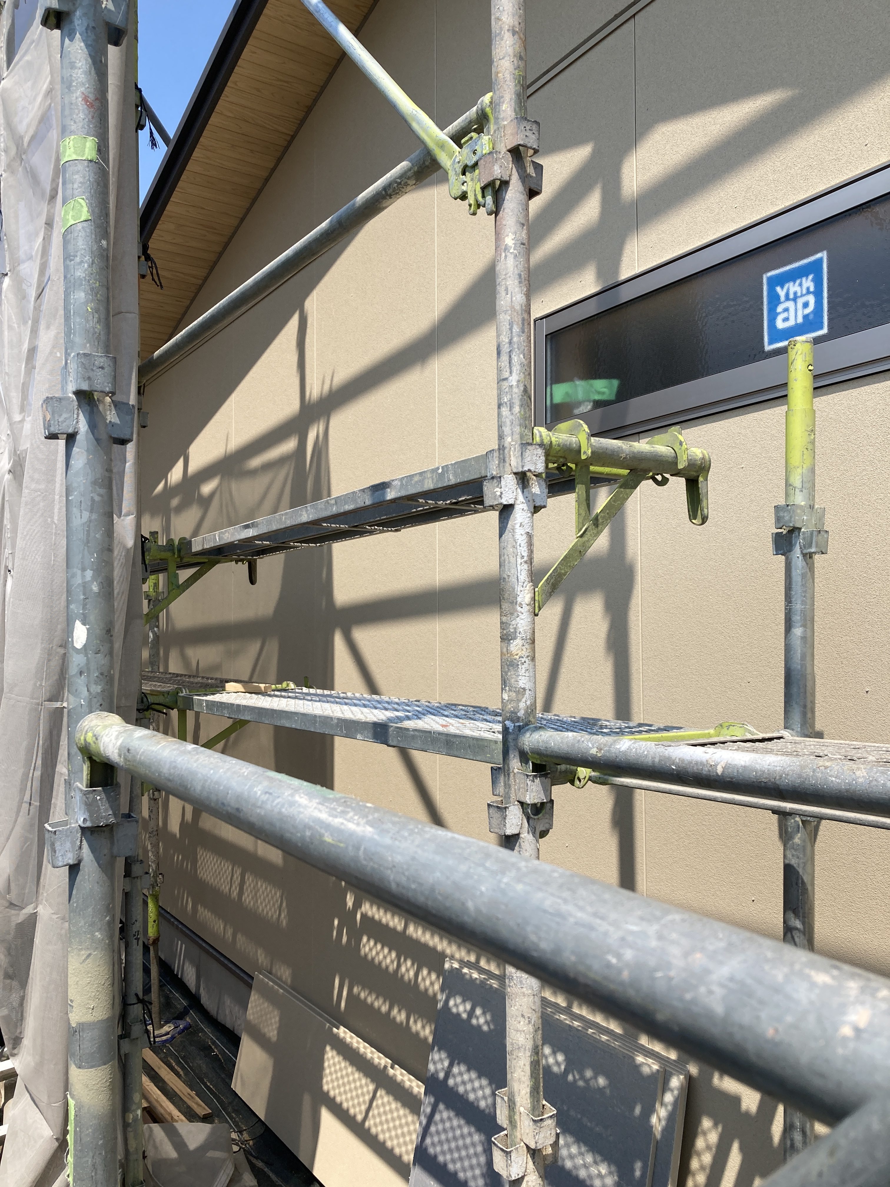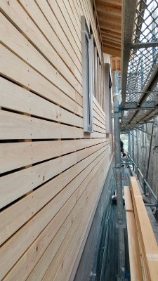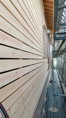 サイディングは2日で張り終えています。吹付柄の3×10尺板の物です。母屋の雰囲気に近くしたいけれど、コストも抑えたいと選ばれました。どんな感じになるのでしょうか、足場が外れるのが楽しみです。