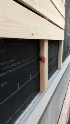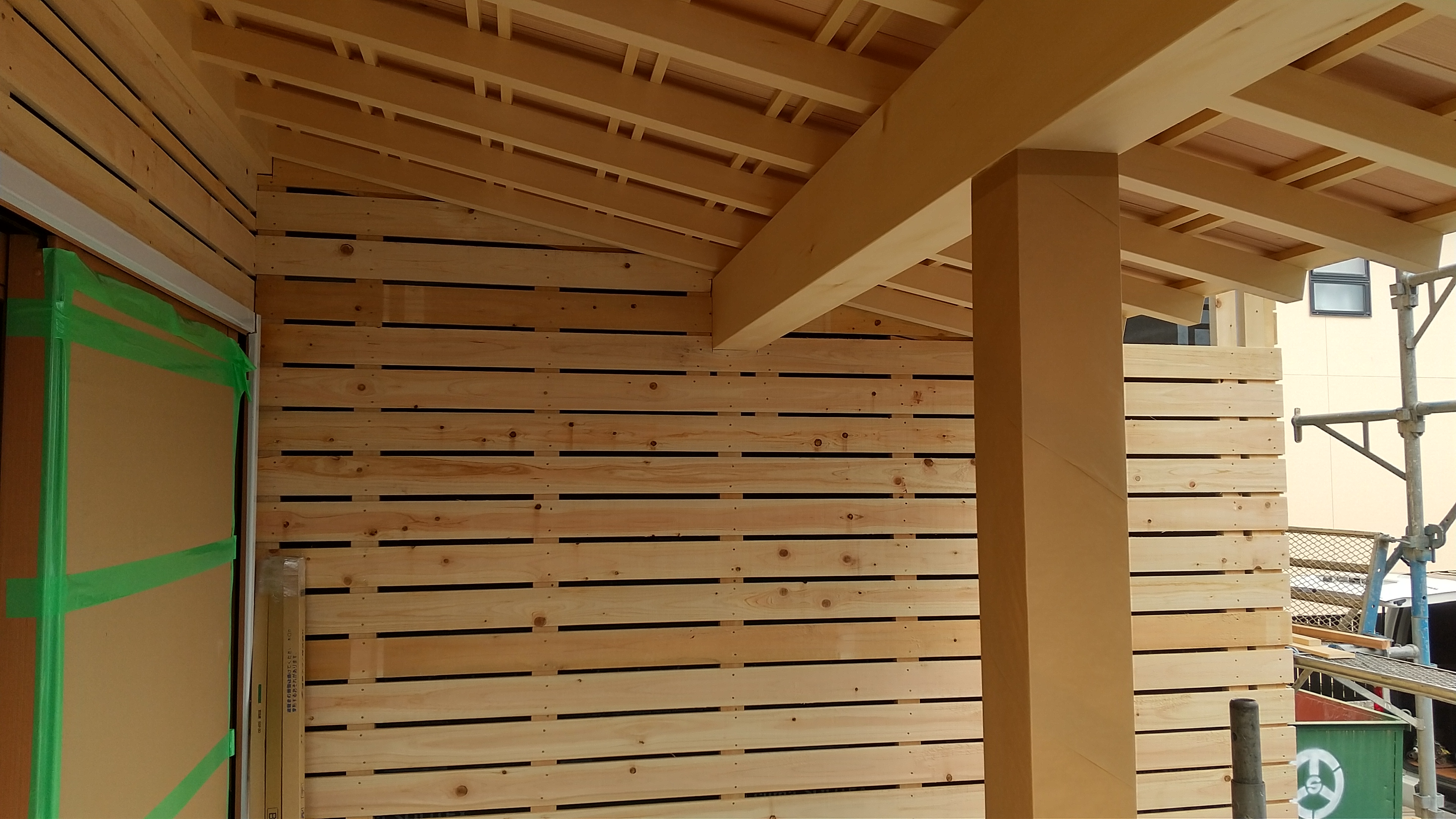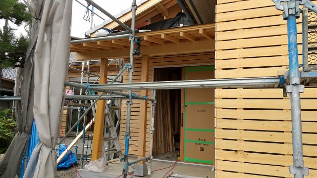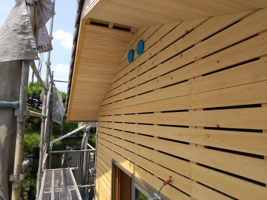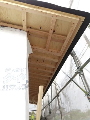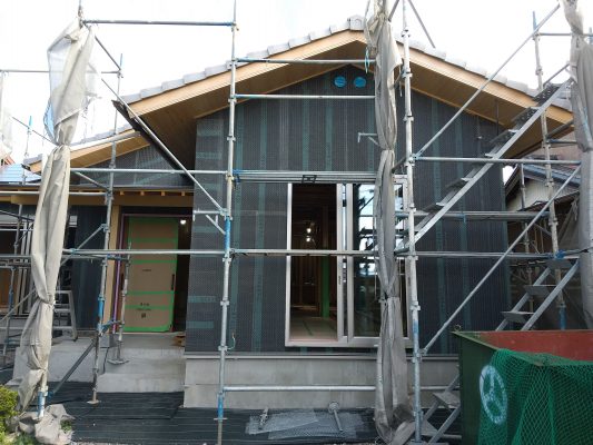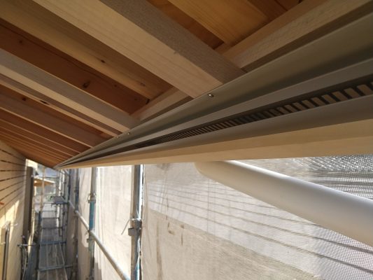 通気胴縁と野地板を張り出しました。付加断熱を一部ヨコ張りしていますので、野地板を留める釘が透湿防水シートを突き破る事が無いように、通気胴縁の厚みを30㎜としています。下地をタテにするかヨコにするかで、図面だけでは気付かない、いろんな事が違ってくるのですね。通気胴縁の下部には防虫網を取り付けています。見学会で「この下はどうなっているのですか?」との質問を受けますが、こうなっています。虫やネズミは入れませんので、安心です。