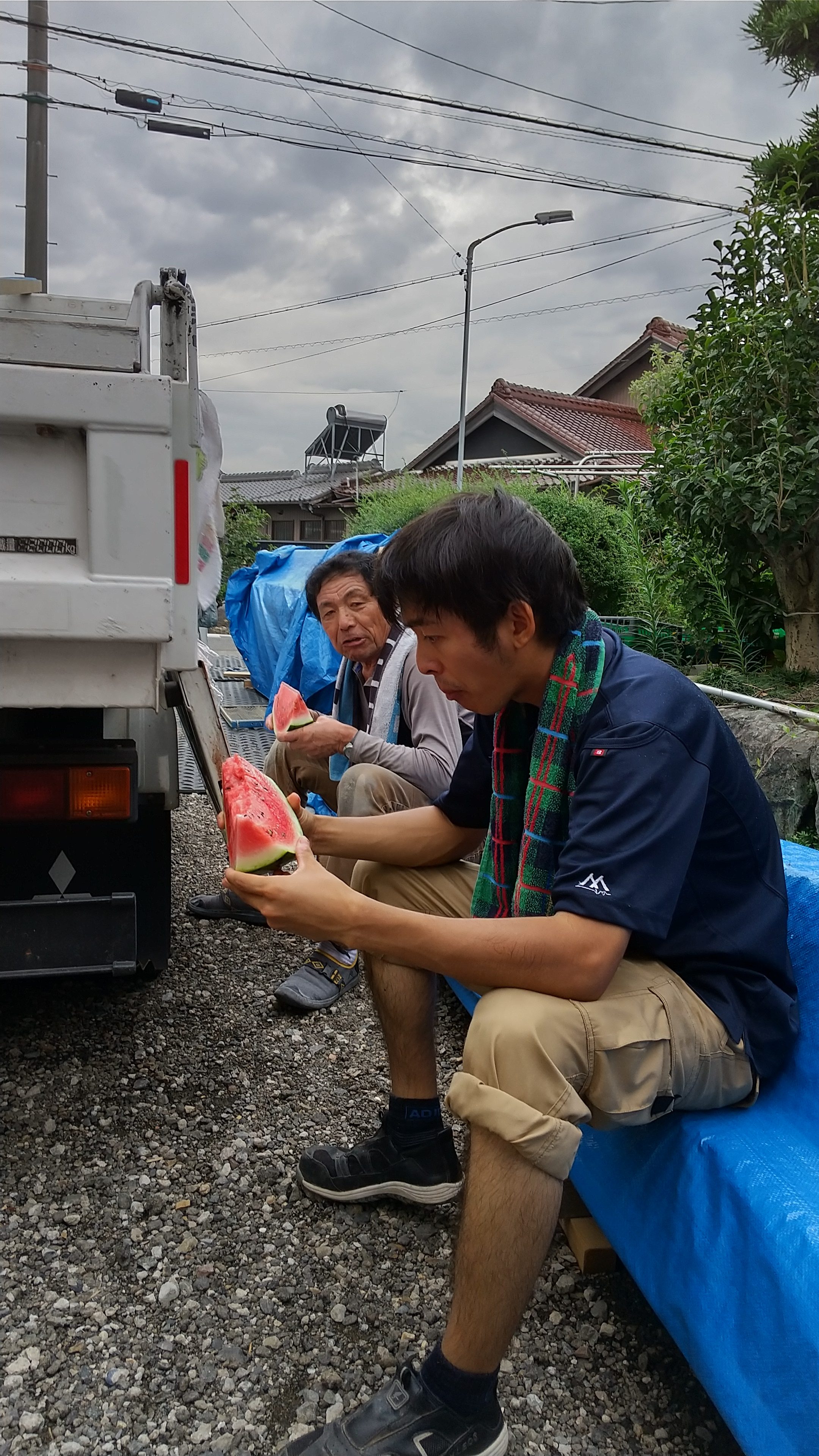 3時には、i様が作られたスイカをいただきました。甘くてとても美味しかったです。スイカは、カリウムが多く含まれており、疲労回復や夏バテ解消に良いそうです。k棟梁に伝えると、「なんだか体が軽くなったわ~」って。h谷川君もいるし、今日はお調子がいいようです👍