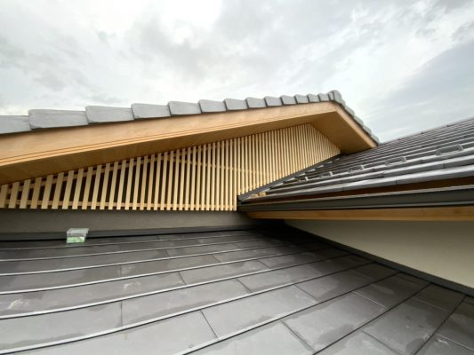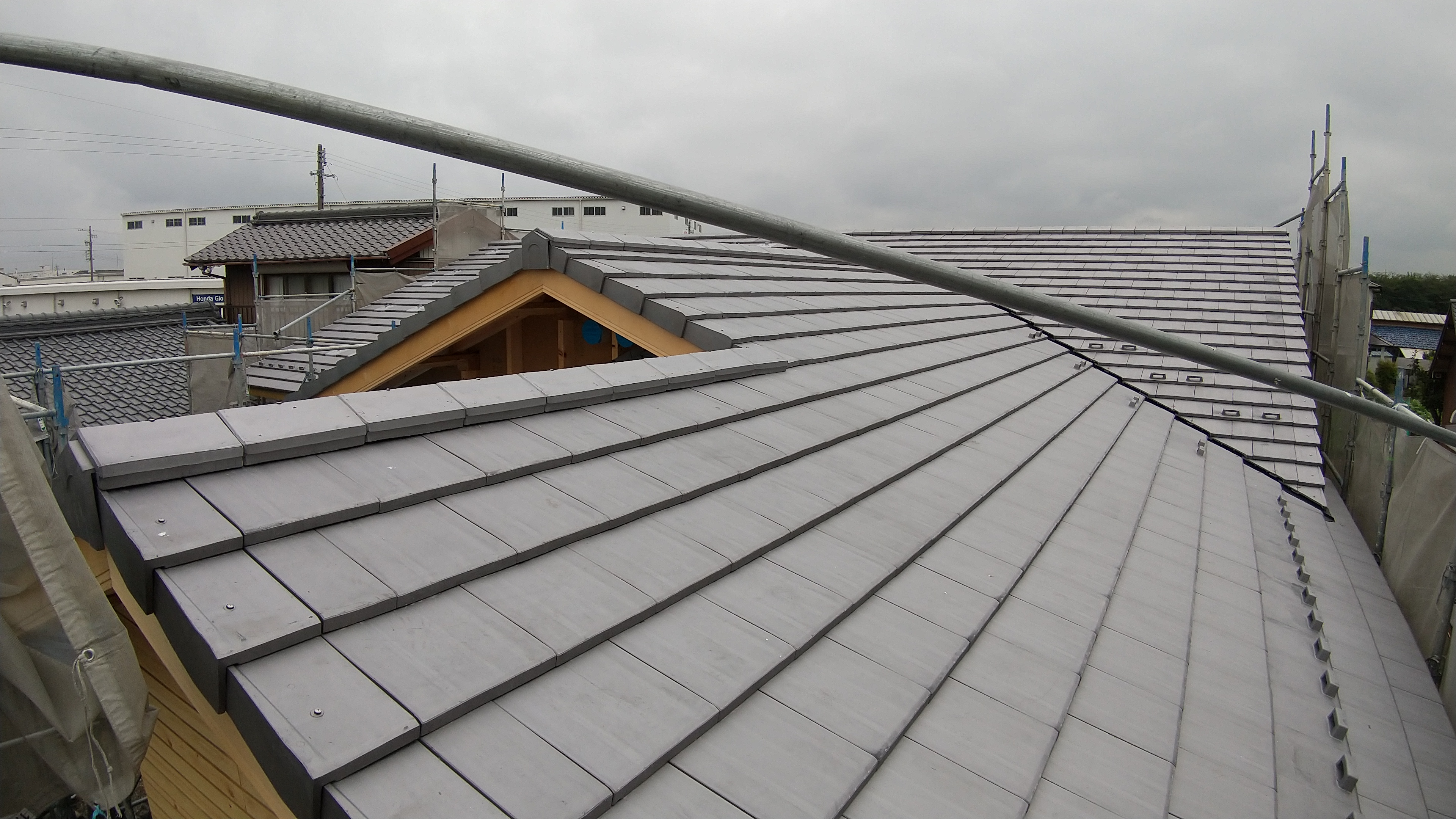 i様のお宅は平板いぶし瓦です。いぶし瓦は、高温で焼き上げ、燻化される事により銀色の炭素膜で覆われた瓦です。年月を経ると色ムラができ、それがまた素敵です。無垢材と共に経年変化を楽しんでいただけます。