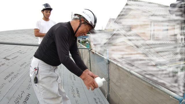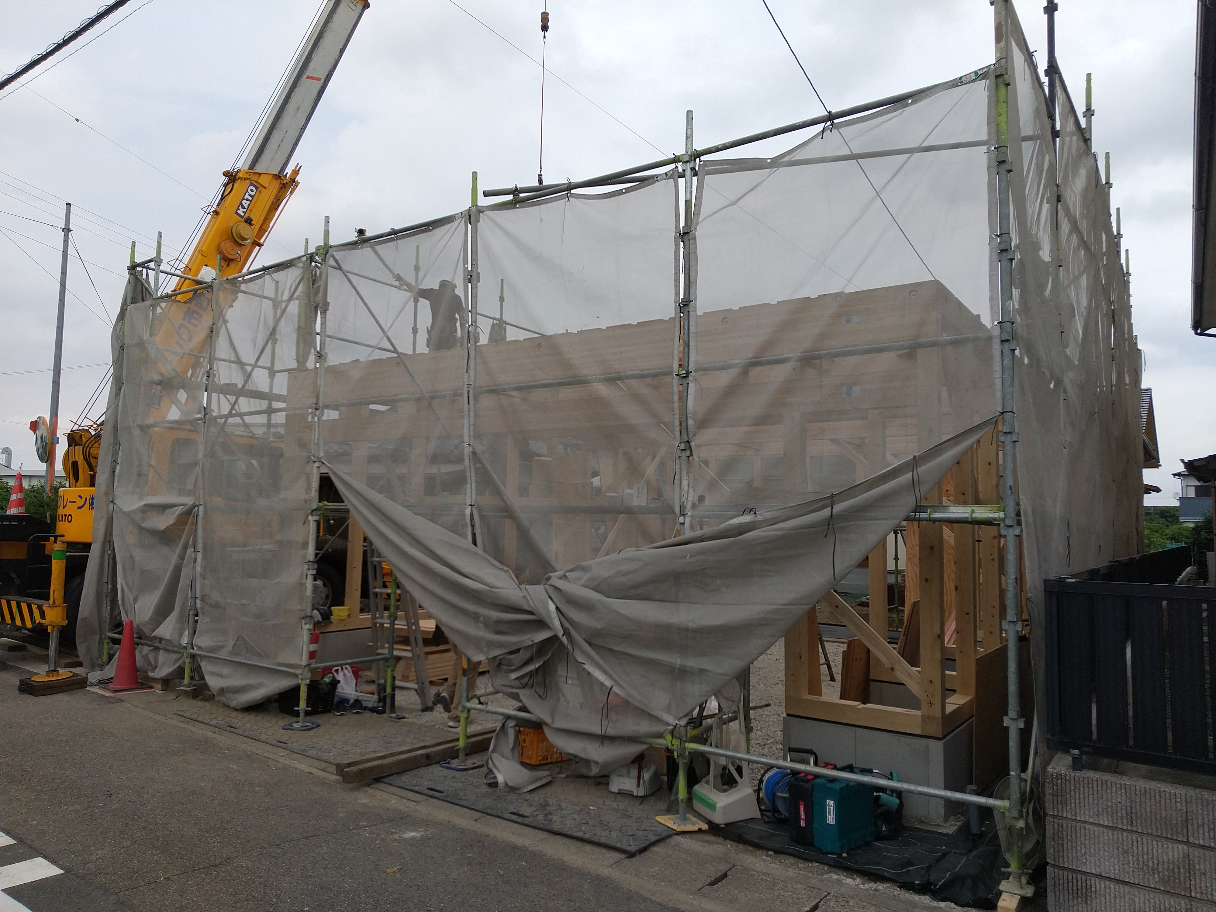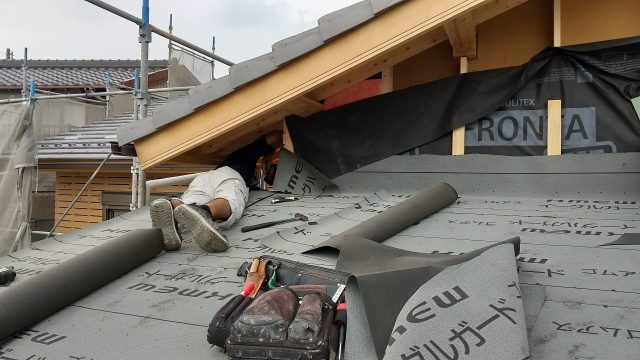 引っ張りだこのh谷君も、今日の大雨予報に向けて、付加断熱の上から透湿防水シートを施していました。梅雨明けはもうすぐでしょうか?瓦屋さんも、小雨の降る中頑張っています。