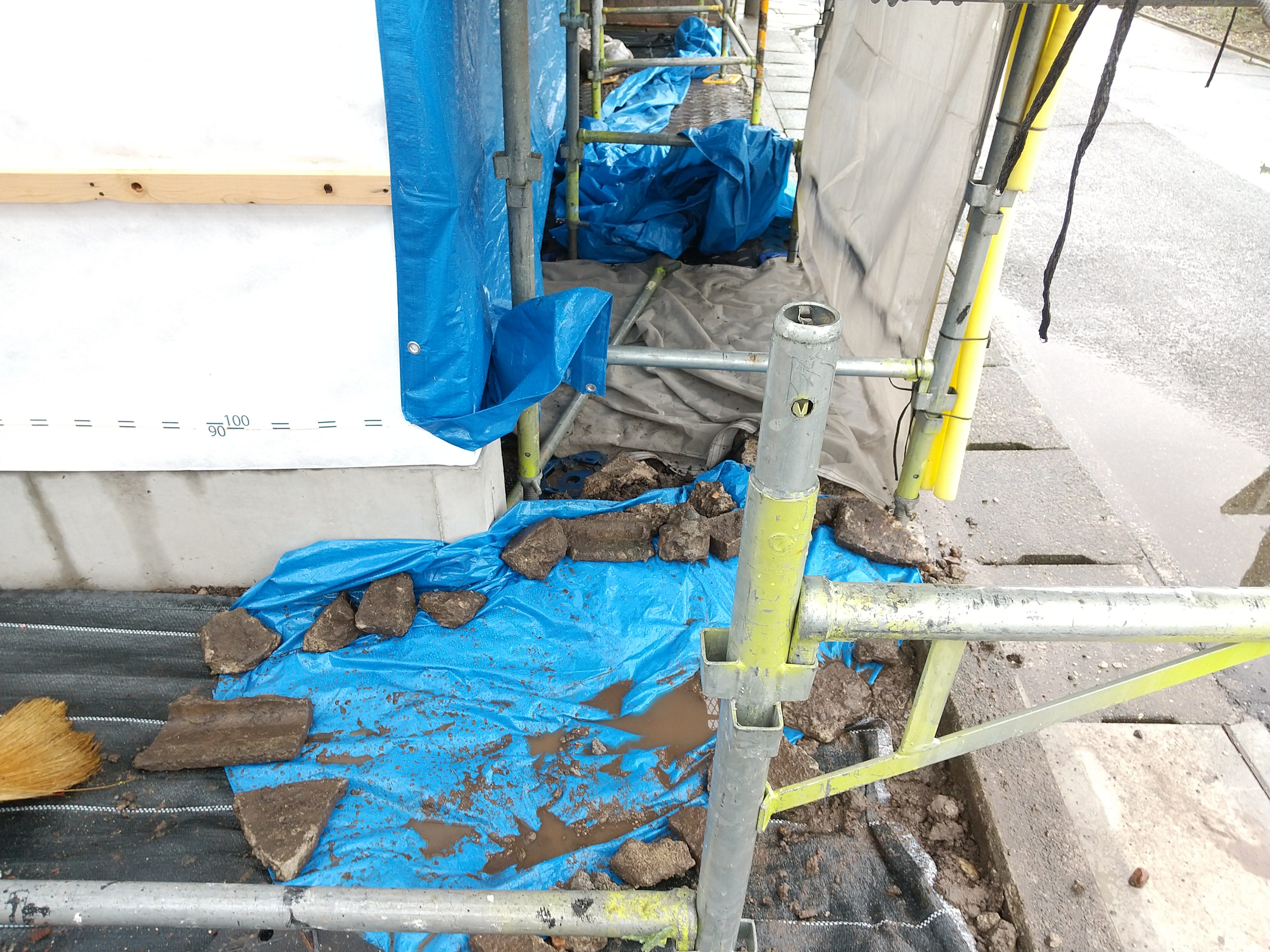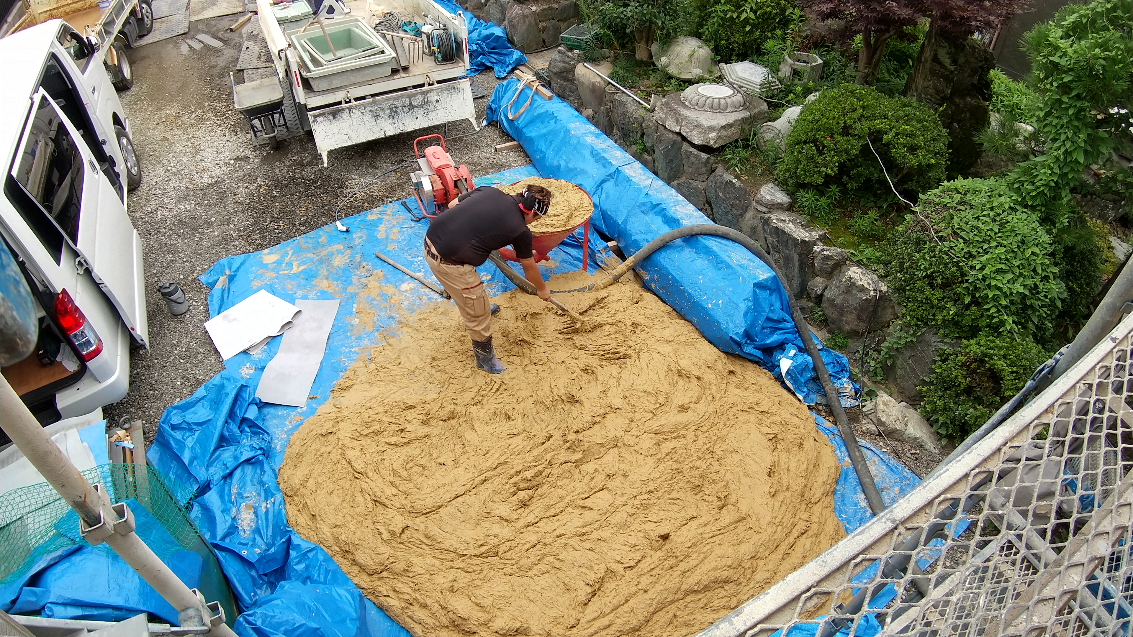 外ではどしゃ降りの中、新人監督のo本君が、内部に雨水が入り込まない様に堰を設けています。o本君が、ずぶ濡れになりながら笑顔で「現場監督の仕事って大変ですね」と一言。こんな事になっているとは知らずに、呑気に軽装で行ってしまったので、罪悪感を感じながら現場を後にしました。ごめんなさい。