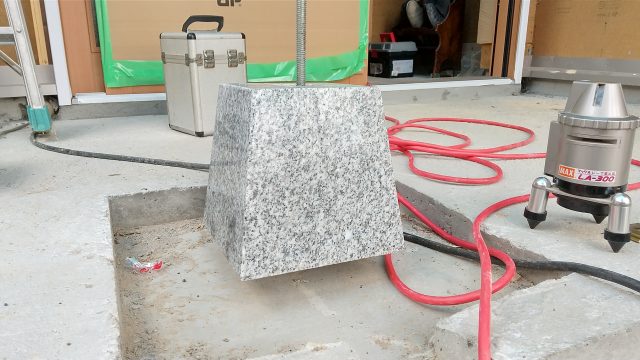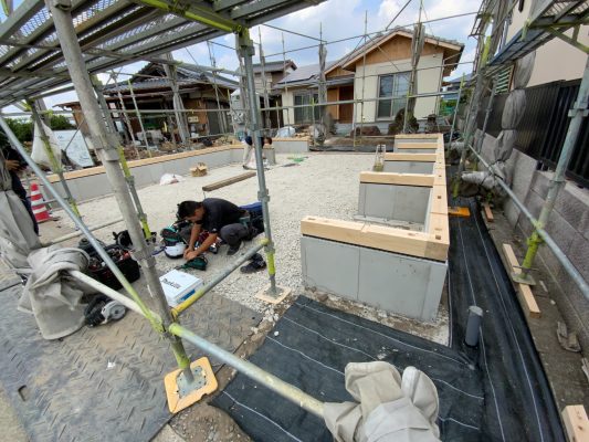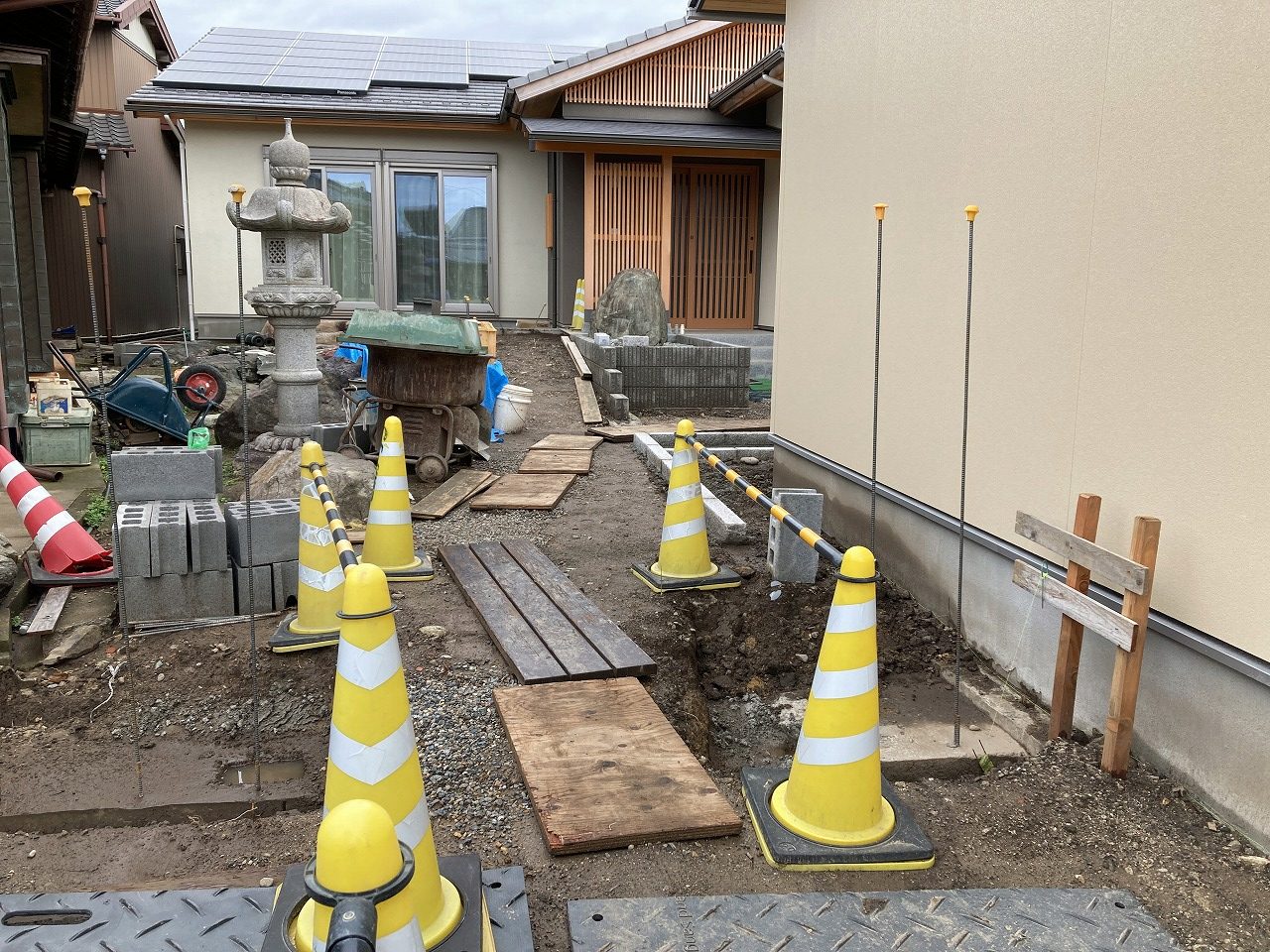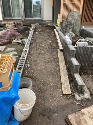 今日も朝から暑い日差しの中、外構工事を行っています。アプローチにスロープを設けたり、玄関先の石庭を設けるためにコンクリートブロックを積む準備です。