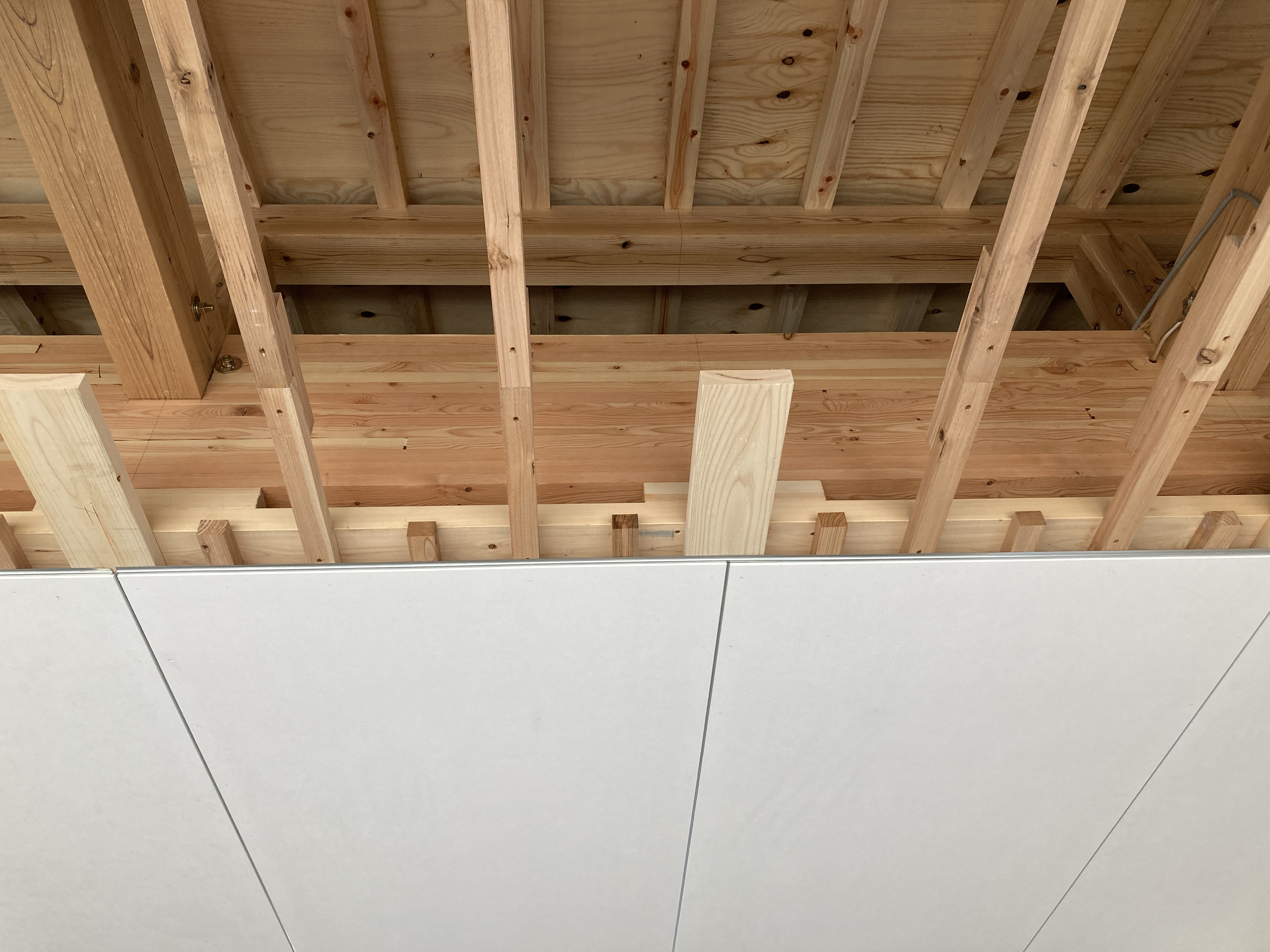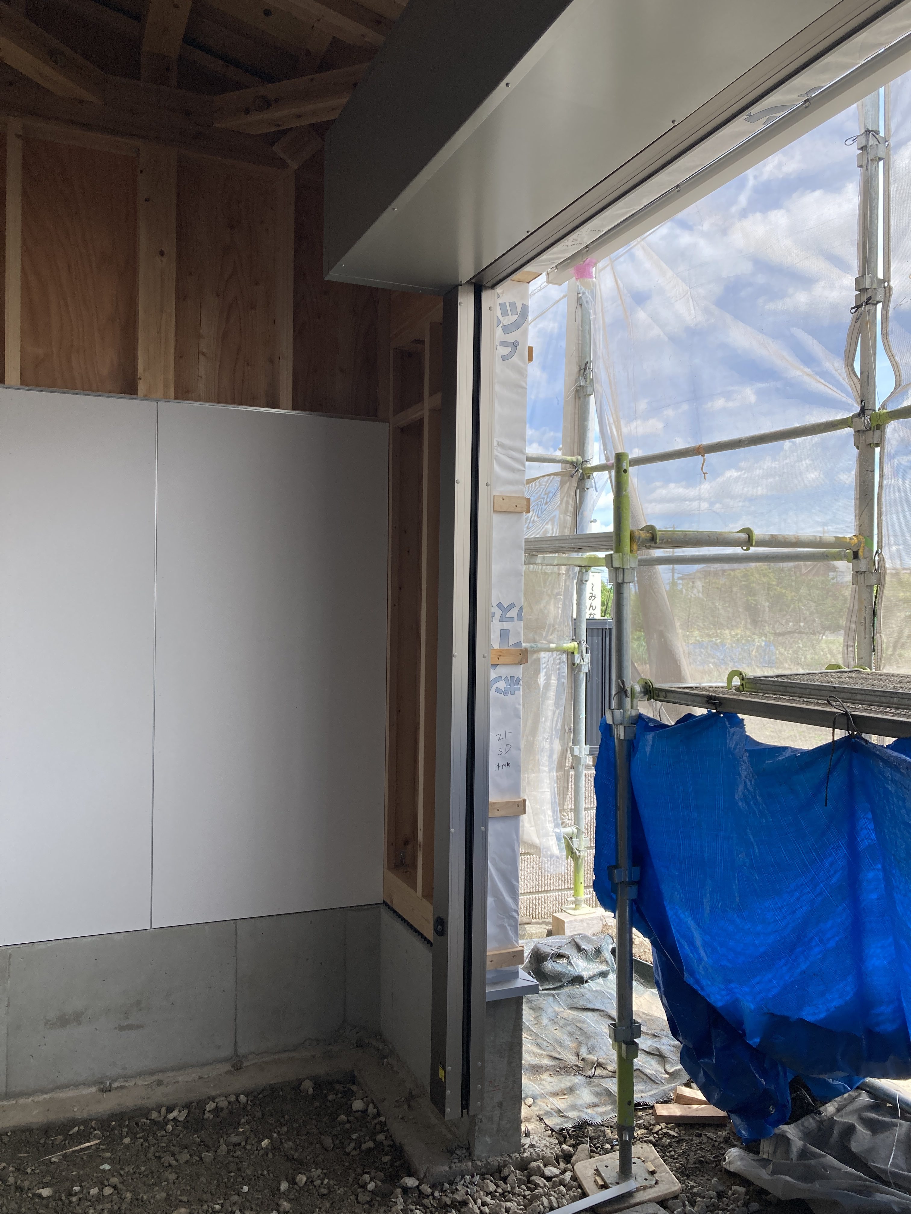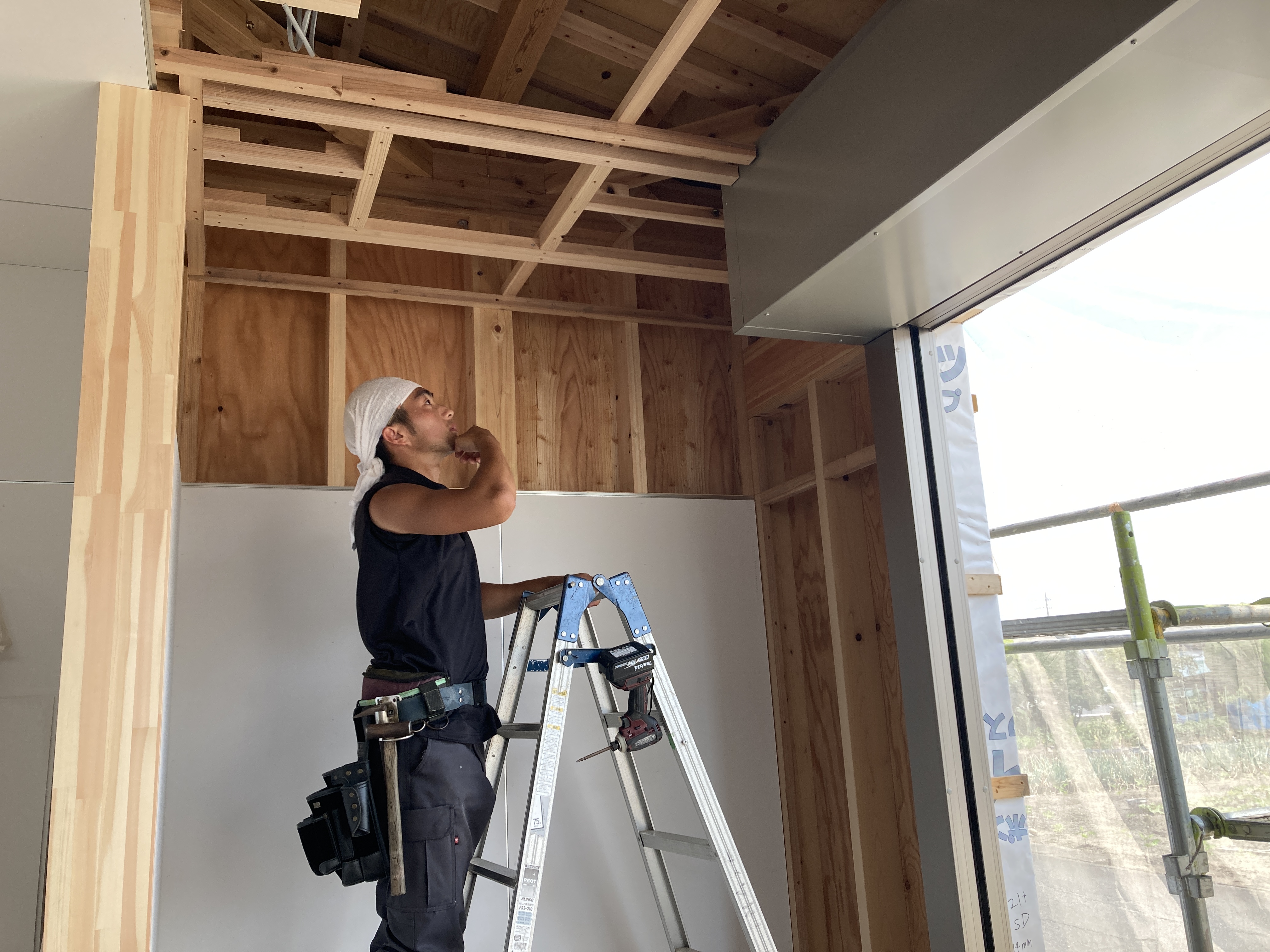 i井棟梁は、雨が降りしきる中、内部でケイカル板を張っています。今回は塗装をせずそのままの仕上げなので、i井棟梁には汚れないように、見た目などにも気を遣ってもらっちゃっています💦目地も通っていて、キレイ👍