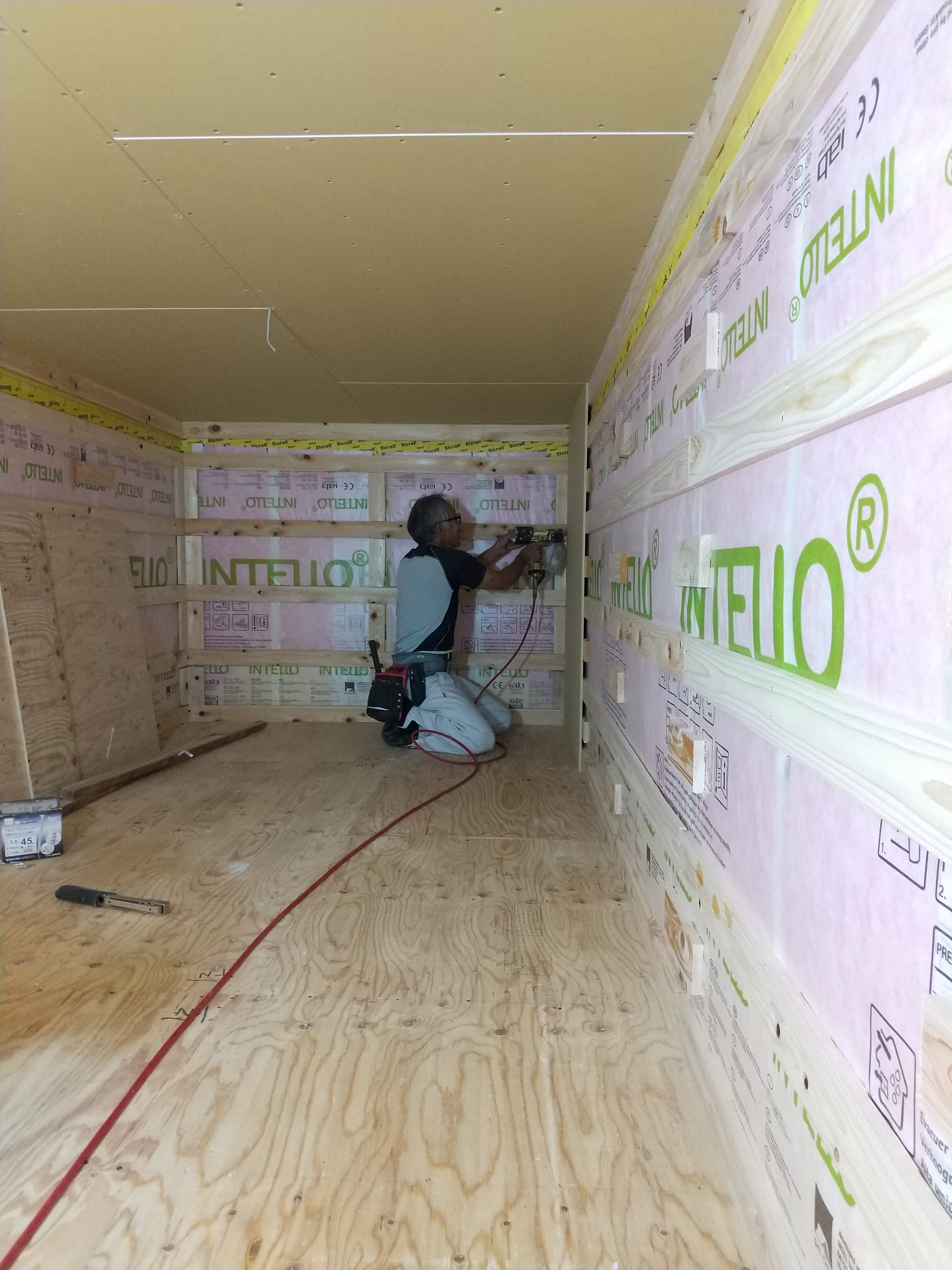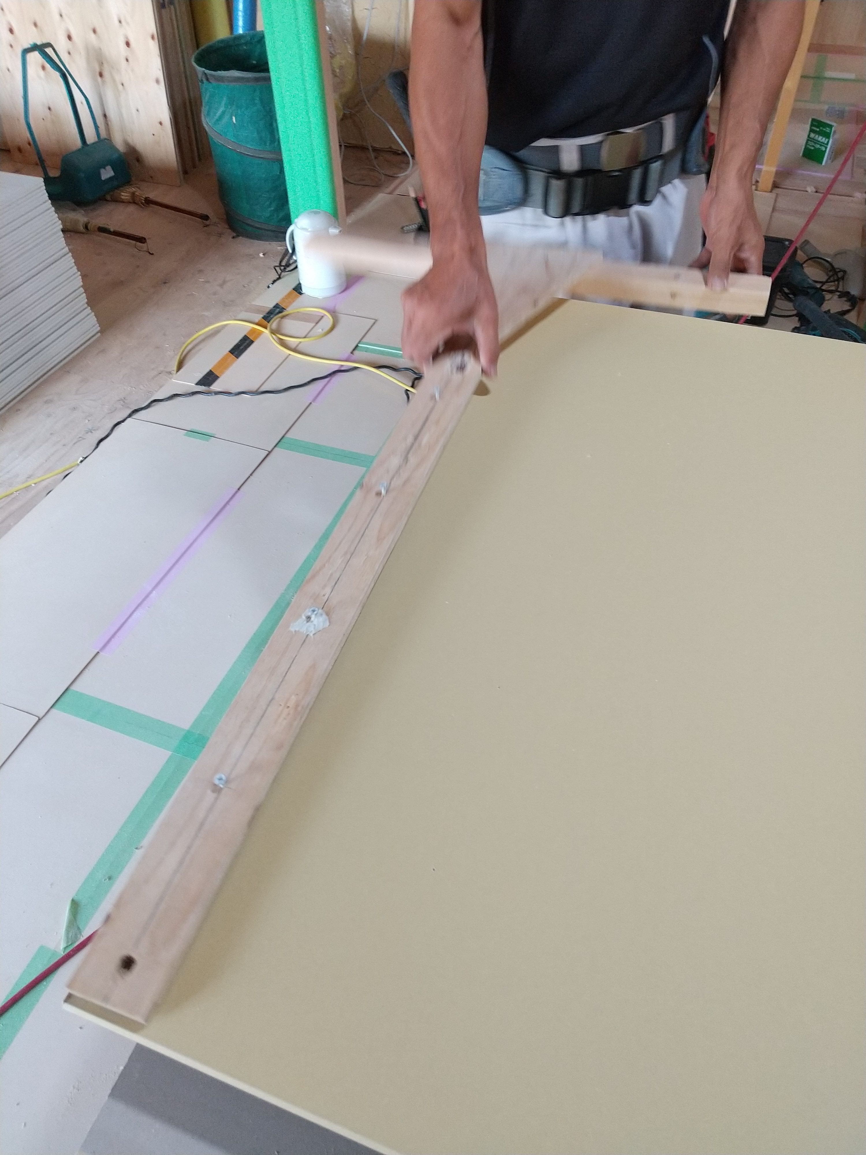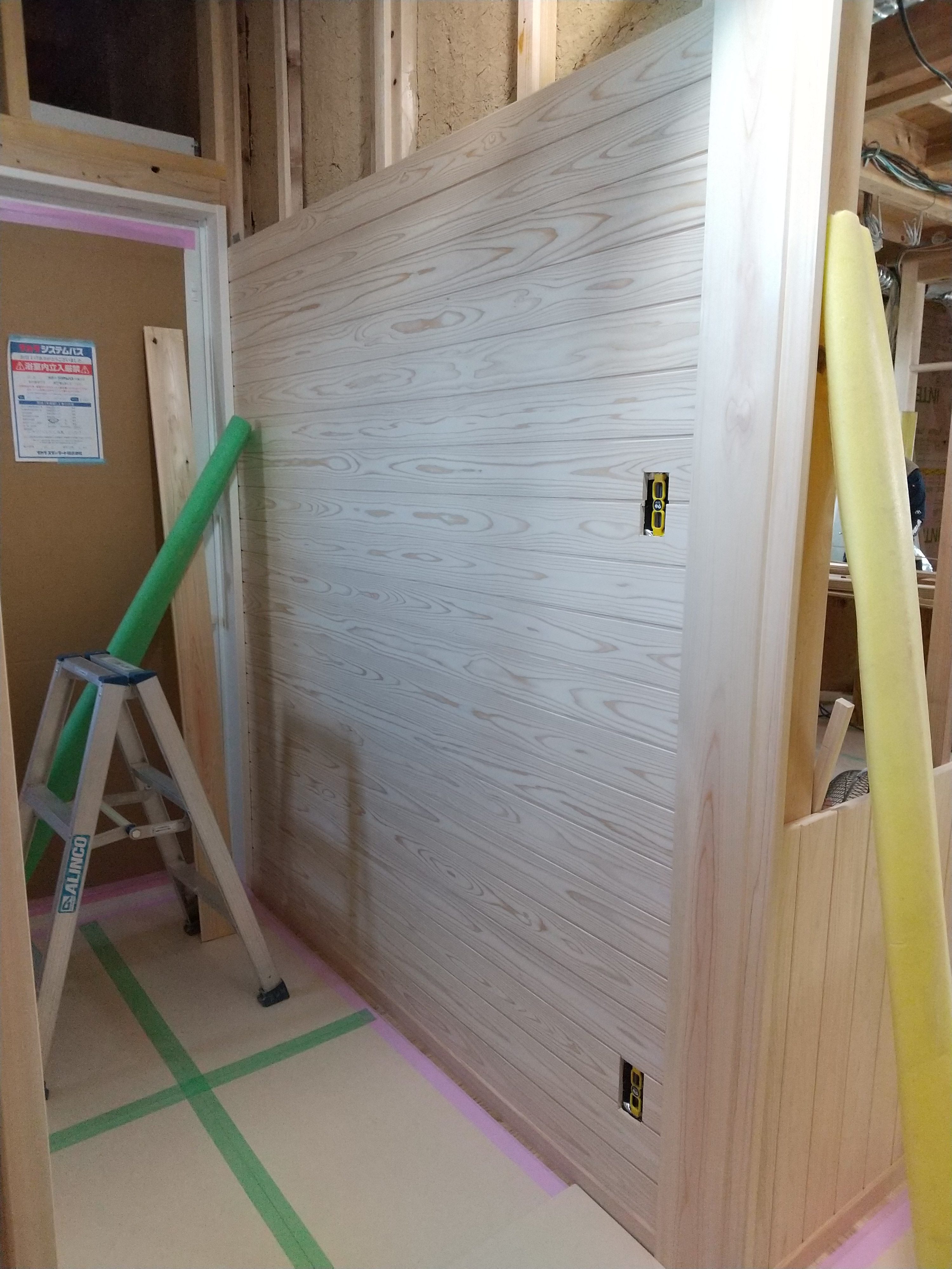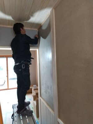 i井棟梁は、雨が降りしきる中、内部でケイカル板を張っています。今回は塗装をせずそのままの仕上げなので、i井棟梁には汚れないように、見た目などにも気を遣ってもらっちゃっています💦目地も通っていて、キレイ👍