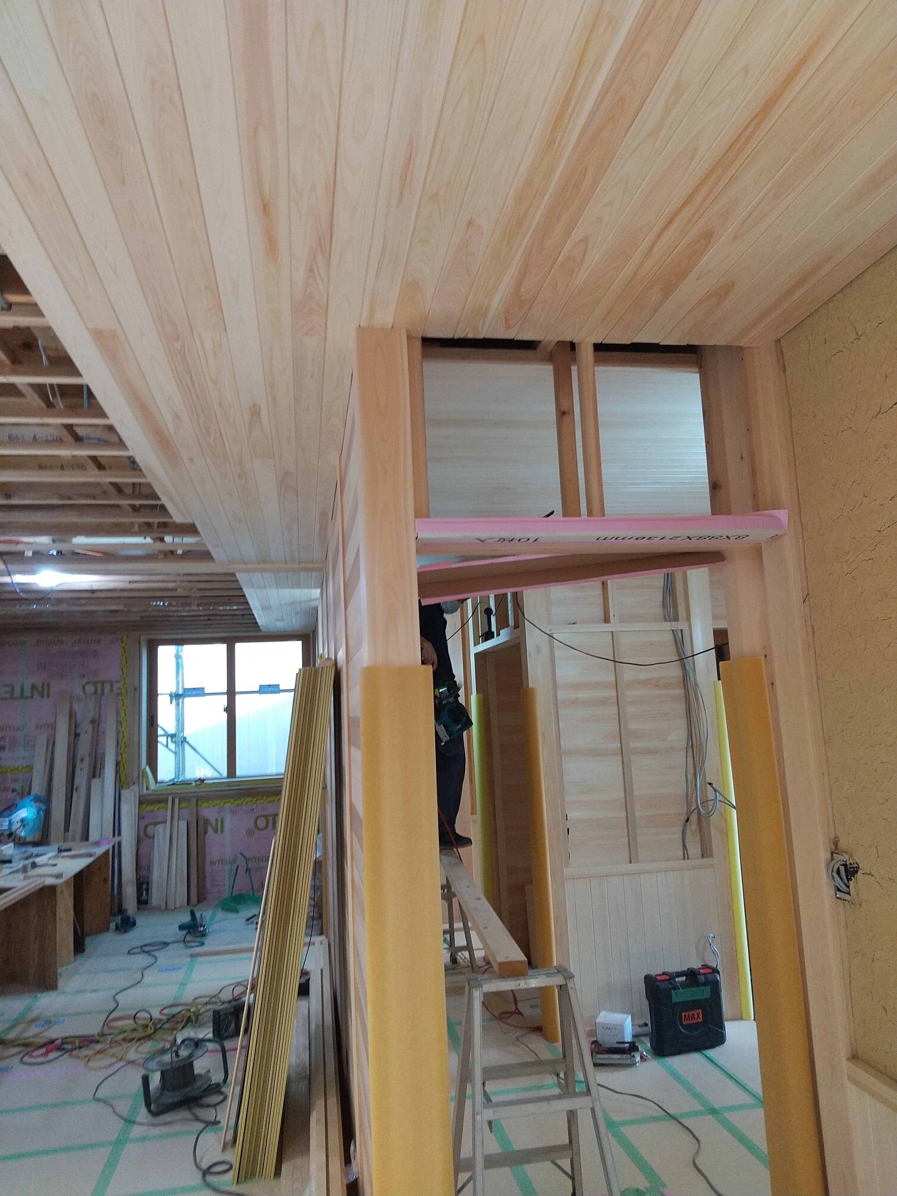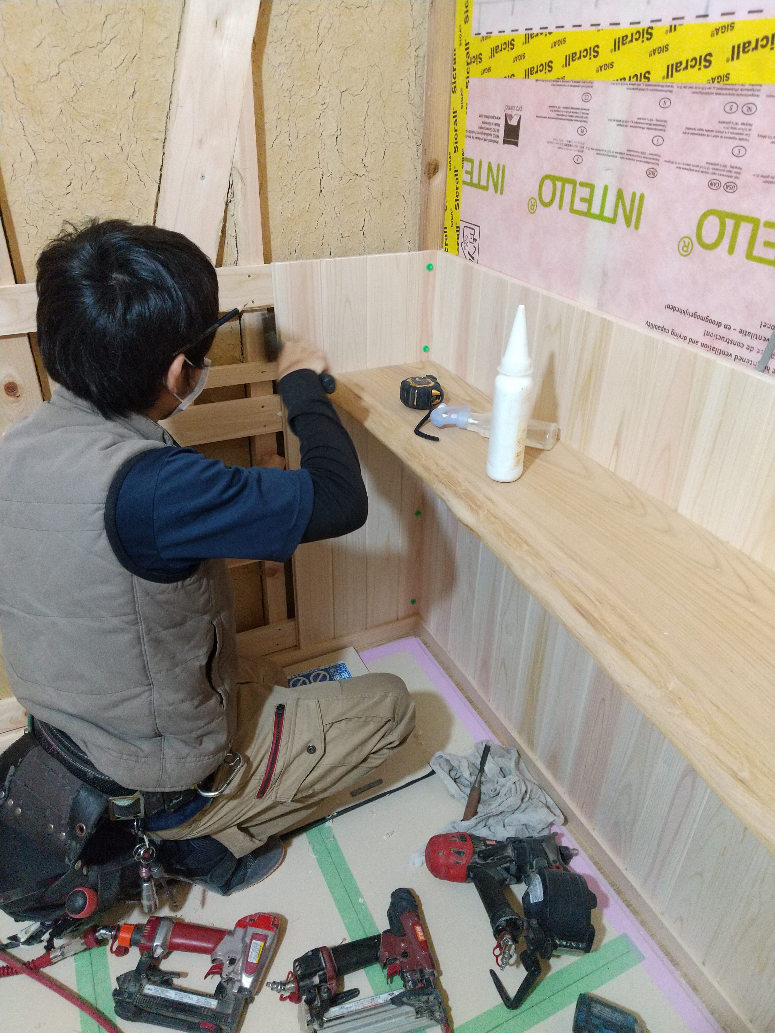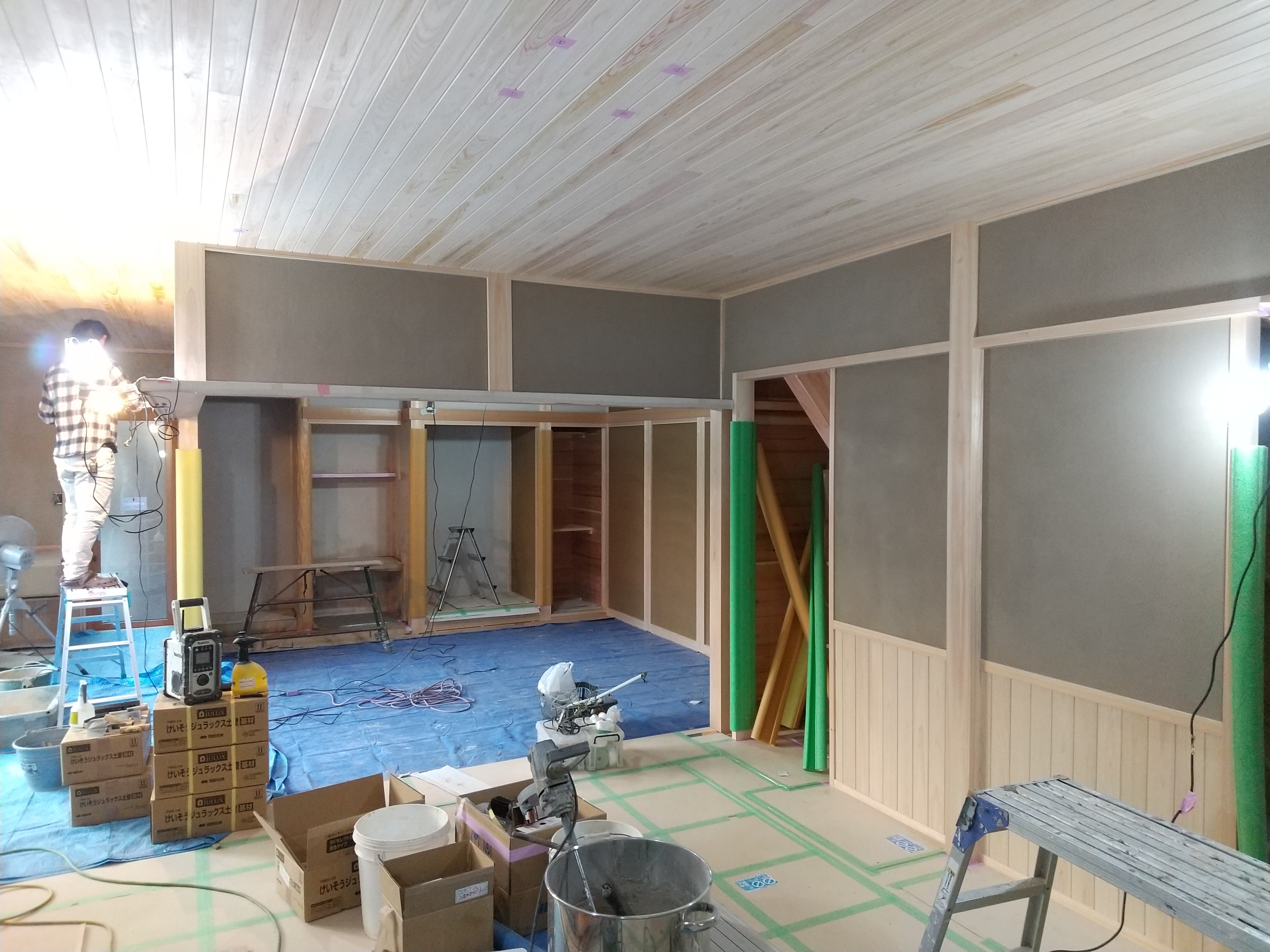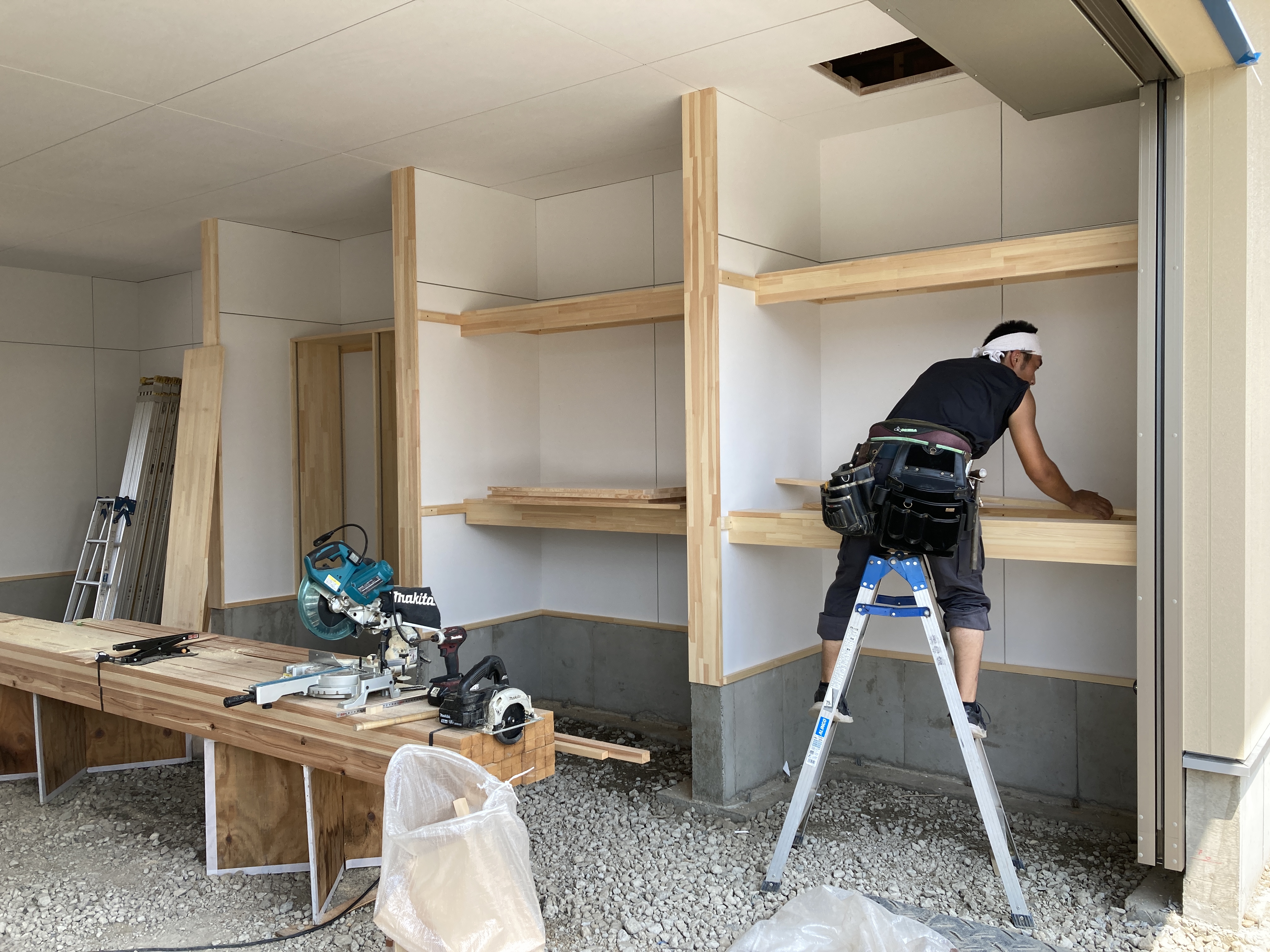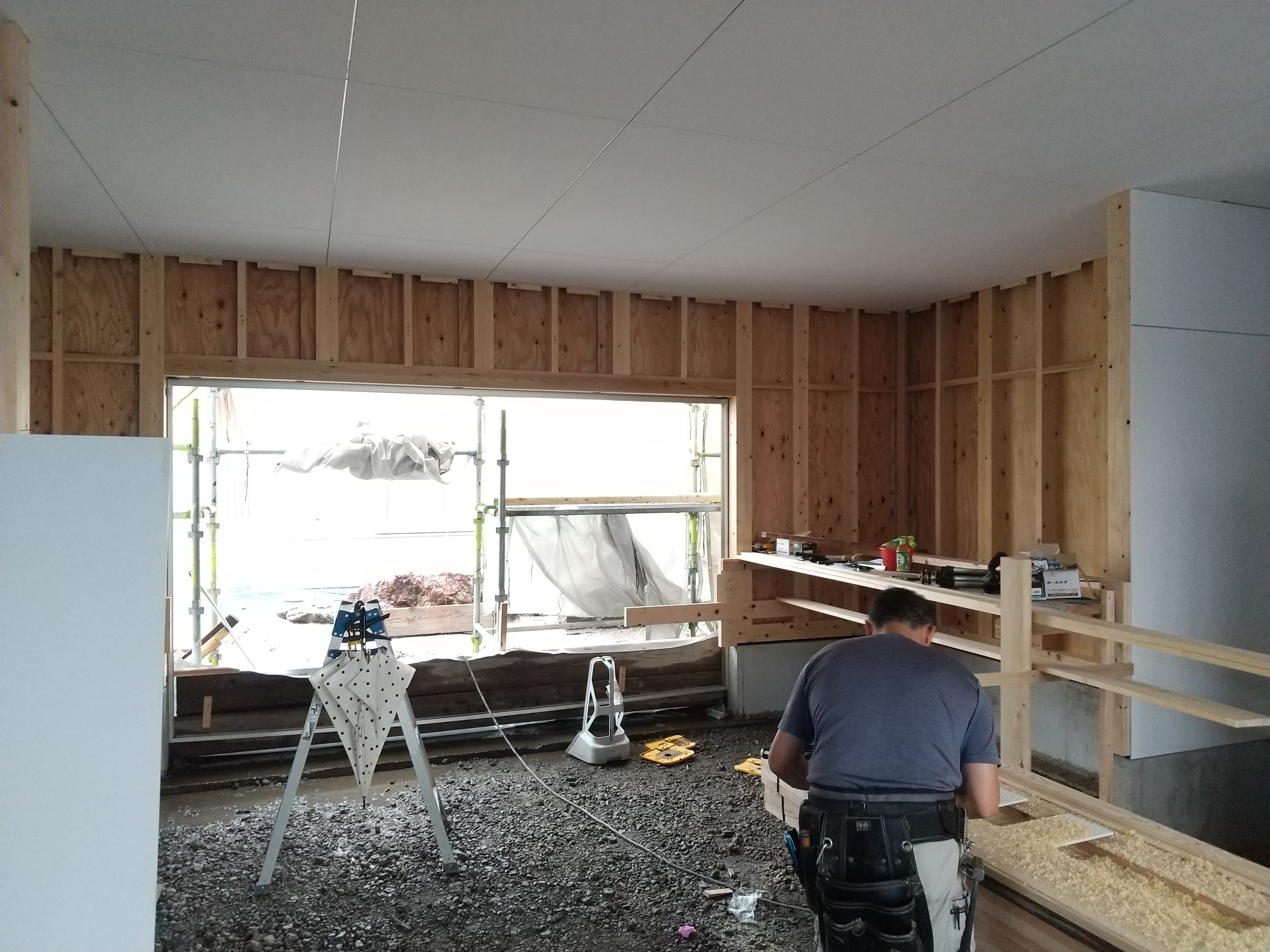 内部は、天井を張り終えて、棚板の取付をk田君が行っています。先日、大工さん仲間で釣りに行って、鯛を2匹釣ったとか。今日は、「鯛をあげてもいいから猫の手でも借りたい」と、お昼ご飯返上で頑張っています💦山田君に座布団持って来てもらわないといけませんね。