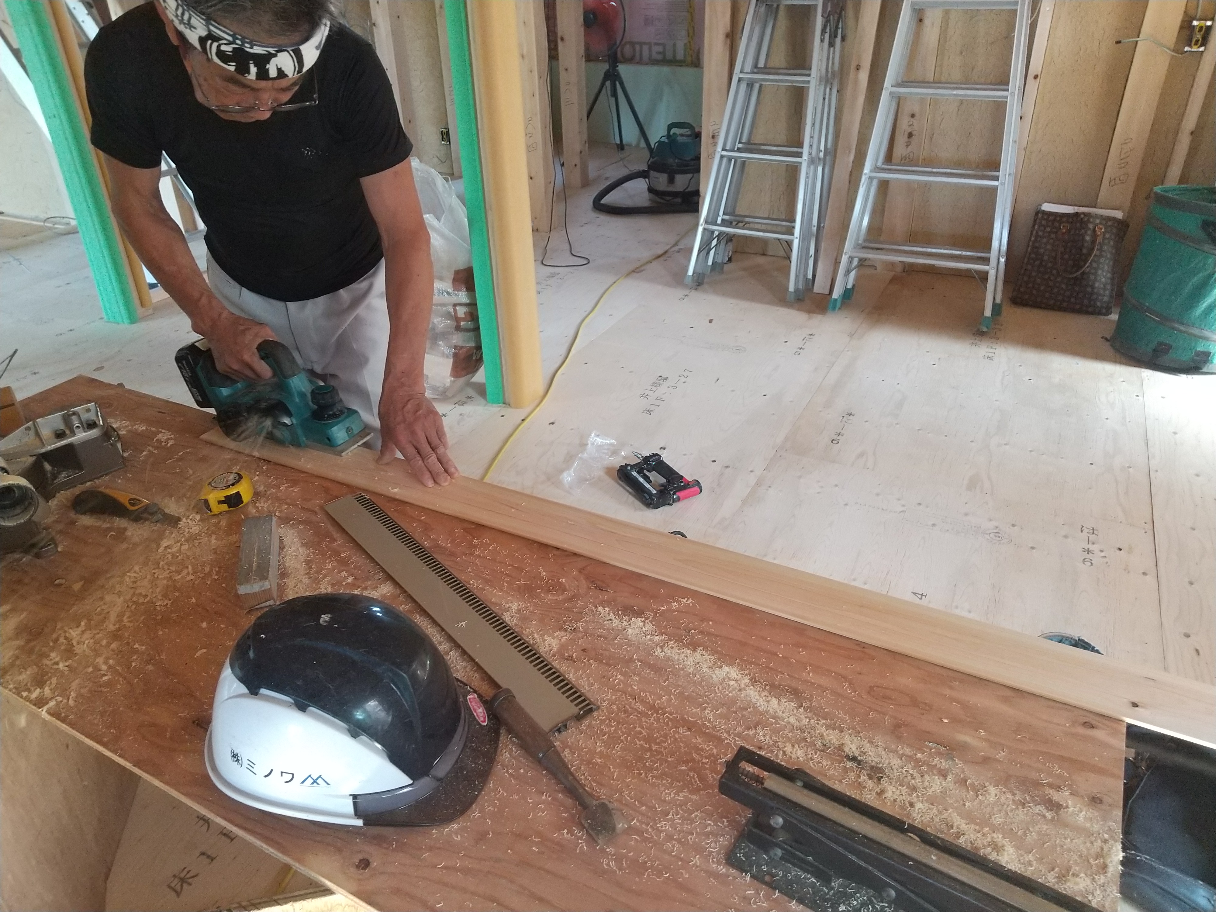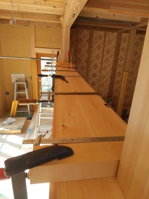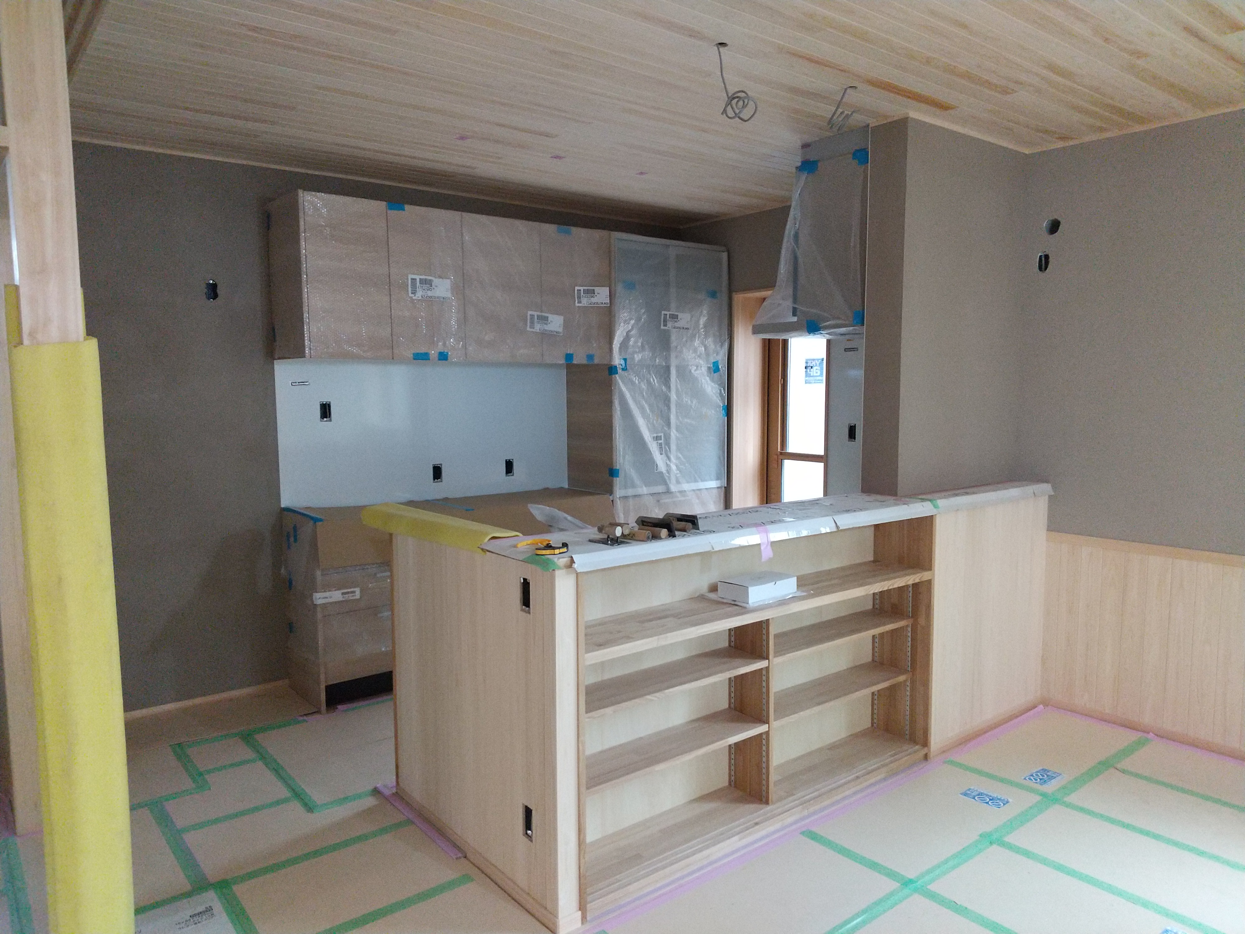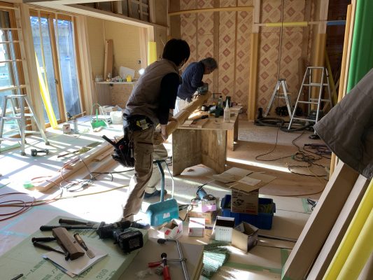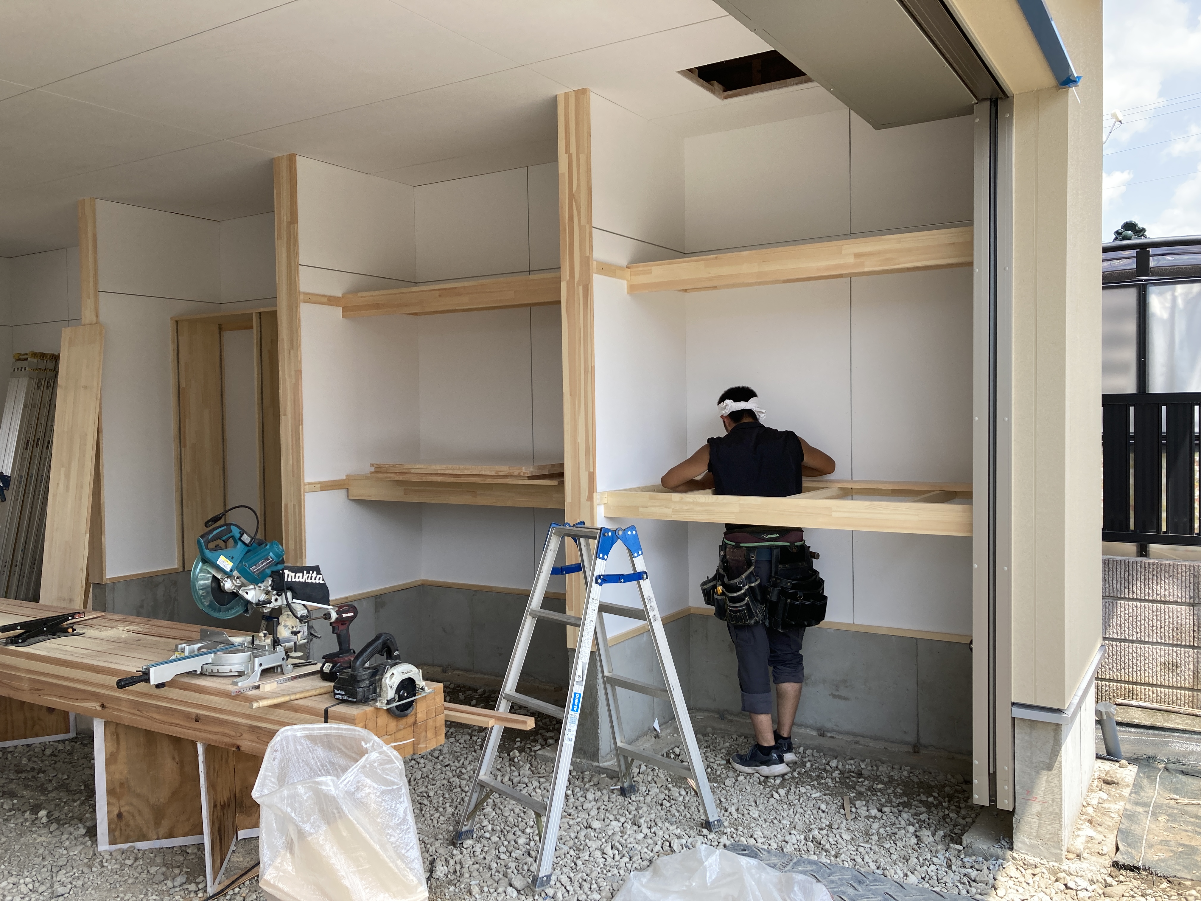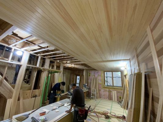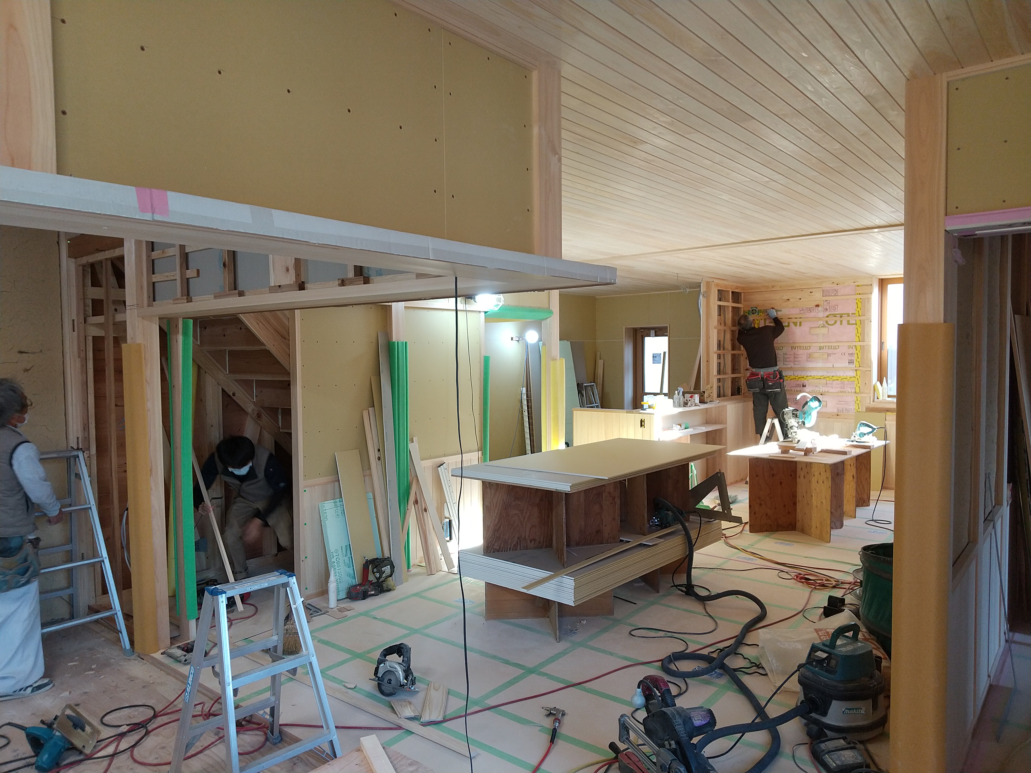 内部は、天井を張り終えて、棚板の取付をk田君が行っています。先日、大工さん仲間で釣りに行って、鯛を2匹釣ったとか。今日は、「鯛をあげてもいいから猫の手でも借りたい」と、お昼ご飯返上で頑張っています💦山田君に座布団持って来てもらわないといけませんね。