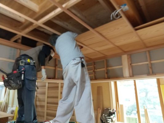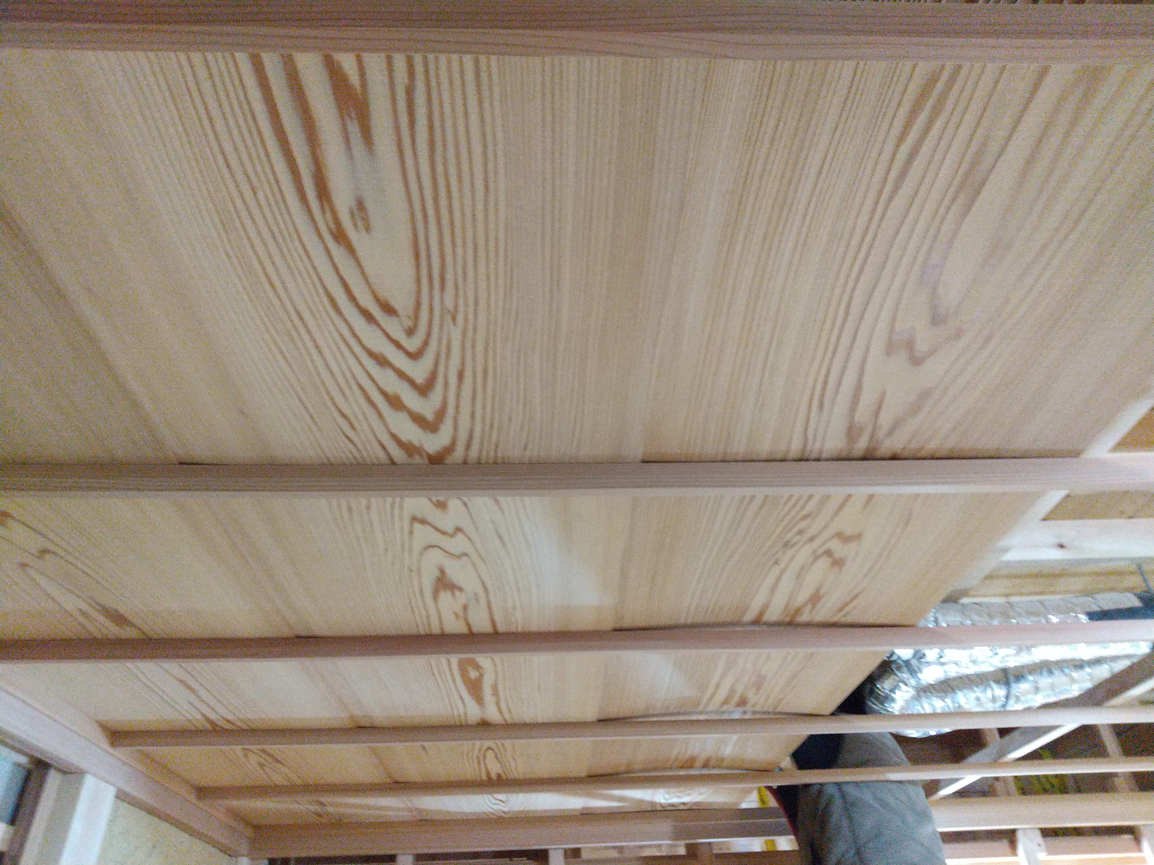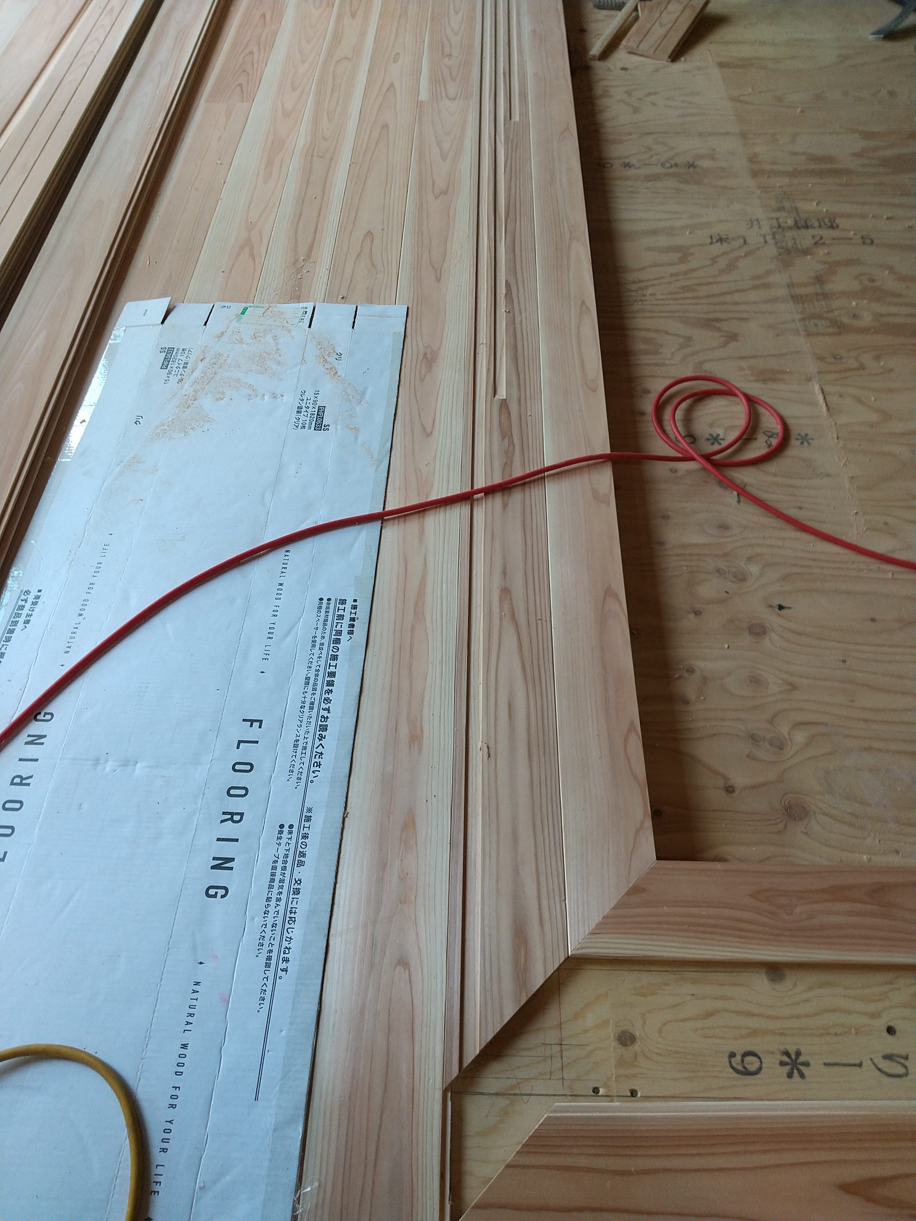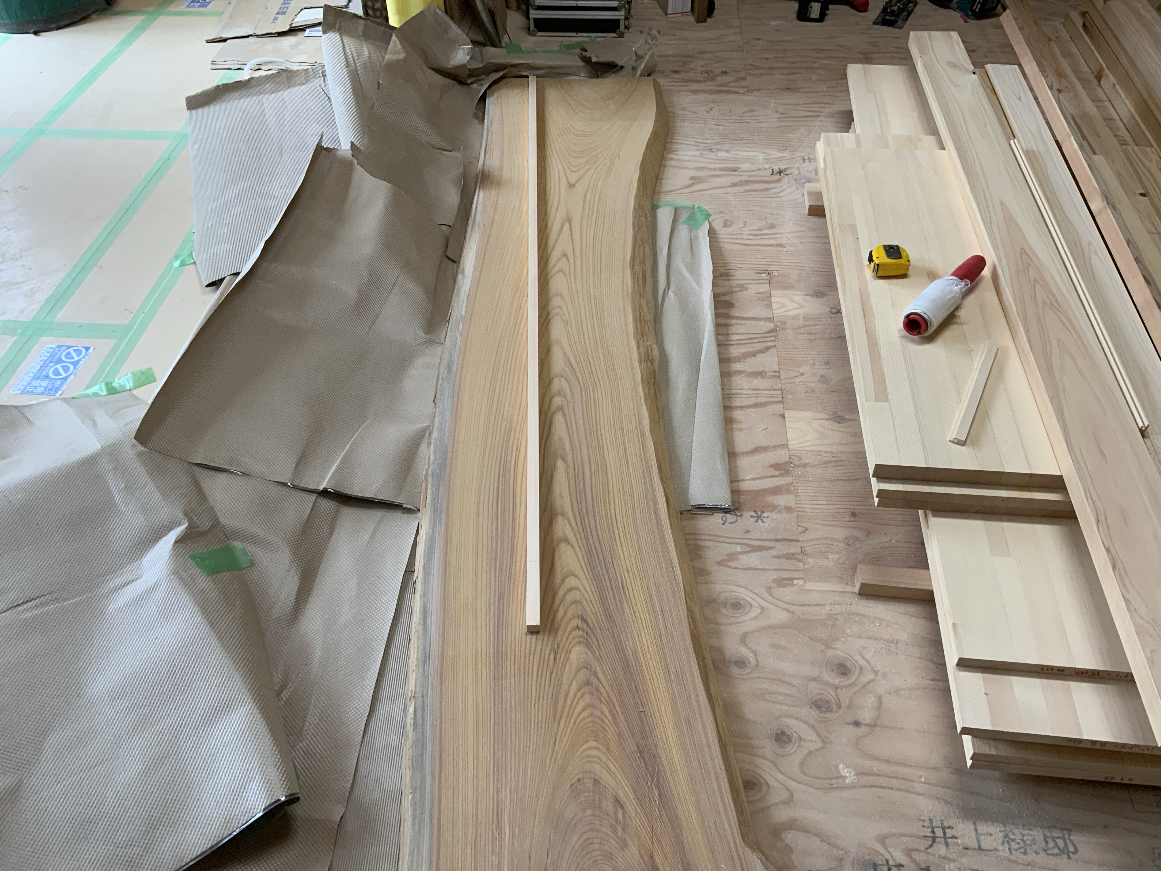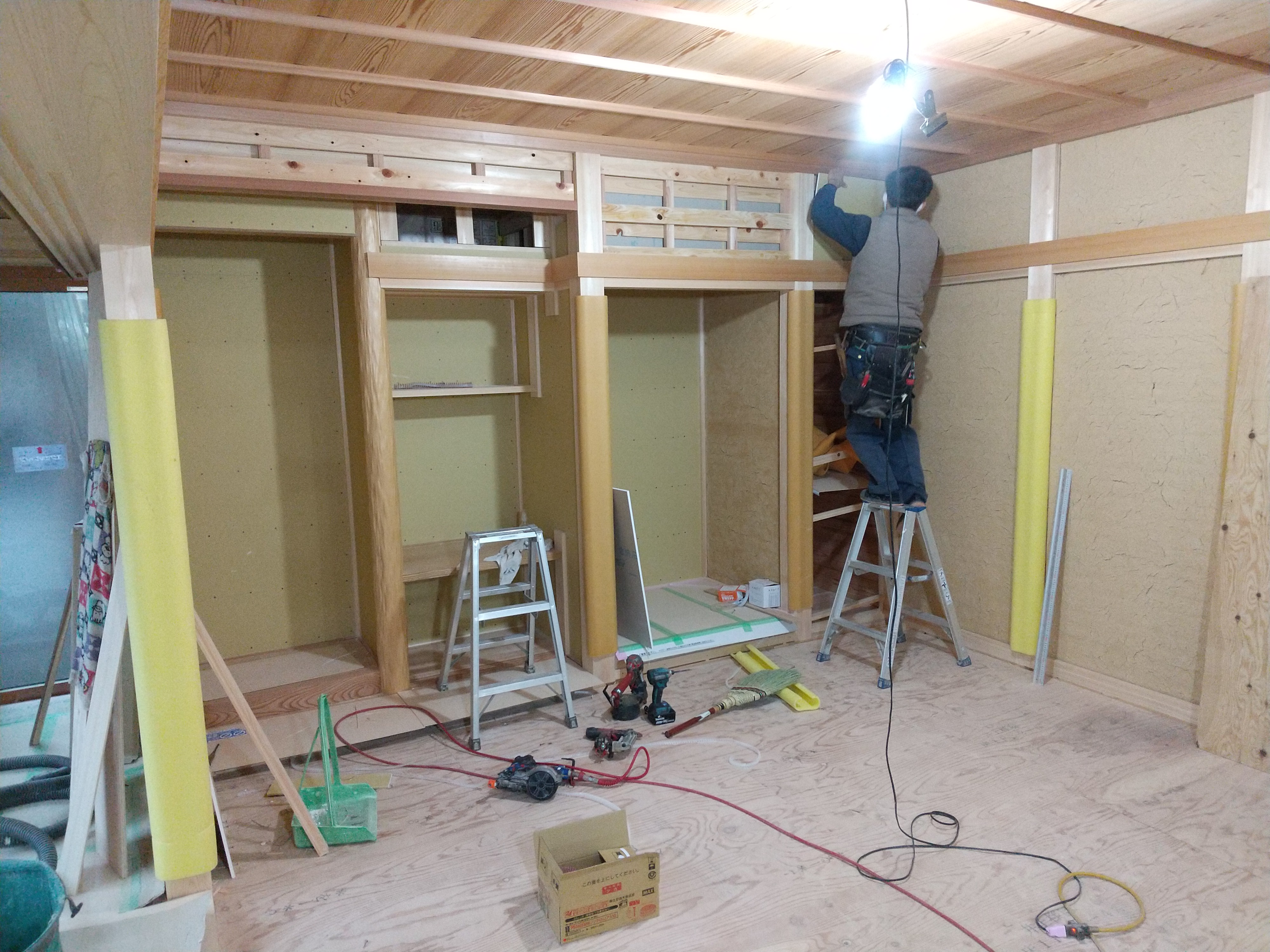 内部は、天井を張り終えて、棚板の取付をk田君が行っています。先日、大工さん仲間で釣りに行って、鯛を2匹釣ったとか。今日は、「鯛をあげてもいいから猫の手でも借りたい」と、お昼ご飯返上で頑張っています💦山田君に座布団持って来てもらわないといけませんね。