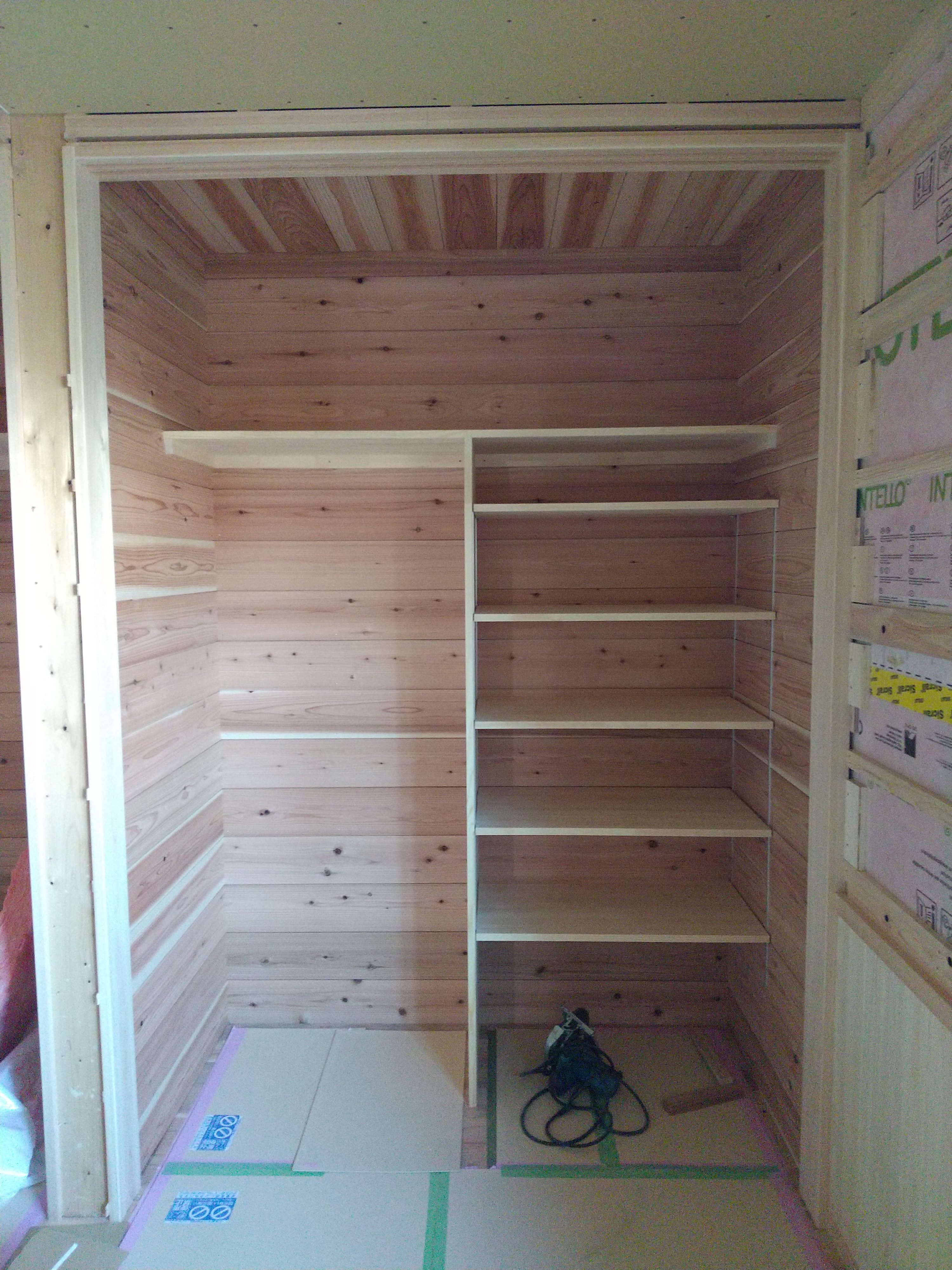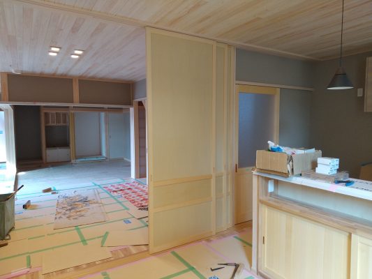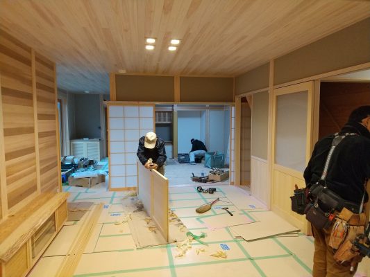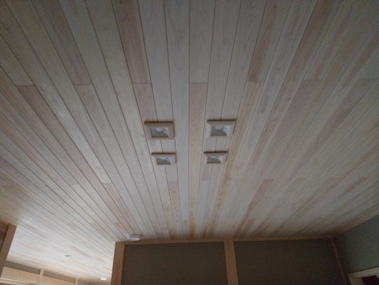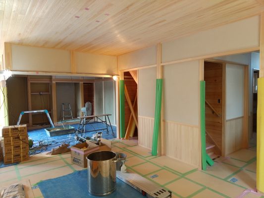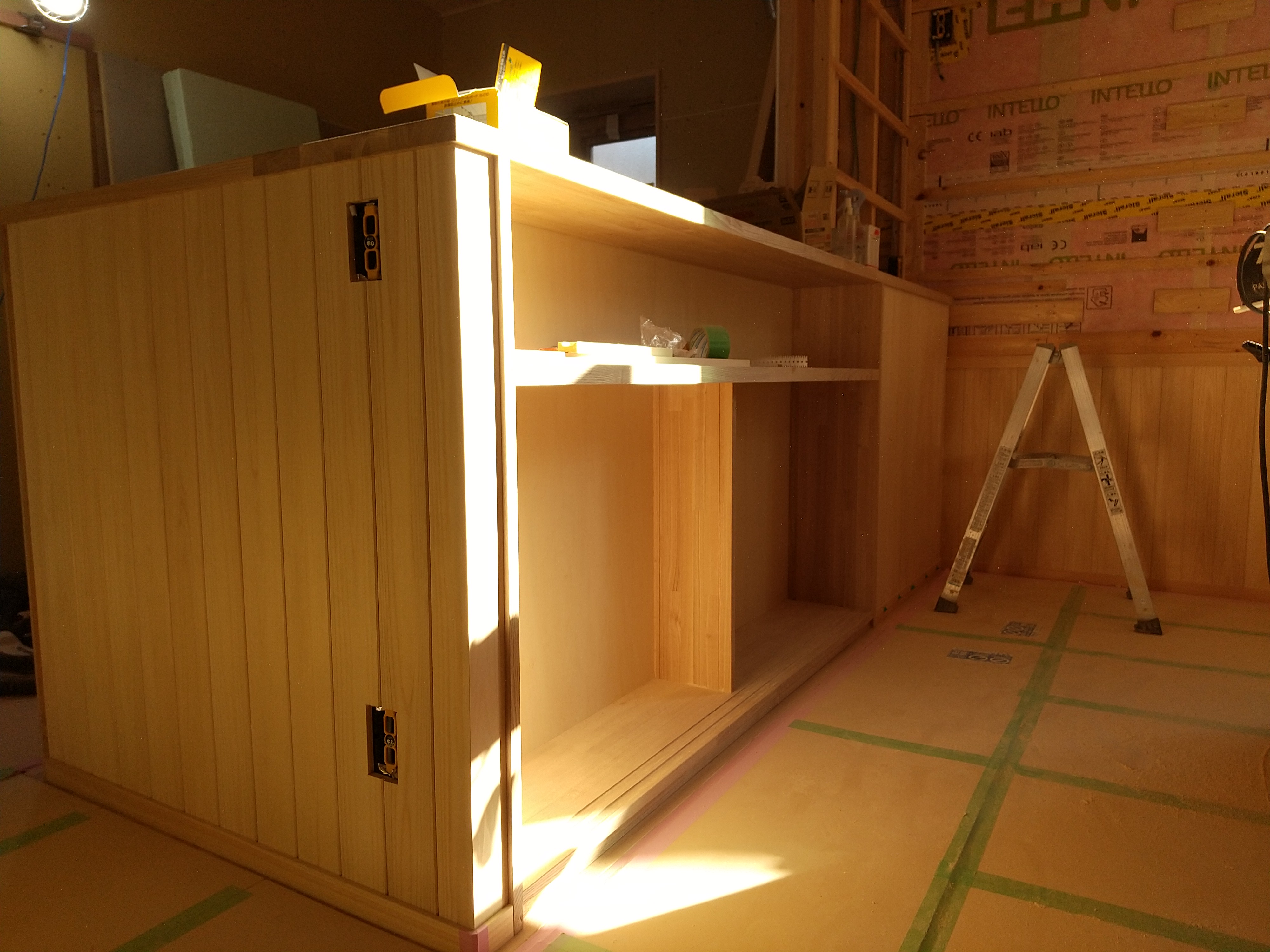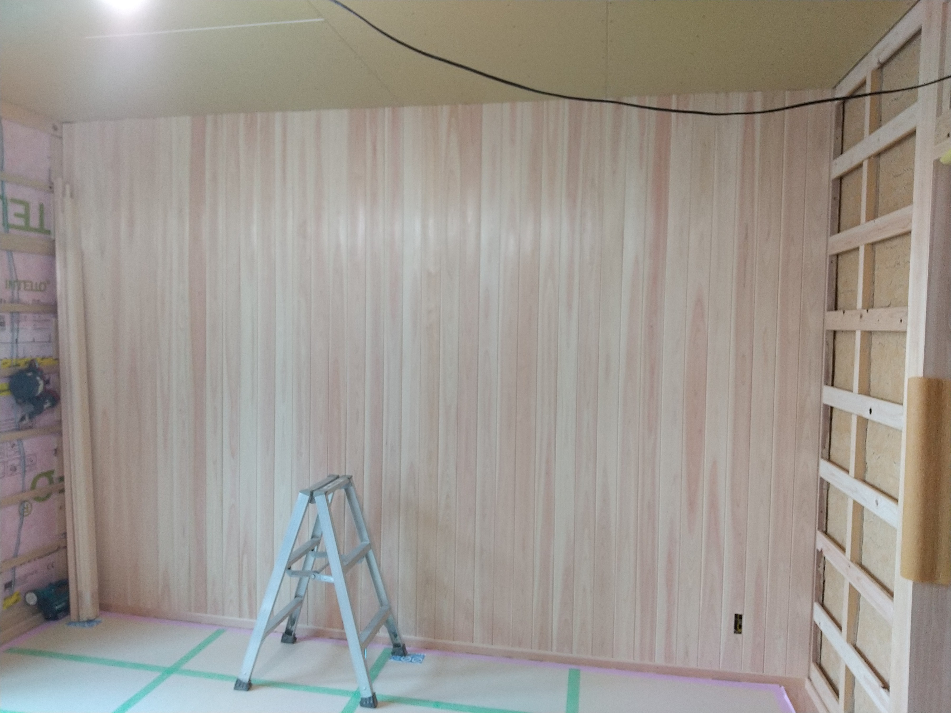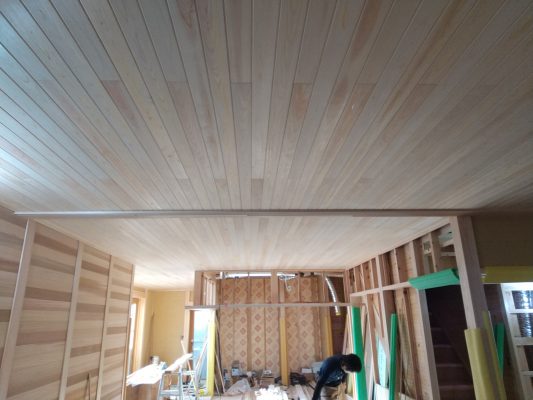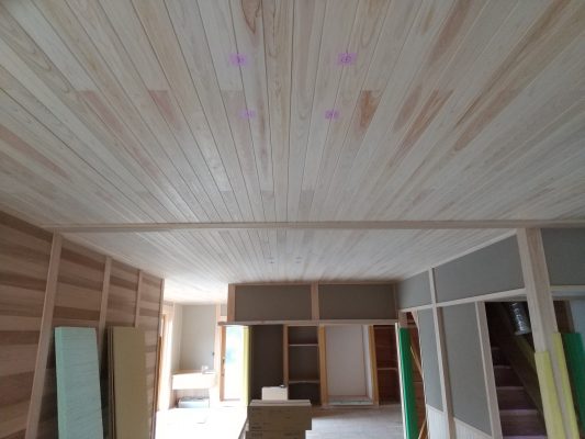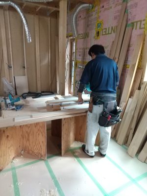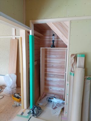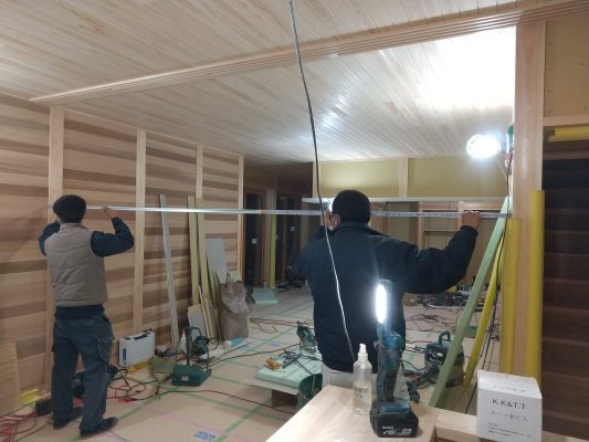 内部は、天井を張り終えて、棚板の取付をk田君が行っています。先日、大工さん仲間で釣りに行って、鯛を2匹釣ったとか。今日は、「鯛をあげてもいいから猫の手でも借りたい」と、お昼ご飯返上で頑張っています💦山田君に座布団持って来てもらわないといけませんね。