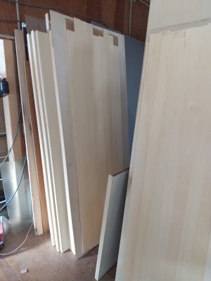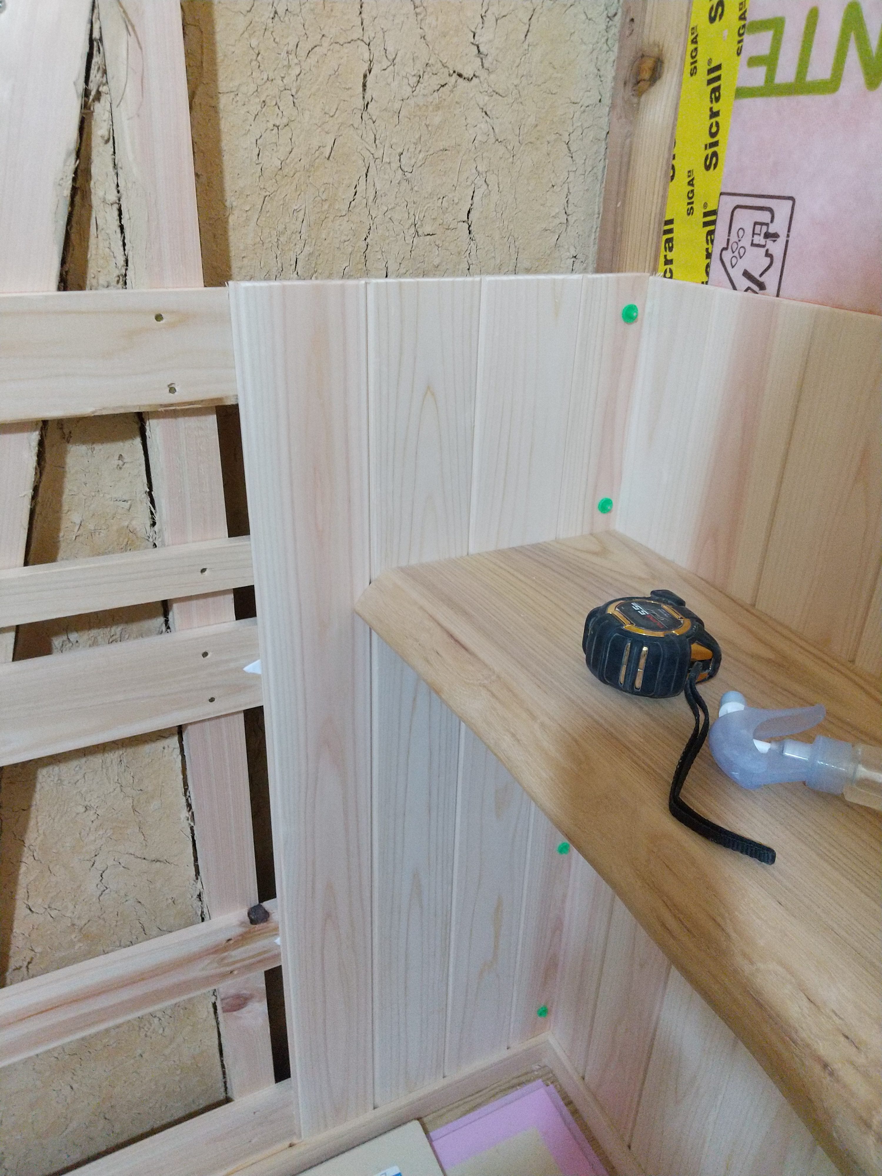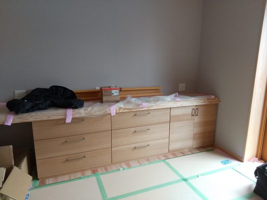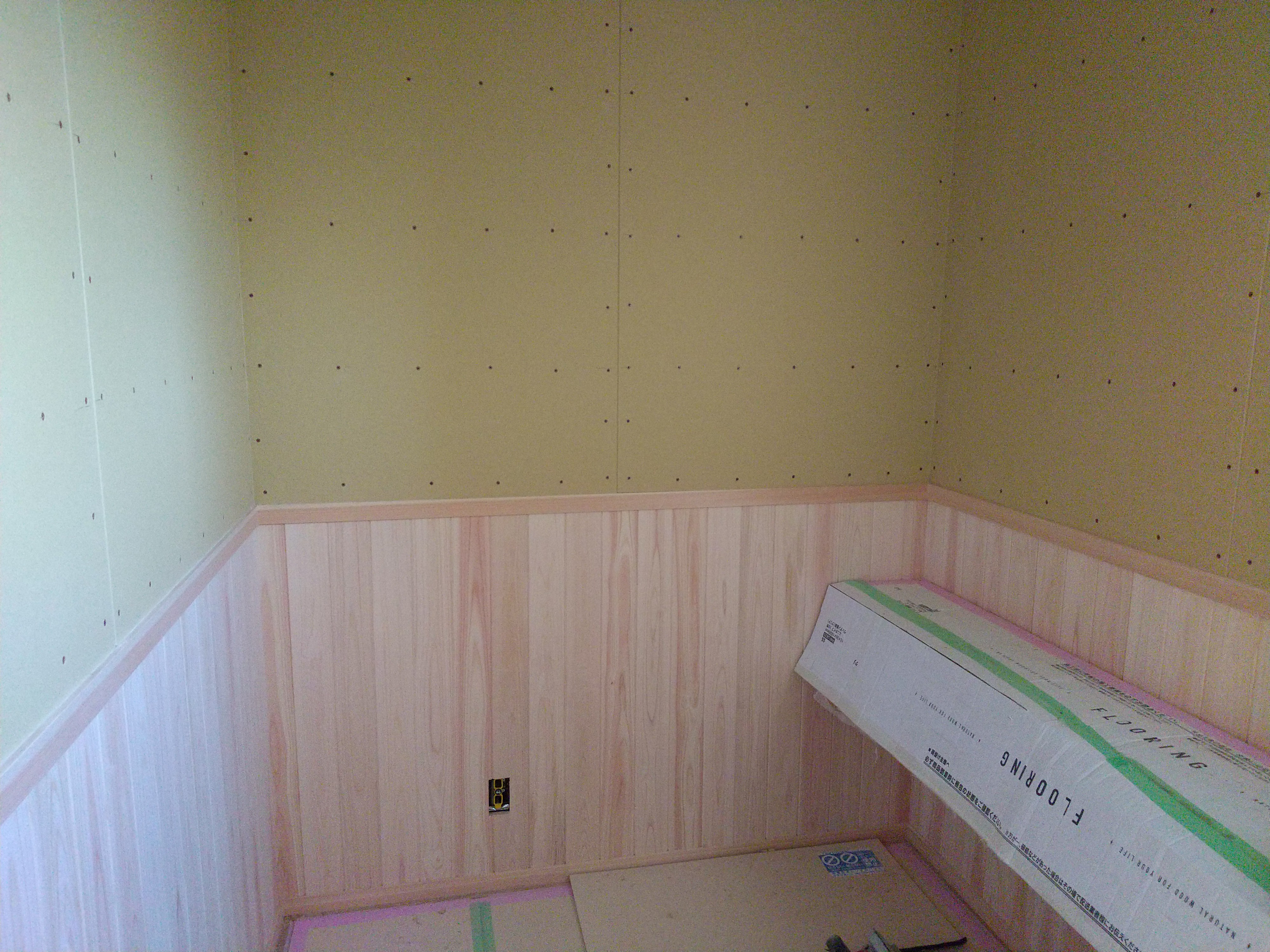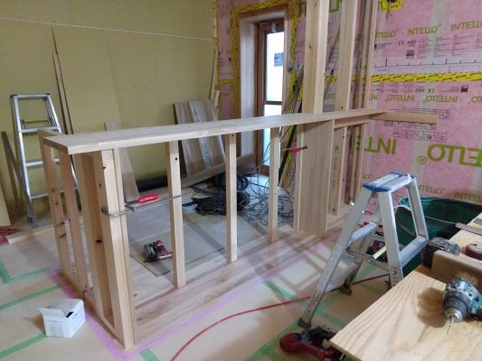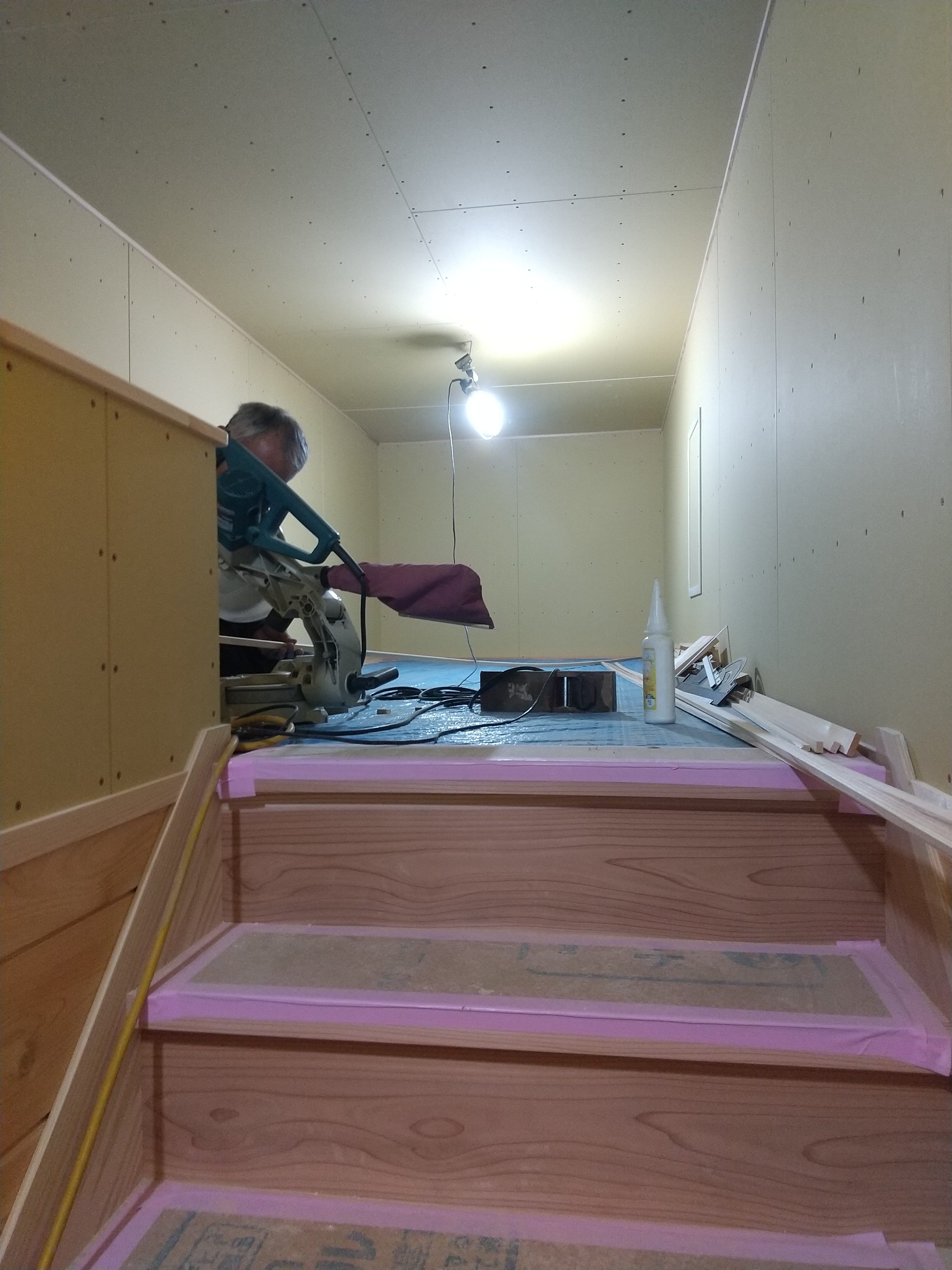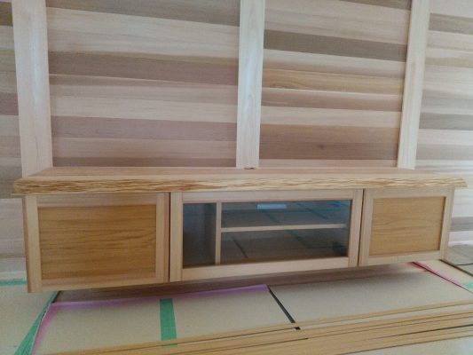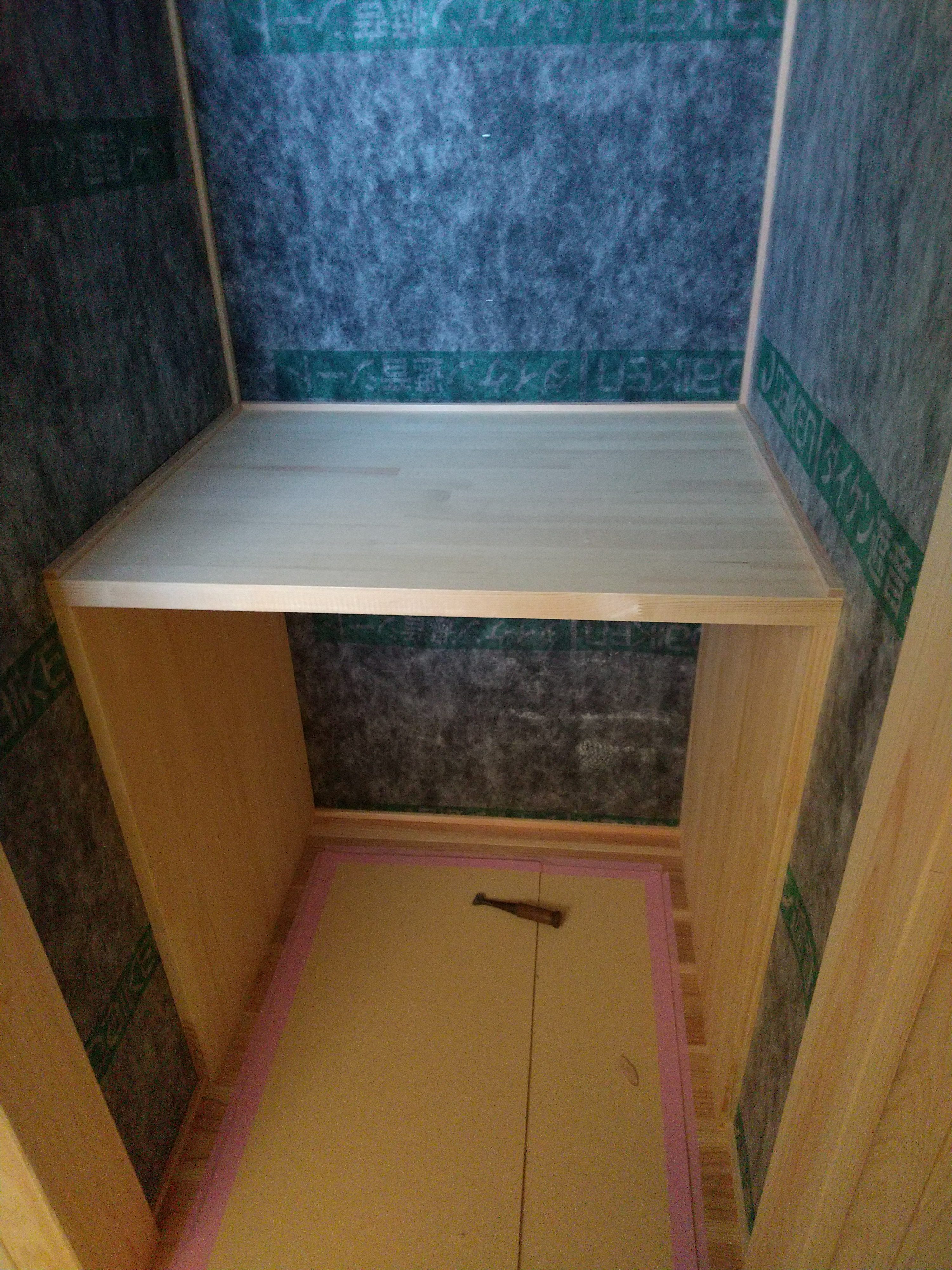 内部は、天井を張り終えて、棚板の取付をk田君が行っています。先日、大工さん仲間で釣りに行って、鯛を2匹釣ったとか。今日は、「鯛をあげてもいいから猫の手でも借りたい」と、お昼ご飯返上で頑張っています💦山田君に座布団持って来てもらわないといけませんね。