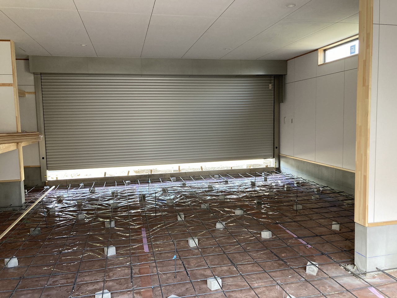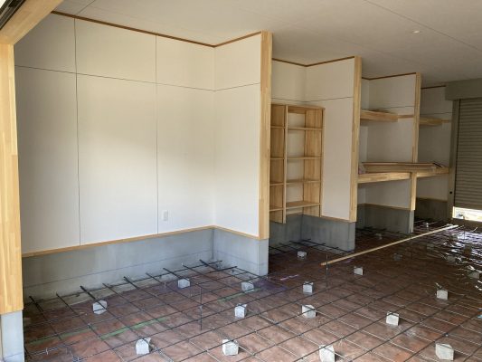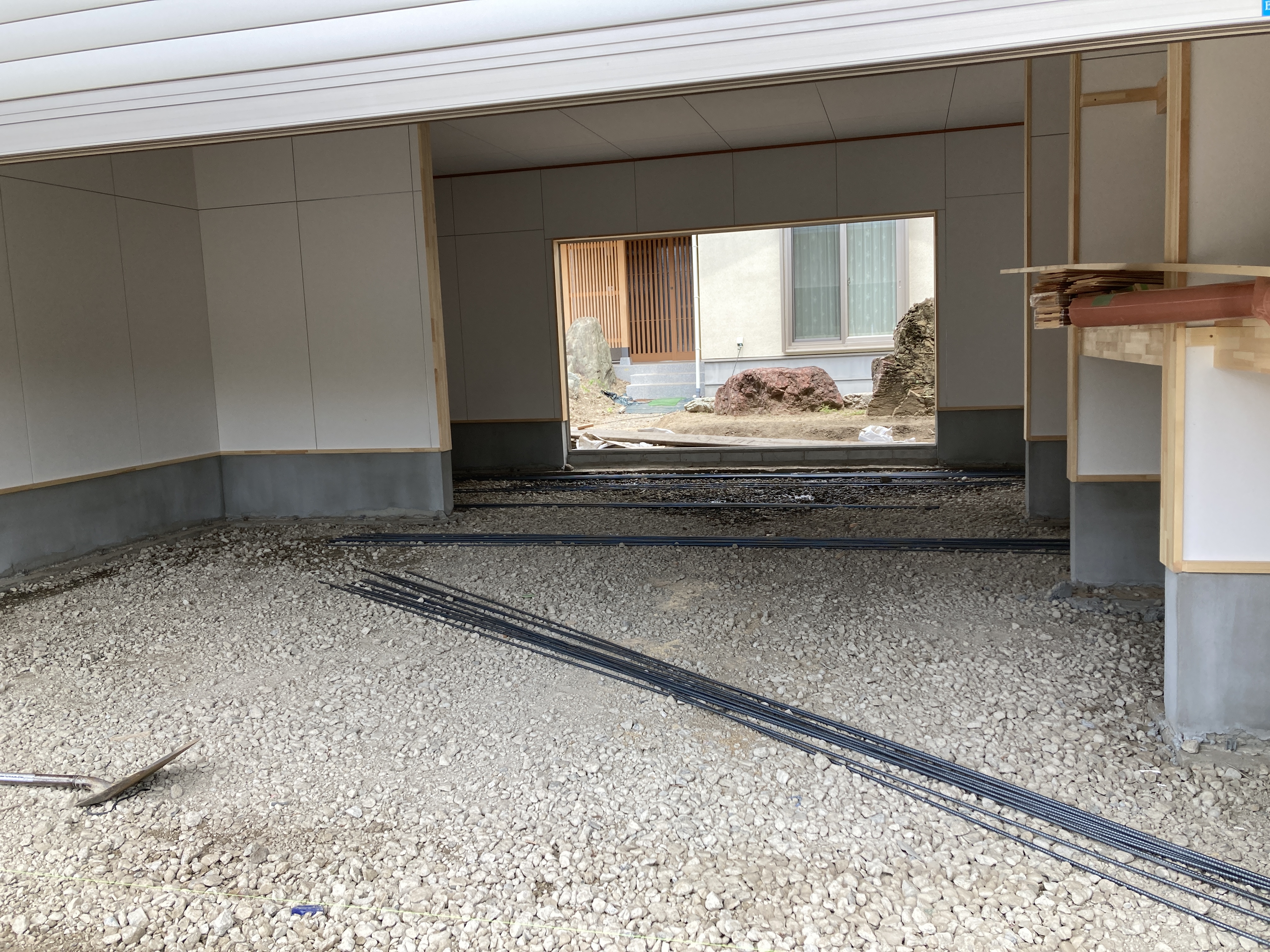 木工事が終わり、内部の土間コンクリートを打つために砕石をならして、配筋をする準備がされています。