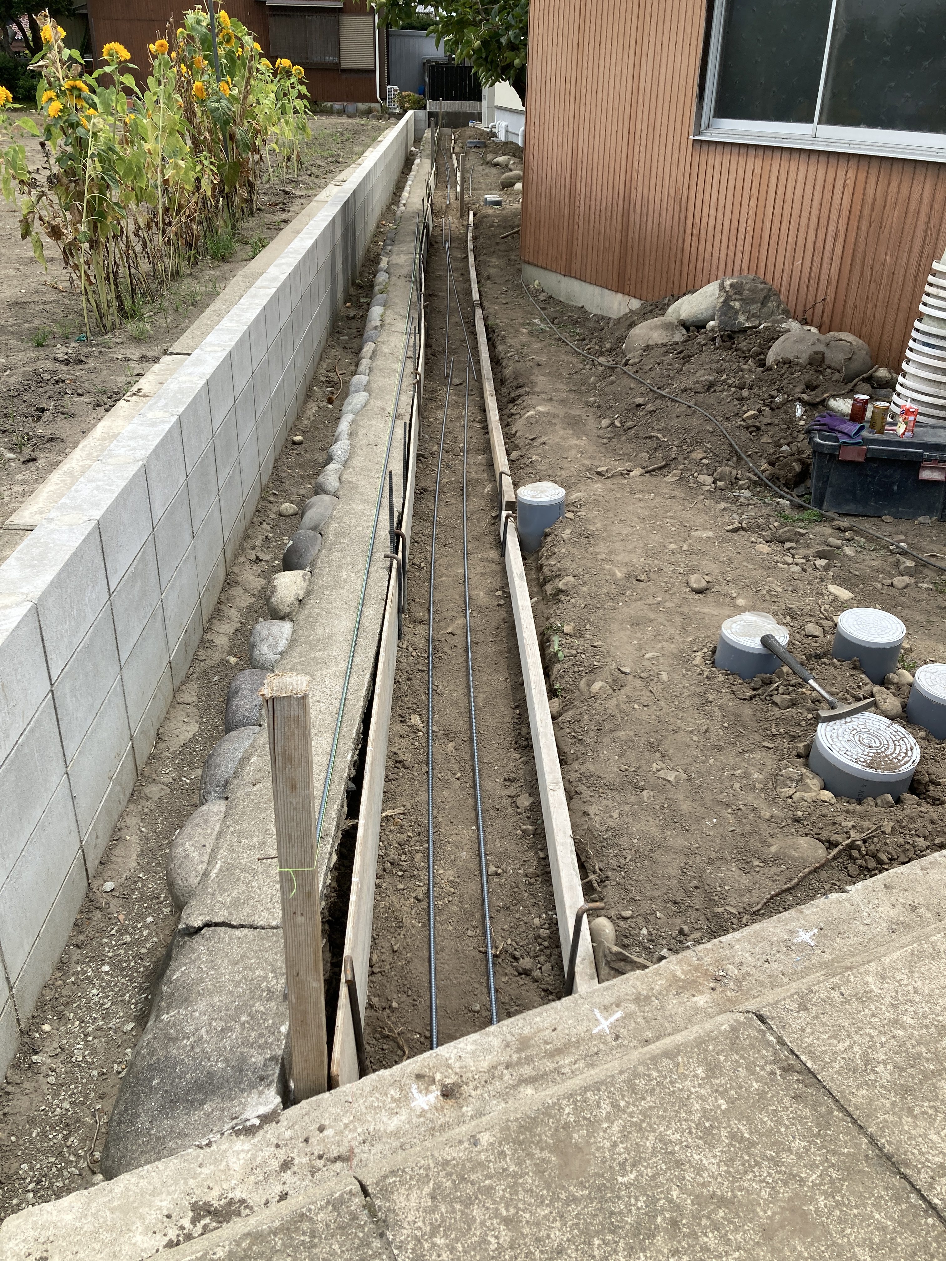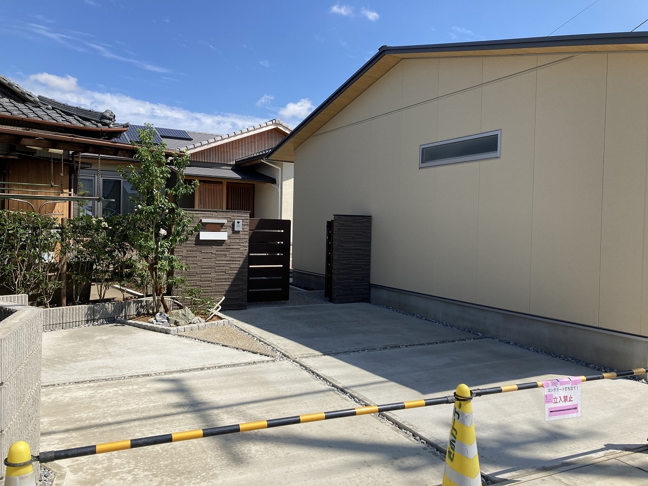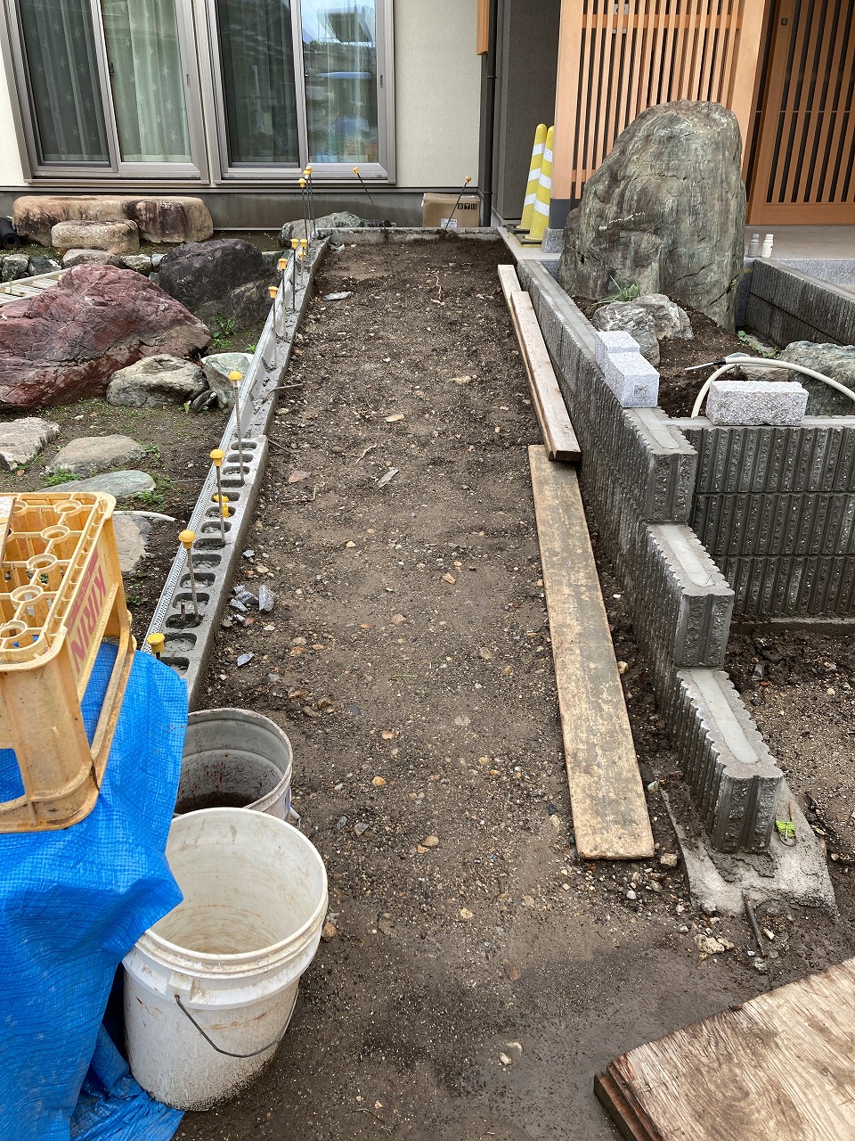 雨続きで、なかなか外構工事は思う様に進んでいません💦あとちょっとなのですが、i様にはご不自由をおかけしています。そんな中、お母様から「少しでも進んで助かるけど、雨の中もやってくれていて気の毒だわ。」とやさしいお言葉をいただきました。ありがとうございます。