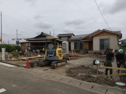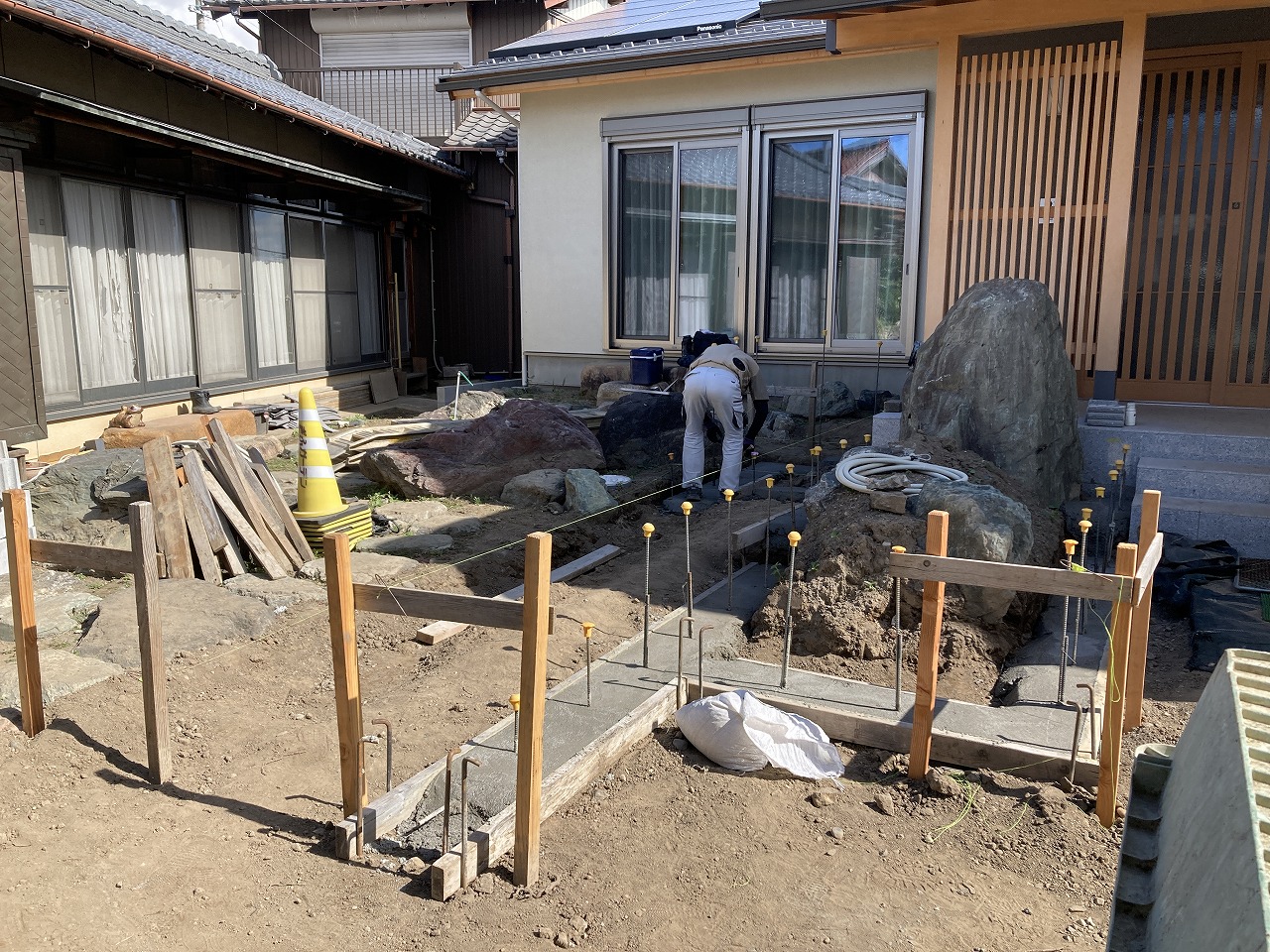 庭師さんの仕事は一段落つき、昨日から基礎工事に入っています。基礎工事のs和建設さん、なんと昨年の今頃にi様邸母屋の基礎工事してくださっていたようです。基礎工事が重なっていて、違う業者さんにお願いする予定でしたが、ご縁があるんですね。