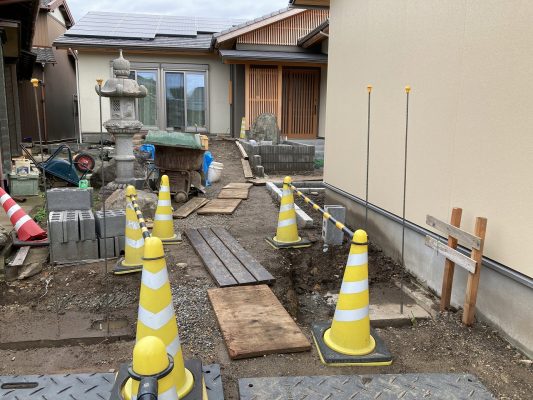 昨日から外構工事が始まりました。まずは、車庫との取り合いのない北側のコンクリート積みからです。隣地の方との間に深い溝があり、あまり境界ギリギリに建ててしまうとその間に生えた草がお互いに取りにくくなってしまうので、随分控えて既設の玉石よりも内側に立てる計画です。