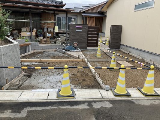 車庫内の土間コンクリートを打つ準備が整っています。11日に打設予定です。きっと軽トラとi様の愛車もここに入るのが楽しみですね👍