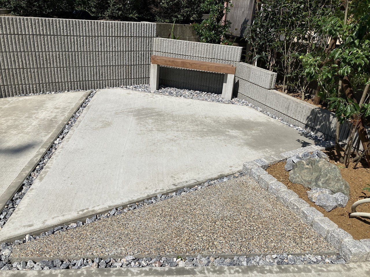 門前のスペースは、i様がうっかり忘れものした!と言う時なんかに、わざわざ高級なシャッターを開けずに車を置けたり、お友達が遊びに来られた時に駐車していただけるスペースを確保しました。土間のデザインは、工事していただいたgガーデンのs田さんにご提案いただきました👍コンクリートの割れを防ぐ為の目地を三角にするとはね~いい感じ。奥の気になるオブジェの様な横たわった木は、ベンチです。今まだお元気なお母様が、デイサービスなどに行かれる事になった時に、お迎えの車を待っている時に腰かけたり、ご近所の方と腰かけてお話しできたら良いのではと設置させていただきました。こちらも、私の当初のご提案はただのベンチでしたが、これまたs田さんが格好のいい物見つけてくださいました👍やはり、餅屋は餅屋ですね。
