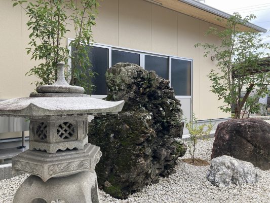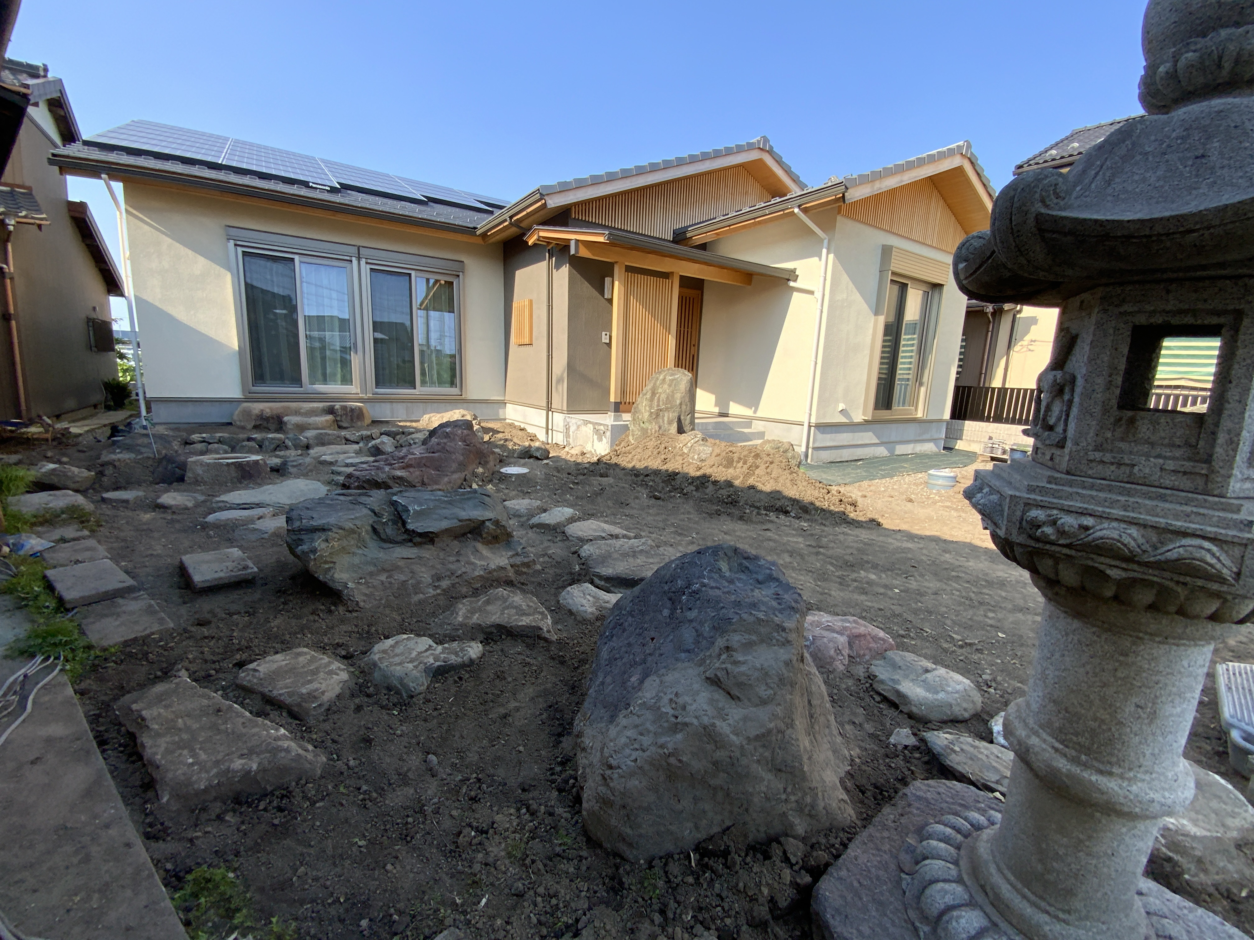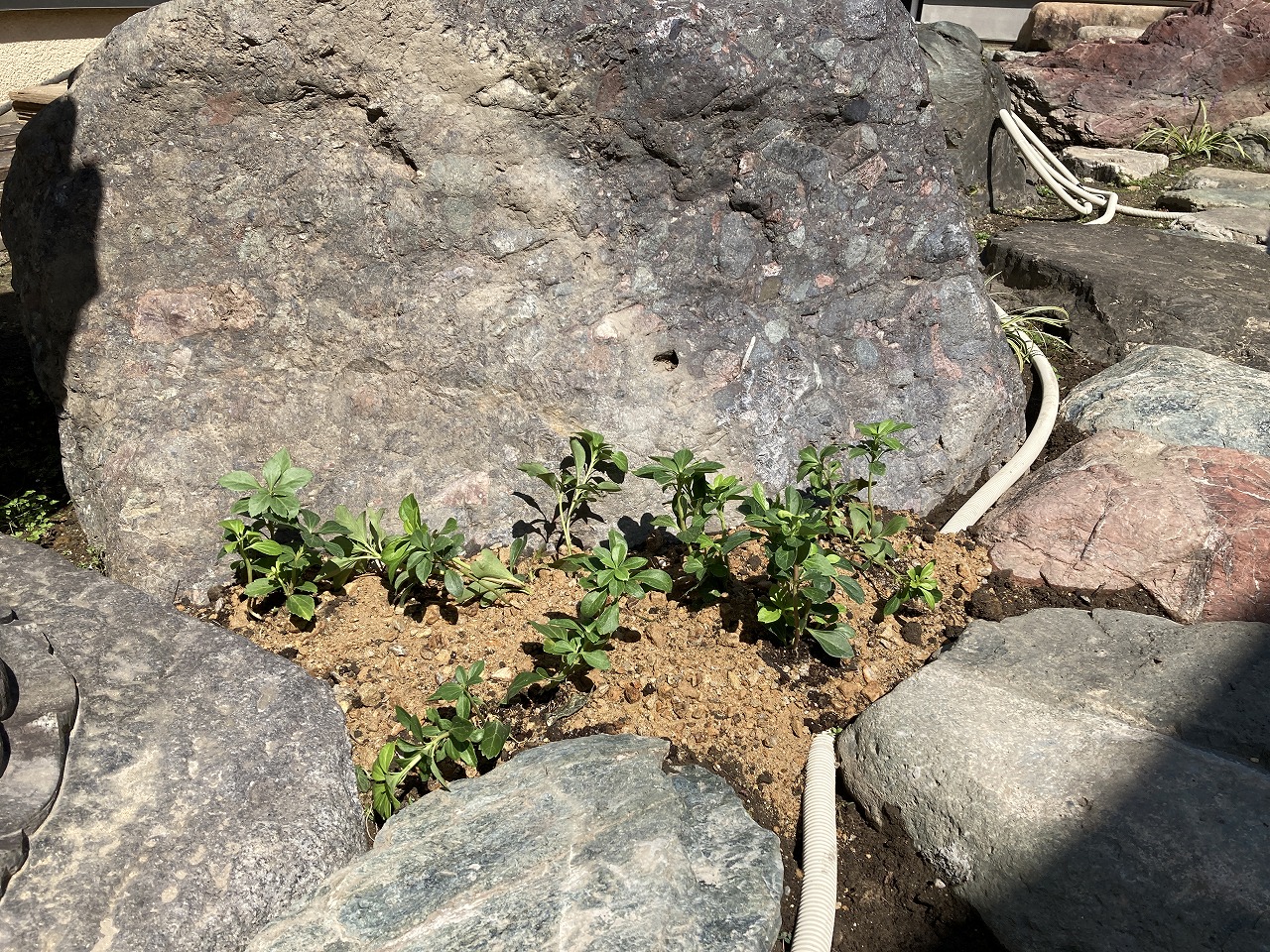 植栽工事と言っても、i様がなるべく手入れが楽なようにとのご要望でしたので、ほんの少し。砂利と石の庭にしたいとの事でしたが、庭師さんが現場を見てう~ん寂しいと思ったそうで、ちょっとだけ下草を石の根元に植えてくれました。庭師さん、植えたい気持ちをぐっとこらえて、ちょっとにしたそうです💦💦