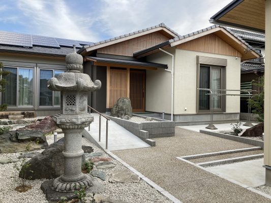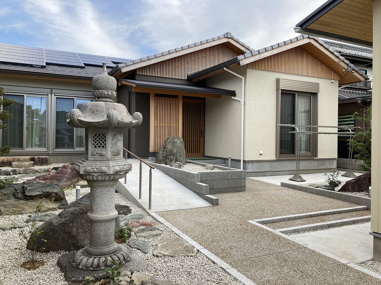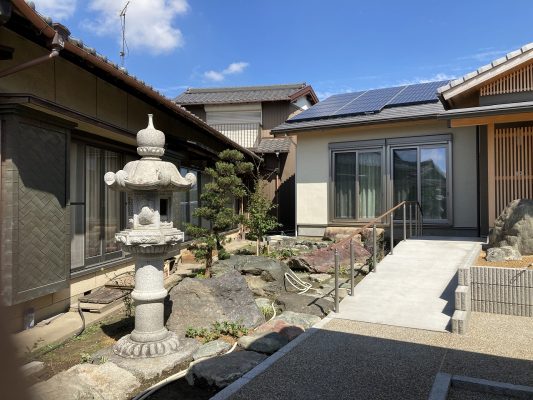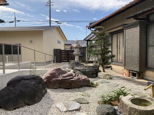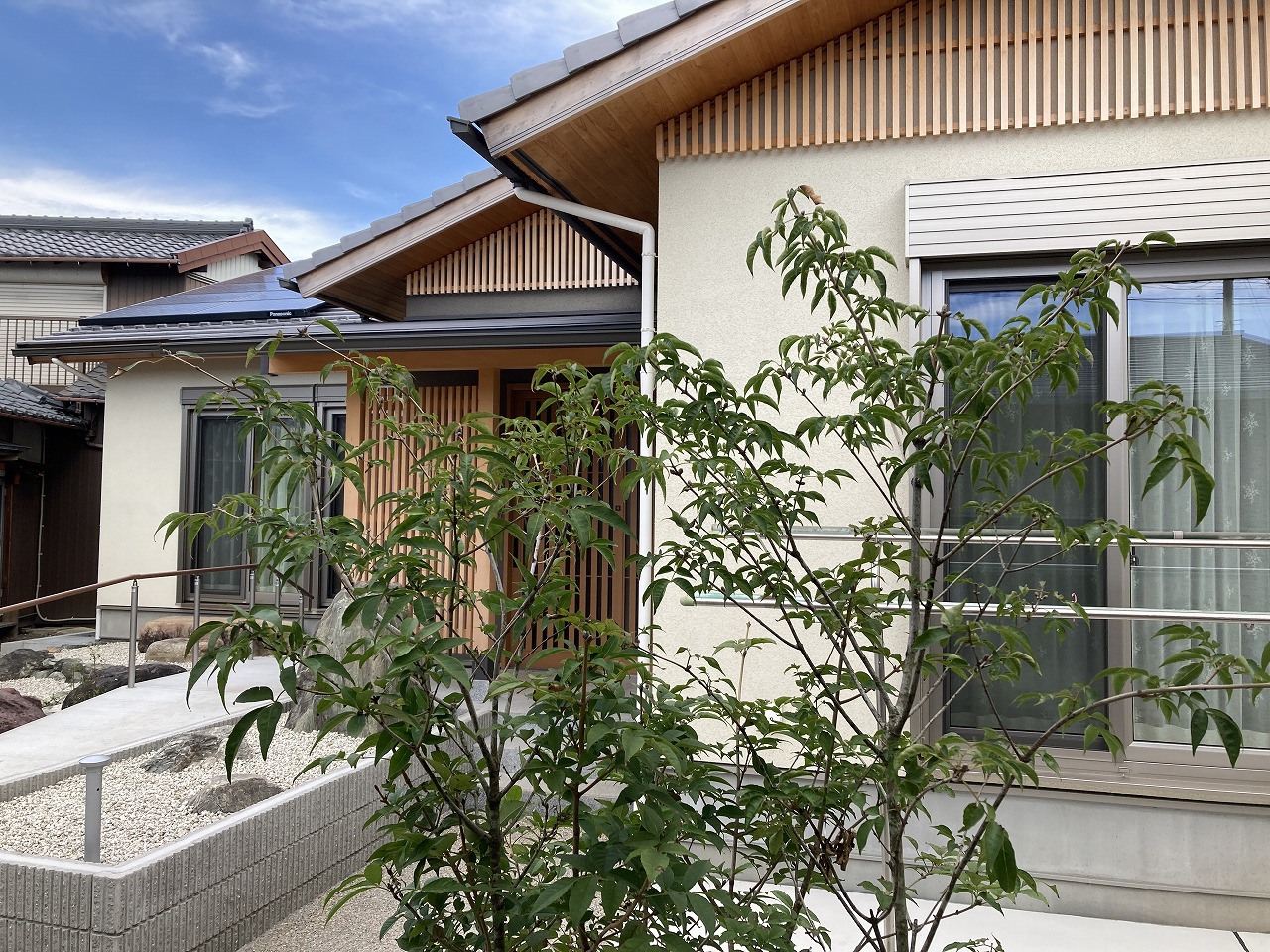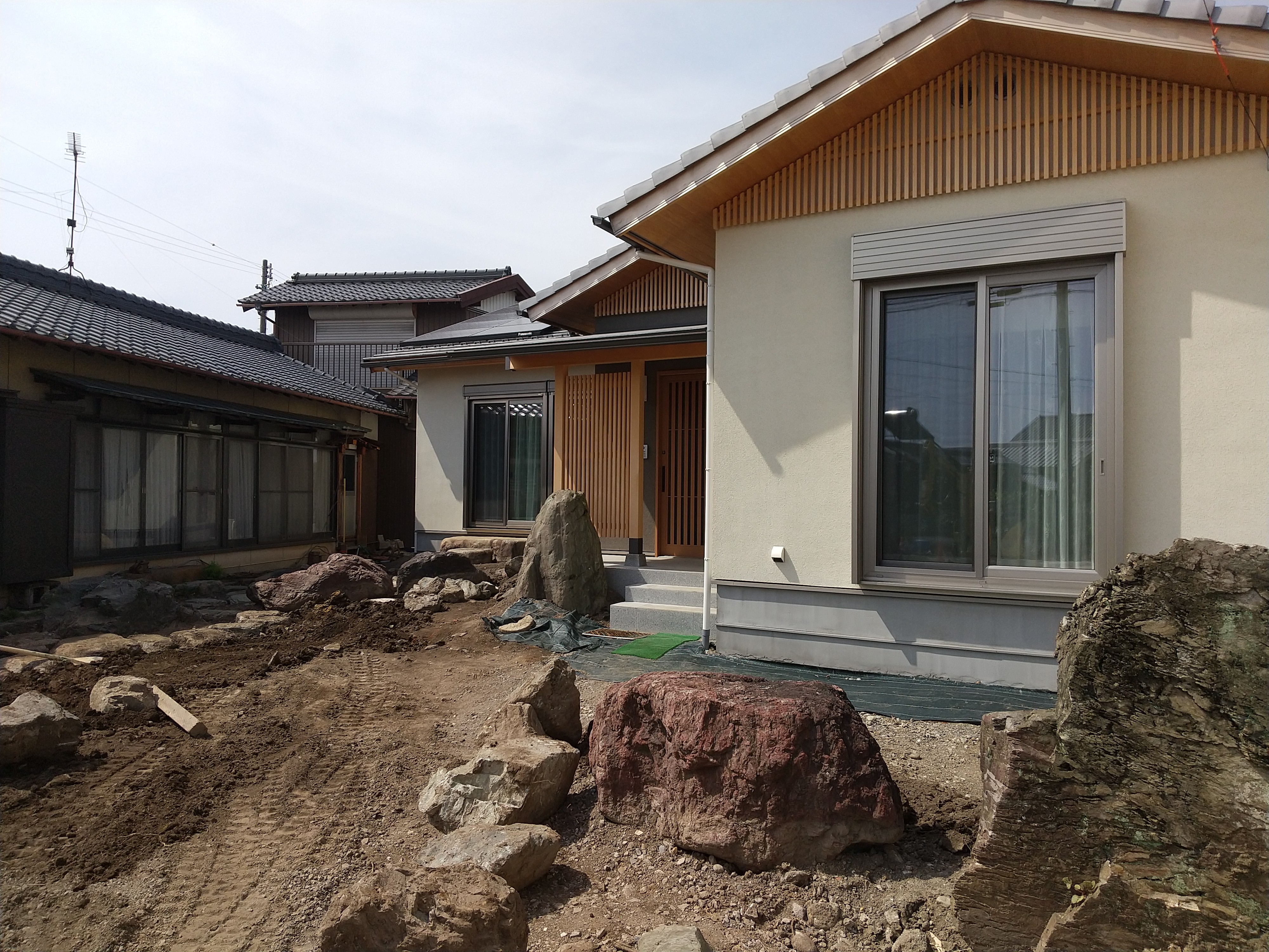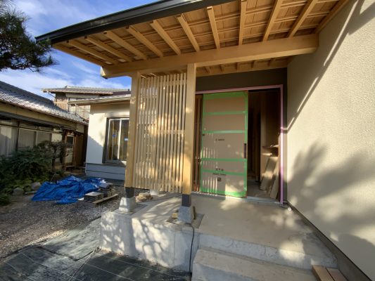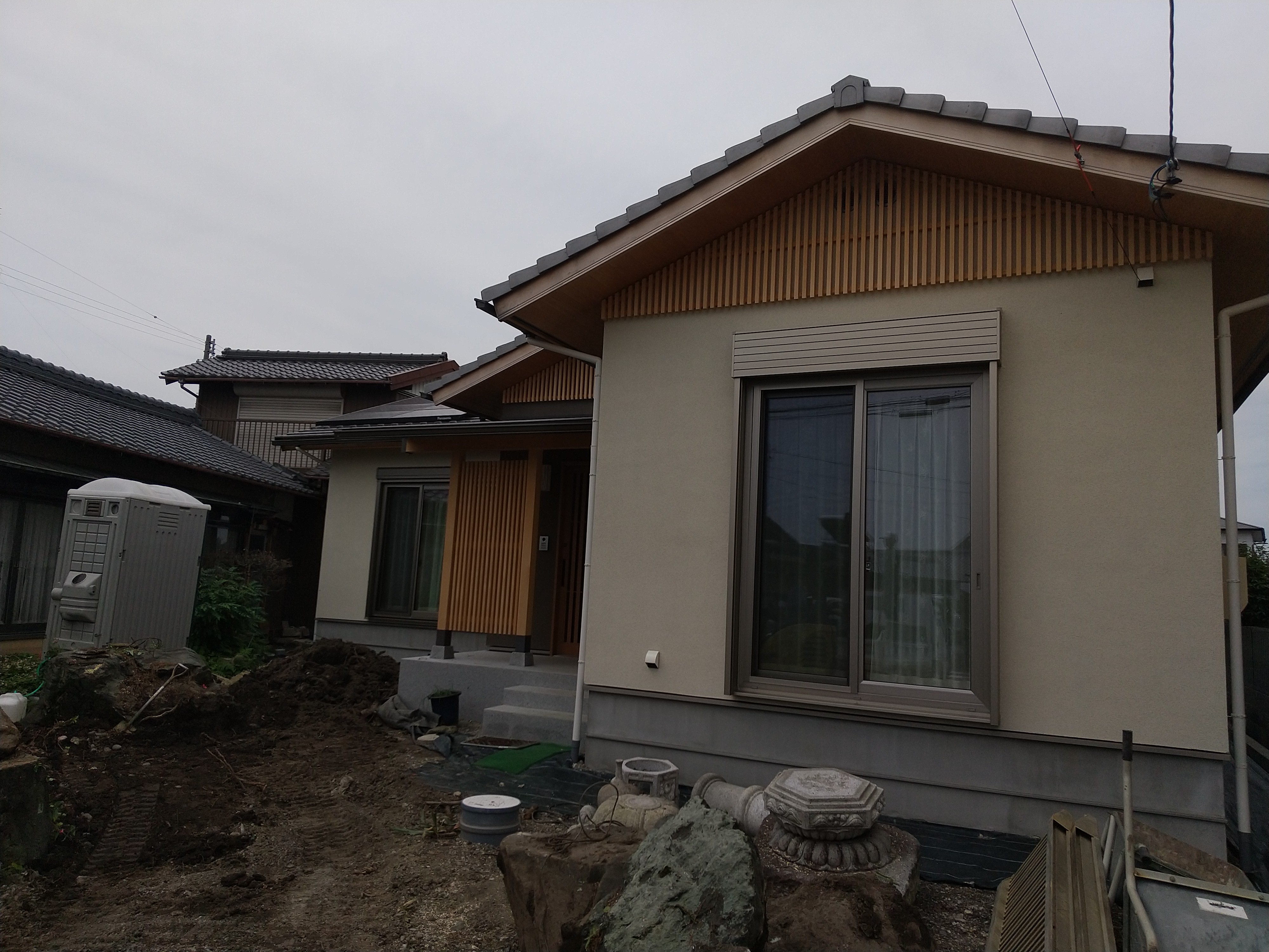 新築させていただいた母屋は、約3カ月が経ち、ヤギリや玄関の格子は少しあめ色になってきています。玄関前の植栽が伐採され、母屋もやっと顔が見えた感じです。