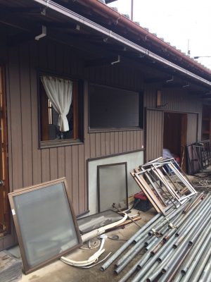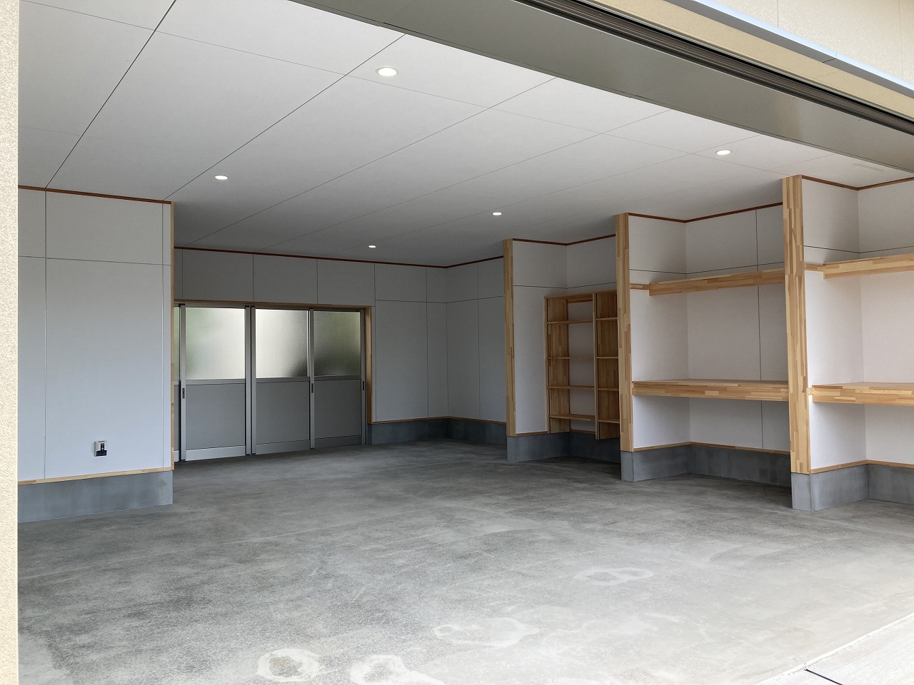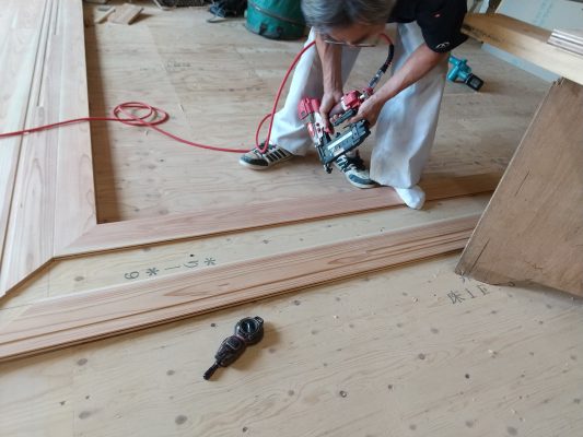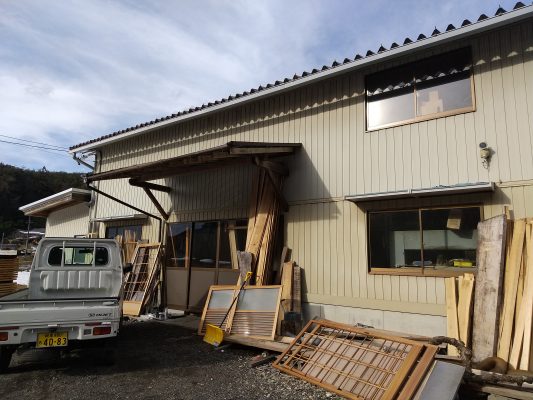 内部では、s浦サッシさんが親子で裏口のサッシ枠を組み立てています。それにしても立派な車庫です💦