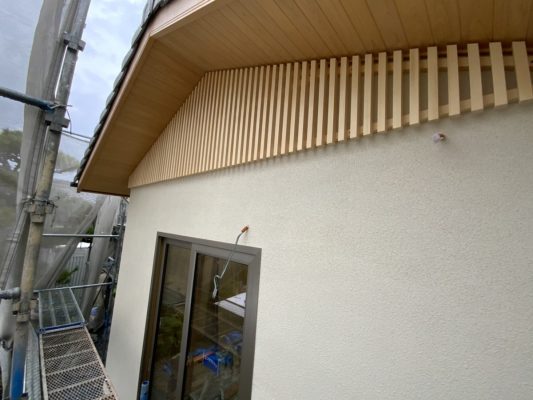 足場が外れました。今回は薄いベージュ色です。軒裏の羽目板と似た感じでパキッとした印象ではないですが、やさしい色合いです。