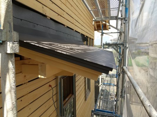 気になるパネルはどんな風に納まったのか、遅くなってしまってごめんなさい。こんな感じで流した垂木にジョイントして持ち出しています。破風が薄くなりすっきりとした印象になりそうです👍