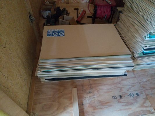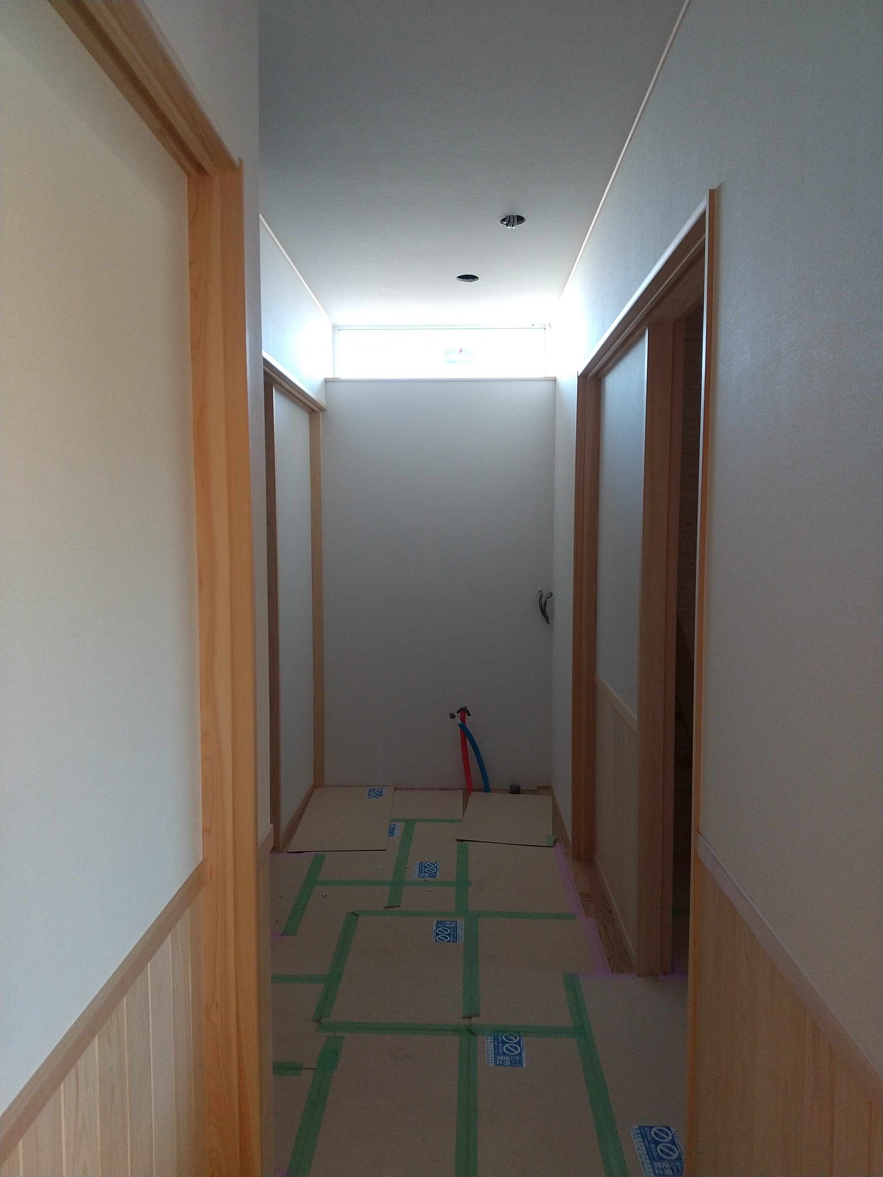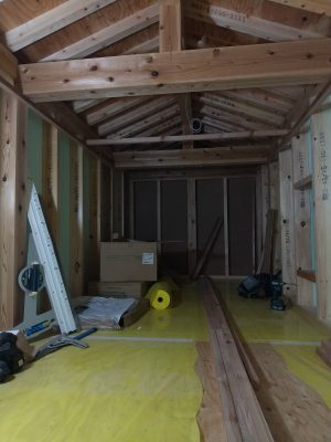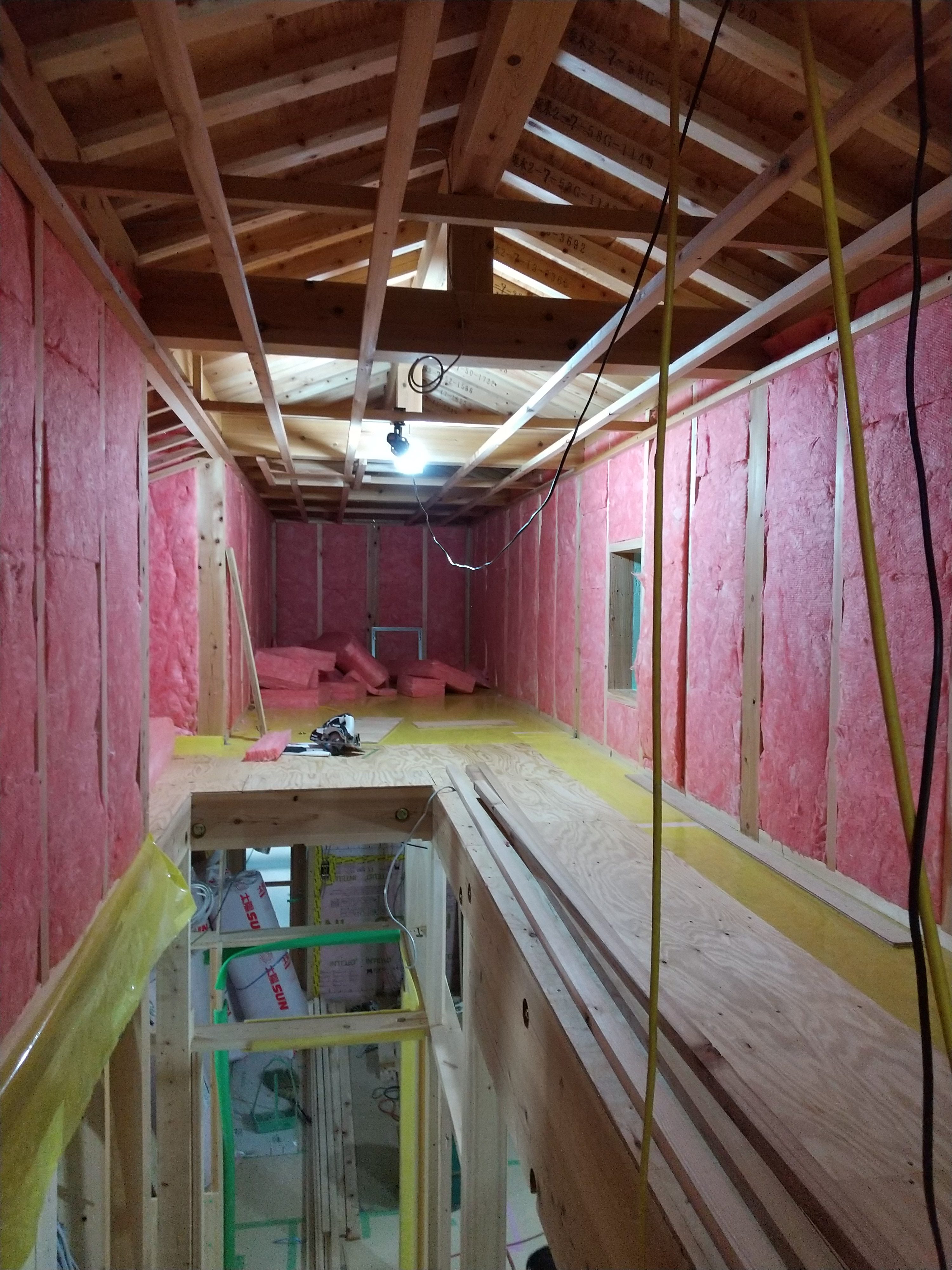 さて、またまた偵察です。昨日は雨でしたので、内部で気密シートを張ってたんですね。テープもまっすぐきれいに仕上がっています。h谷川君の仕事で、グラスウールも汚名を晴らす事ができますね。