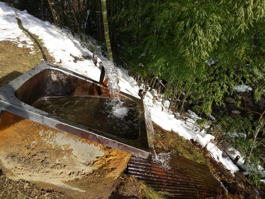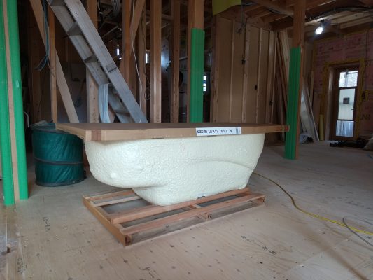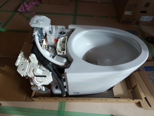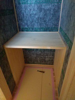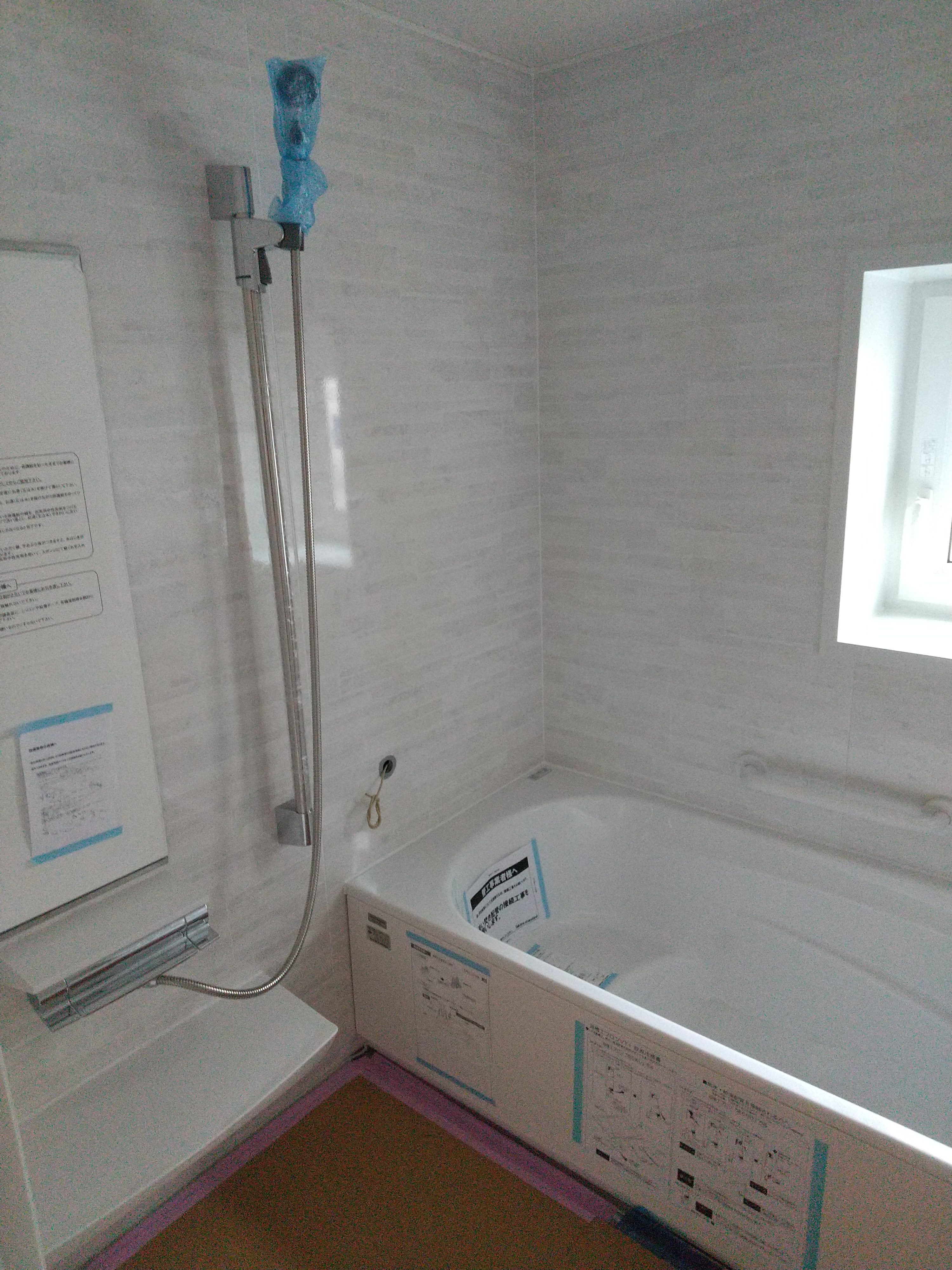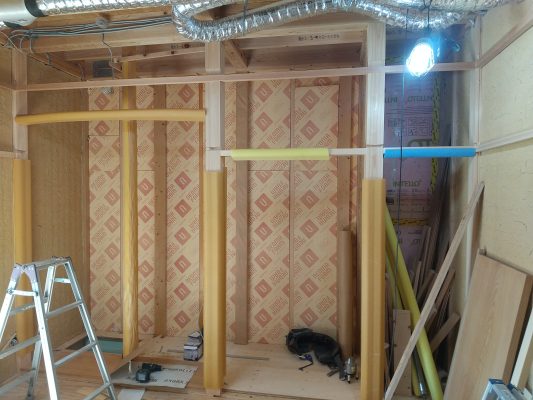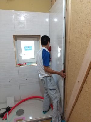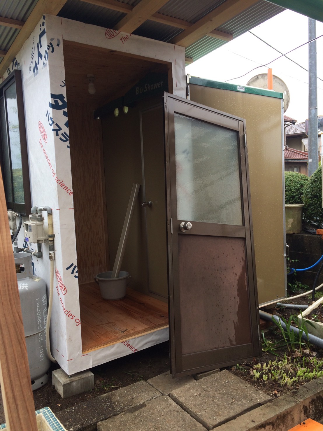 今回はハナレにはお風呂が無いので、仮設の浴室と脱衣室を庭の空きスペースに設置しました。冬場は寒そう~ですが、暖かい時期の工事なのでこれでなんとか過ごしていただけます。