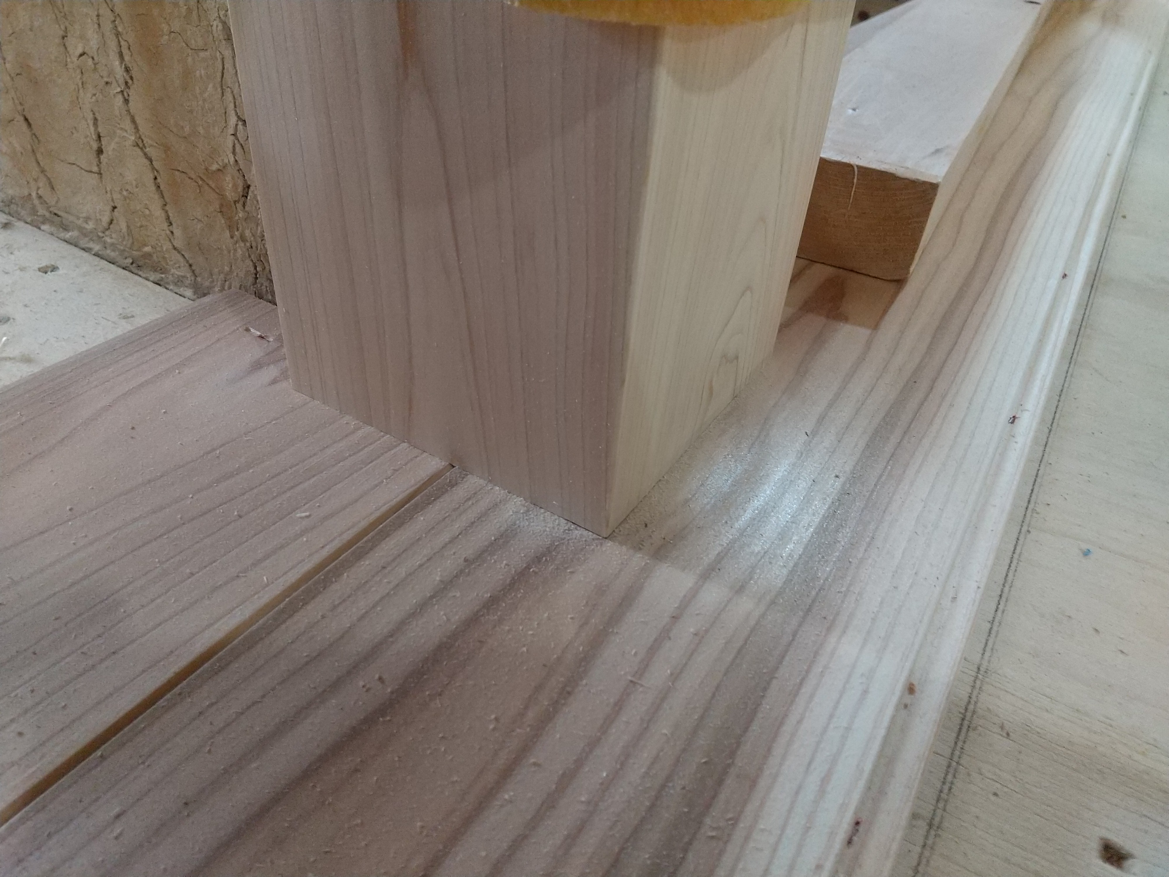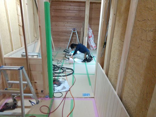 外部の仕事を進めていただいている間に、私はお掃除おばさんと化し、a監督は手早く養生。ヒノキは木クズでもいい香りで、清涼感を味わえました。明後日の荒壁の施工が楽しみです。「田河m紀の建もの探訪ブログ」も特集の取材に来ます。