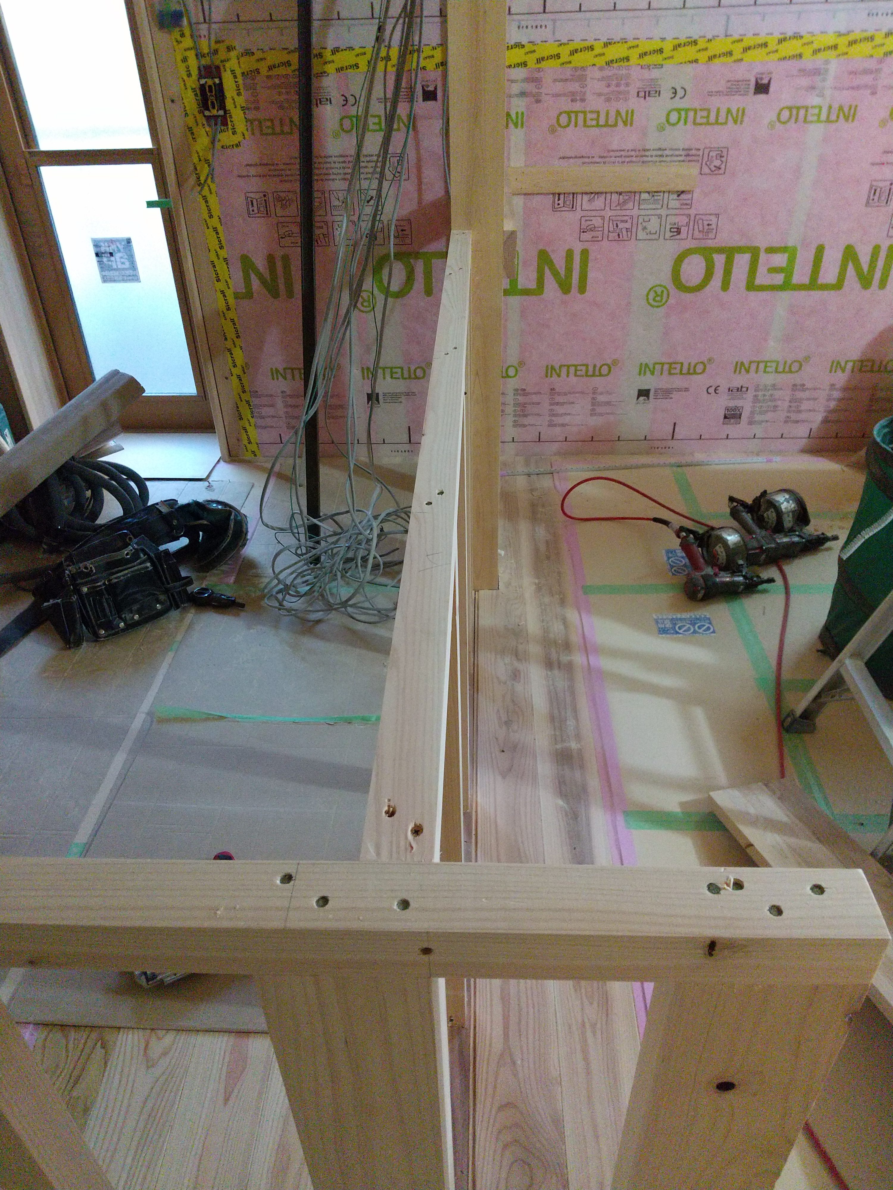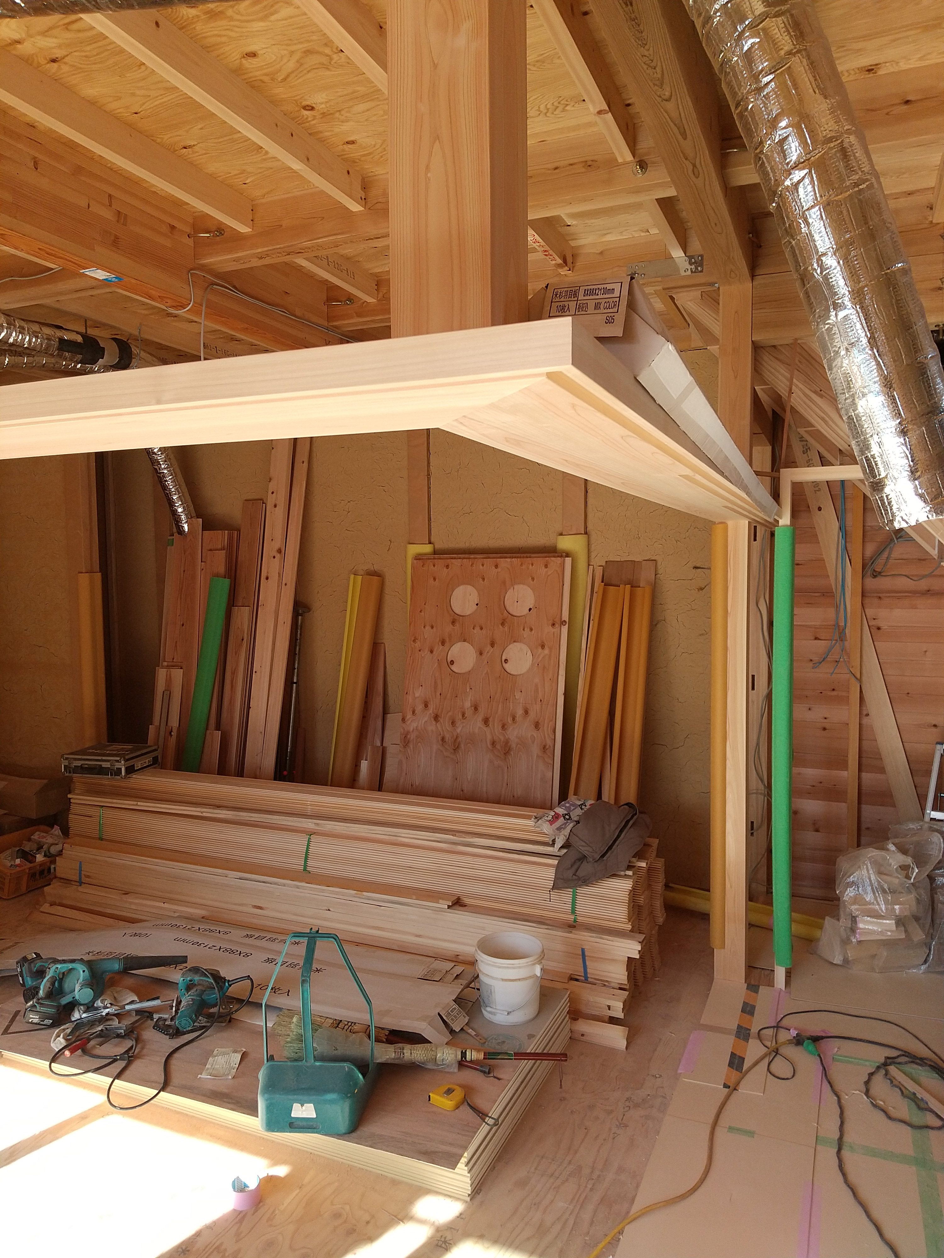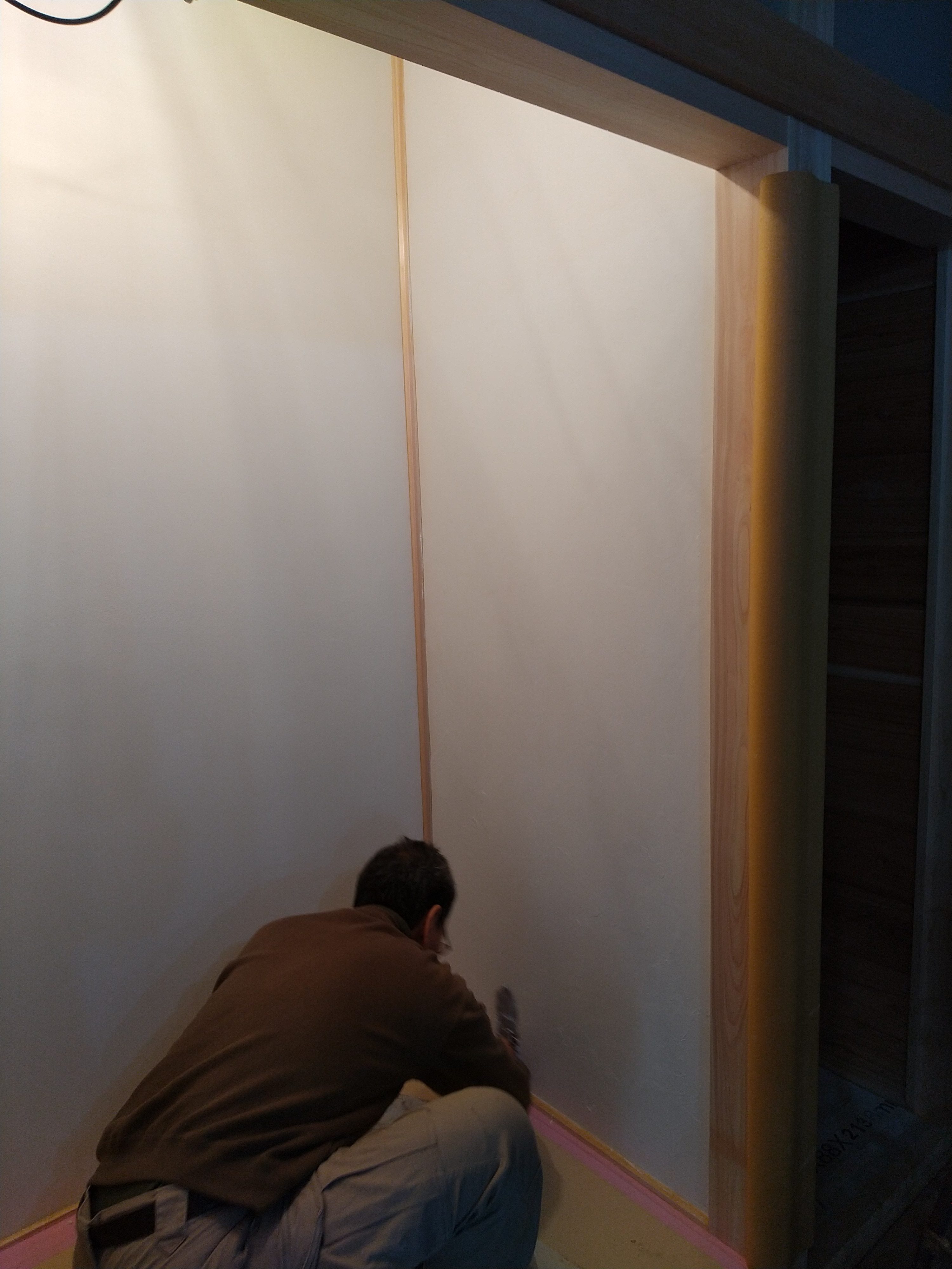 k棟梁のお弟子さんだったh間さんが見学にみえました。この格子どうやって取り付けてあるんですか?床の間の落とし掛けの見付け薄いですね~なんて、流石大工さん。棟梁曰く、落とし掛けは小ぶりな床の間なので、見付けを薄くしたそうです。確かにこの方が品がいいですね。昔はこの落とし掛けに、敵が来た時用の刀が仕込まれていたとか。今は必要ないですが、そんな細工がしてあったら楽しいですね。そんなのあったら、私は多額?のへそくりでも隠しちゃおうかなぁ~