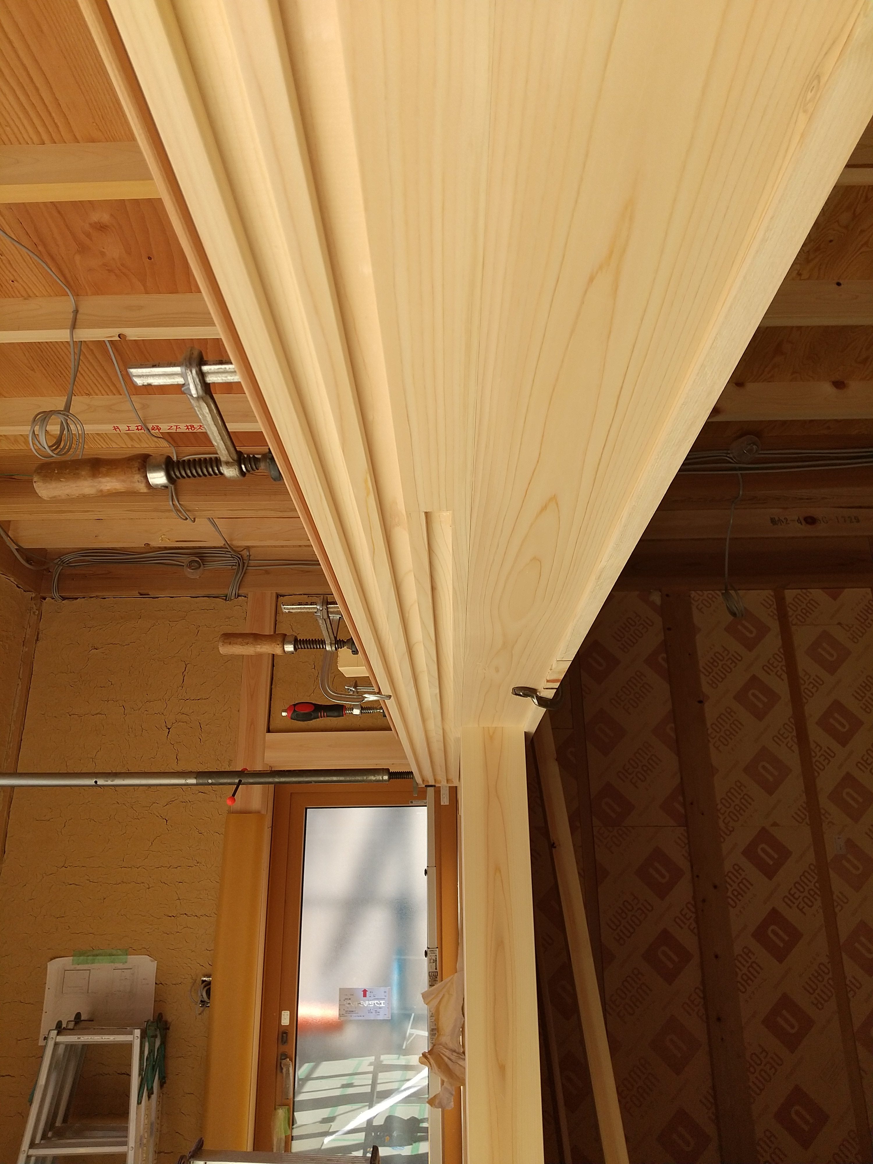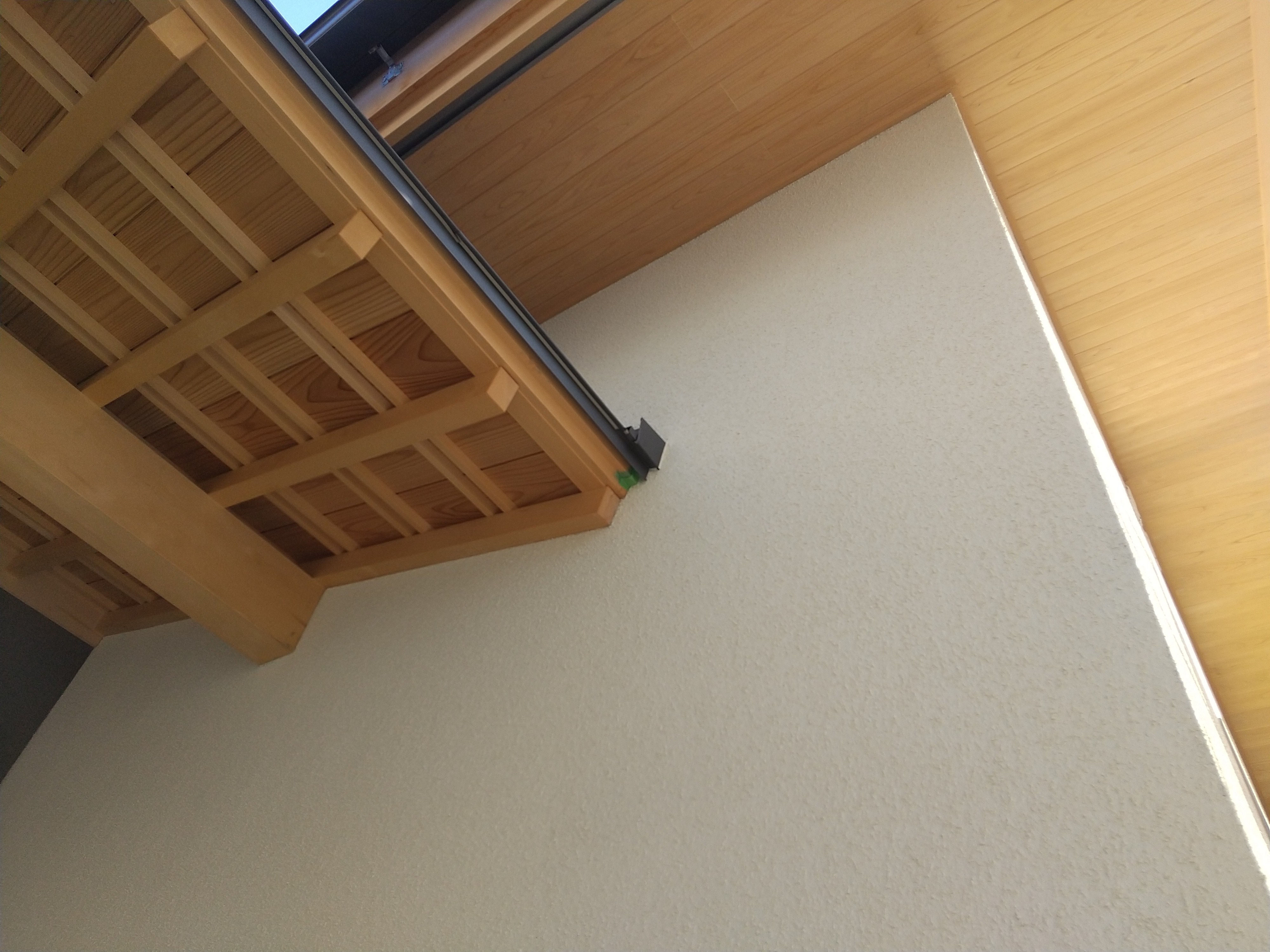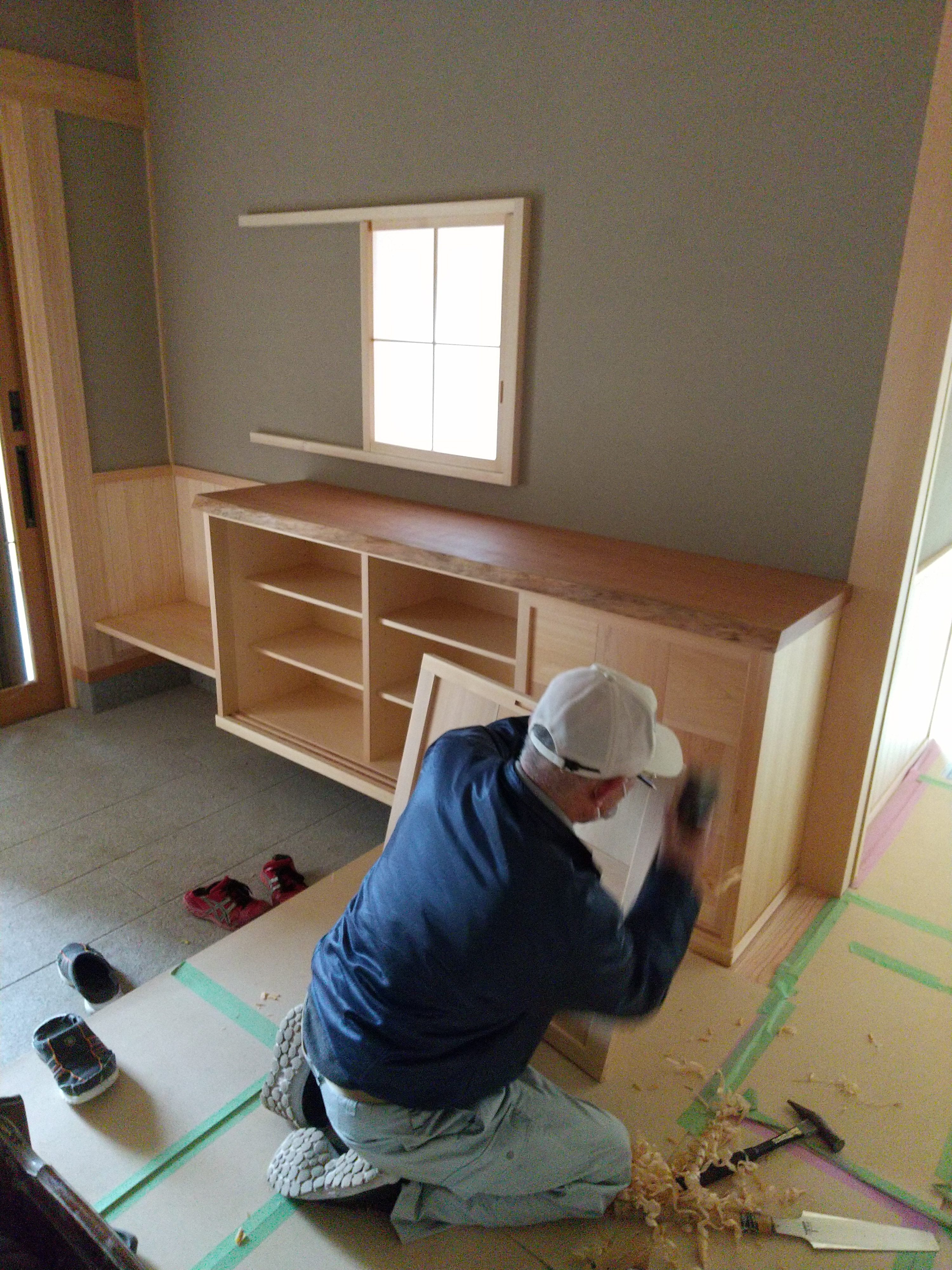 k棟梁のお弟子さんだったh間さんが見学にみえました。この格子どうやって取り付けてあるんですか?床の間の落とし掛けの見付け薄いですね~なんて、流石大工さん。棟梁曰く、落とし掛けは小ぶりな床の間なので、見付けを薄くしたそうです。確かにこの方が品がいいですね。昔はこの落とし掛けに、敵が来た時用の刀が仕込まれていたとか。今は必要ないですが、そんな細工がしてあったら楽しいですね。そんなのあったら、私は多額?のへそくりでも隠しちゃおうかなぁ~