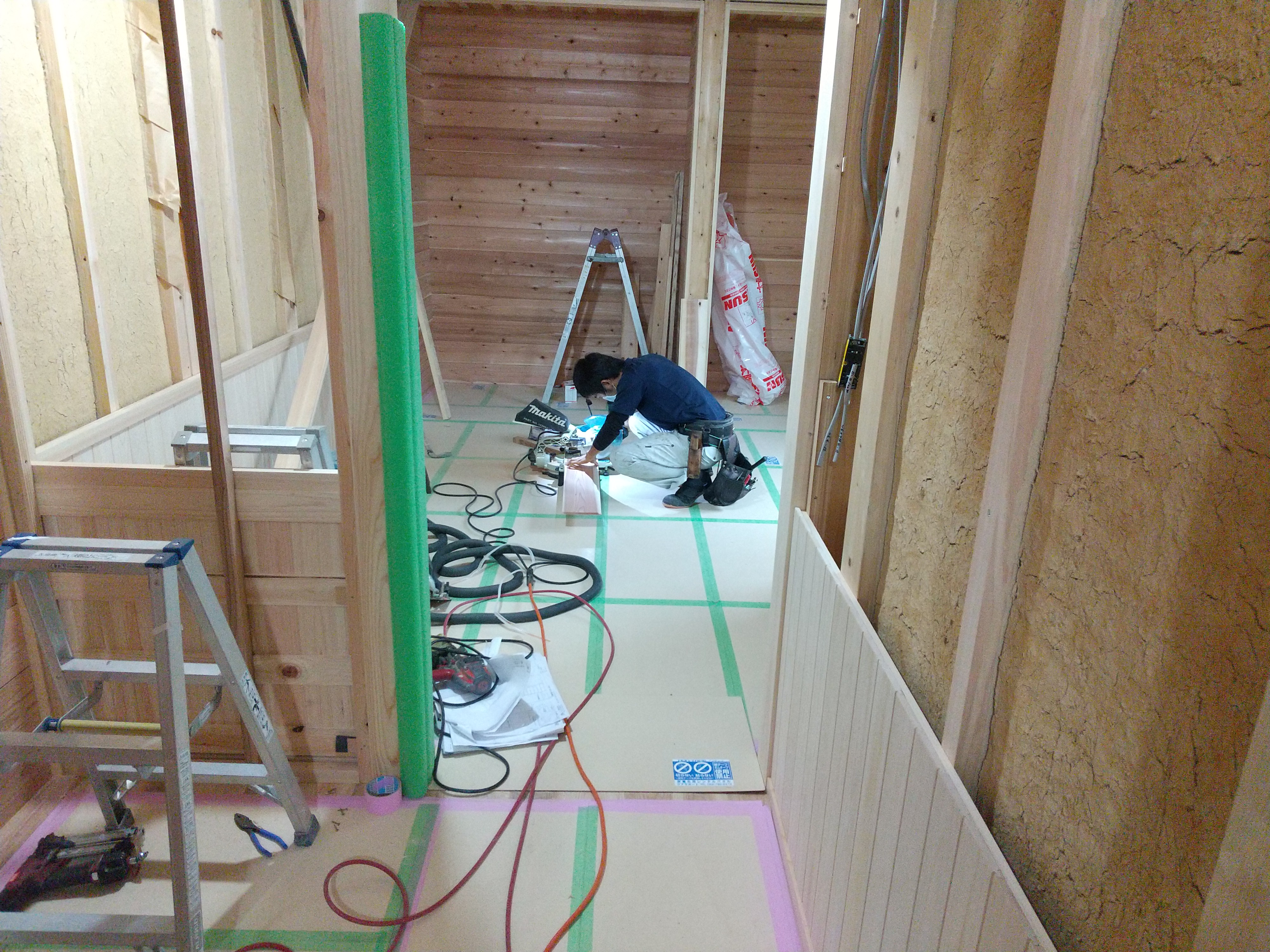 今日もi井棟梁が、一人寂しく作業をしています。今日は内部の下地材を入れています。弟子のk田君は、ヤギ小屋を造りに白川の本社に駆り出されているのです💦