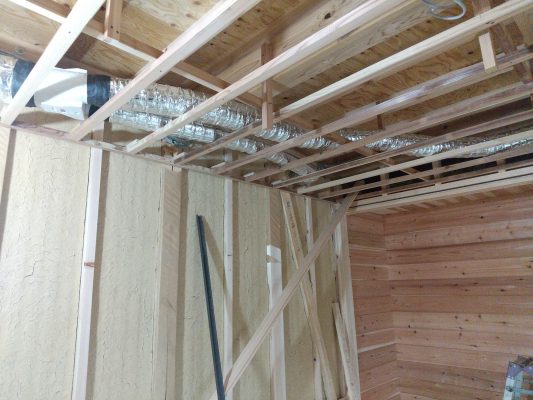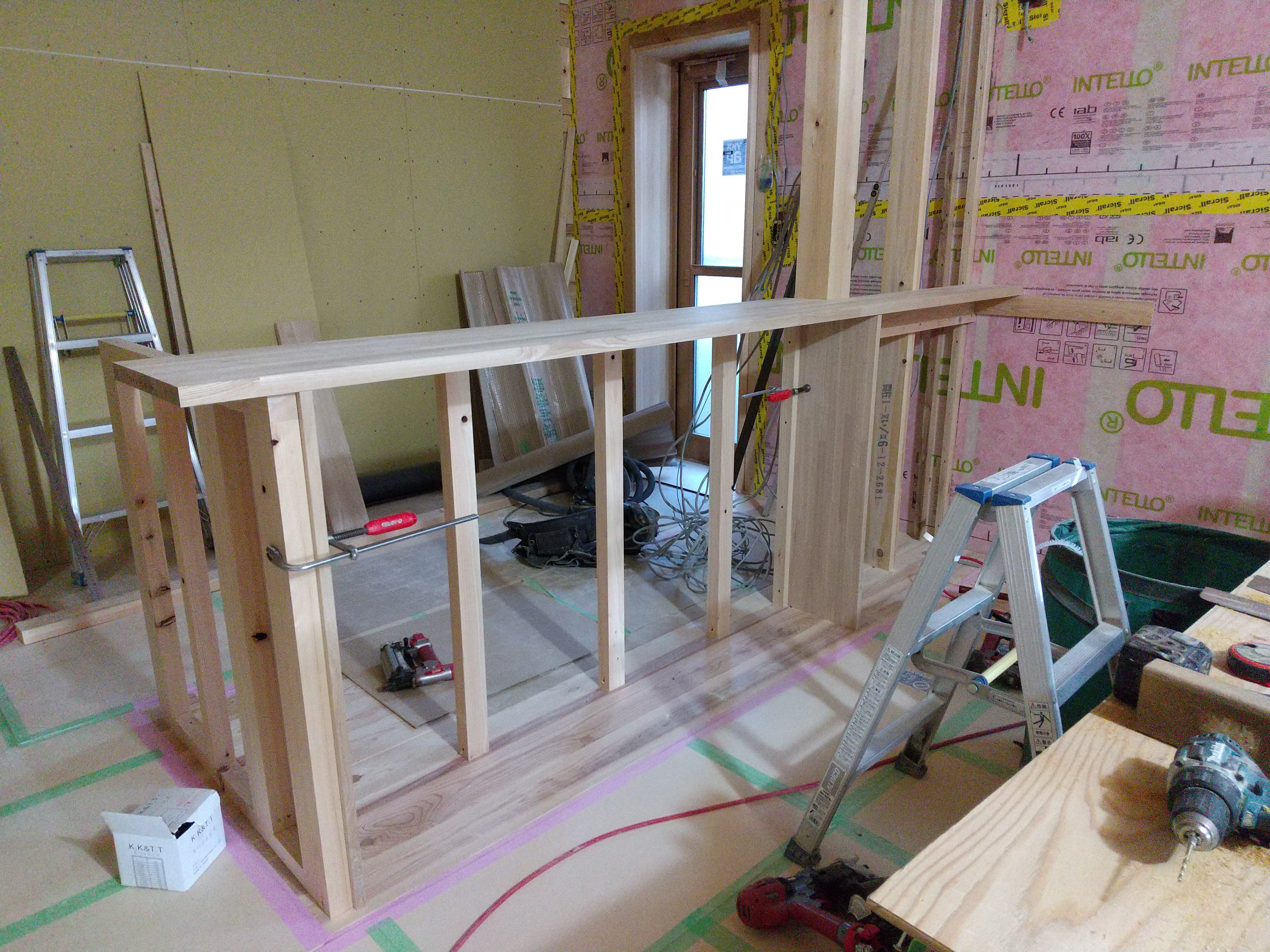 今日は、i井棟梁に代わってk田君が来ています。シャッター周りの天井下地を造作中。木工事ももうすぐ終わりです。