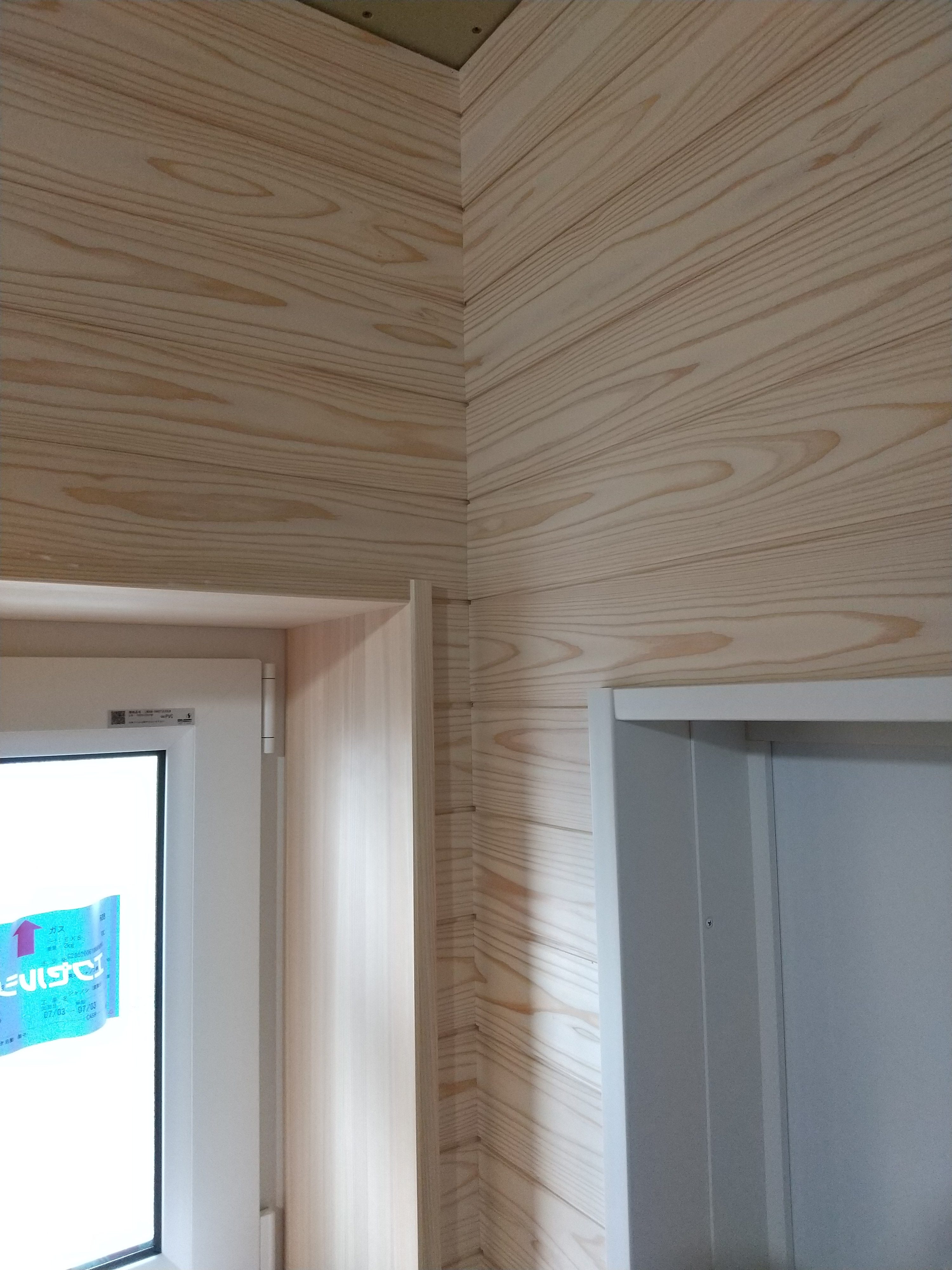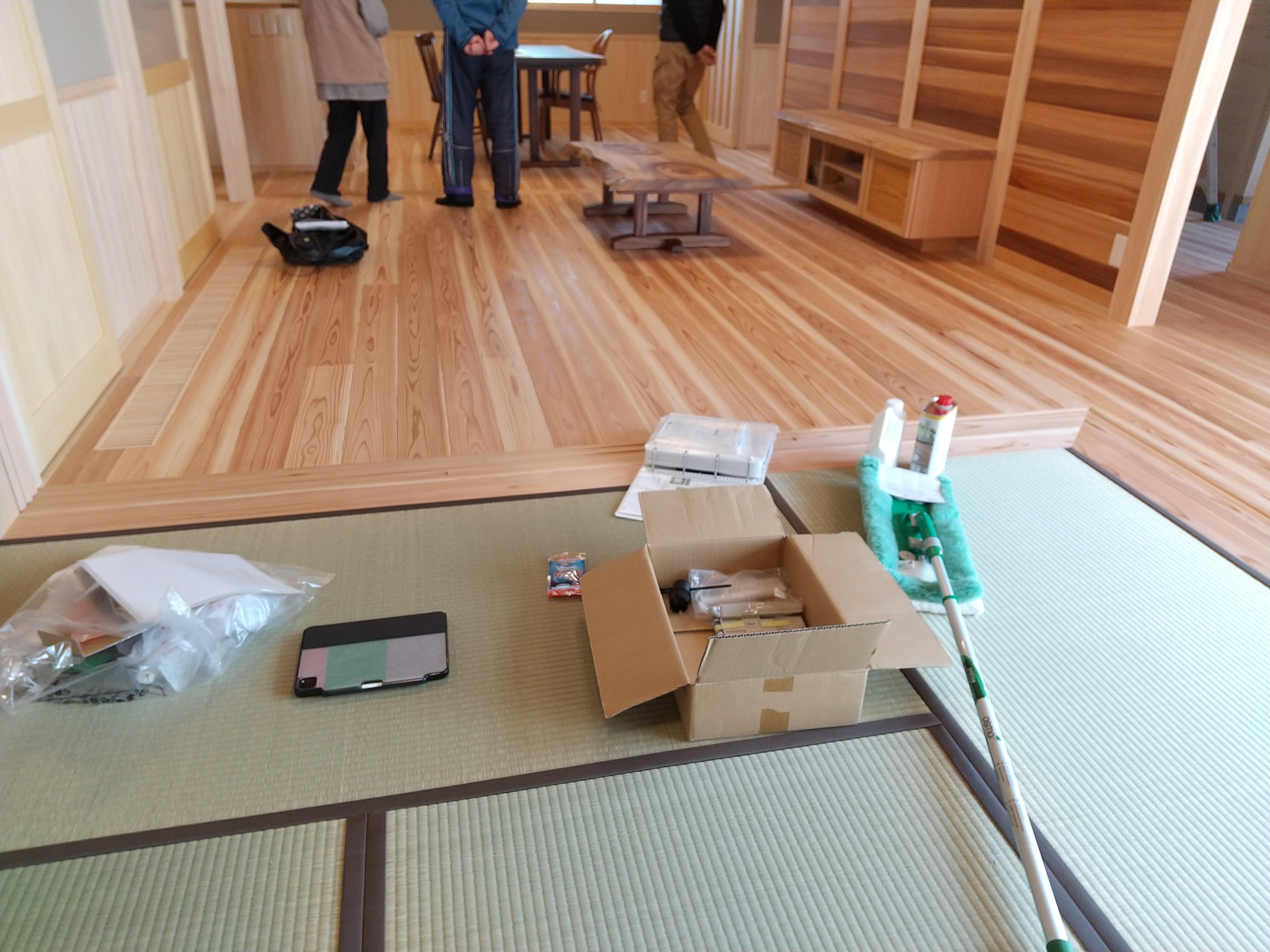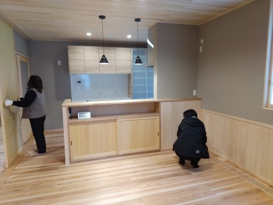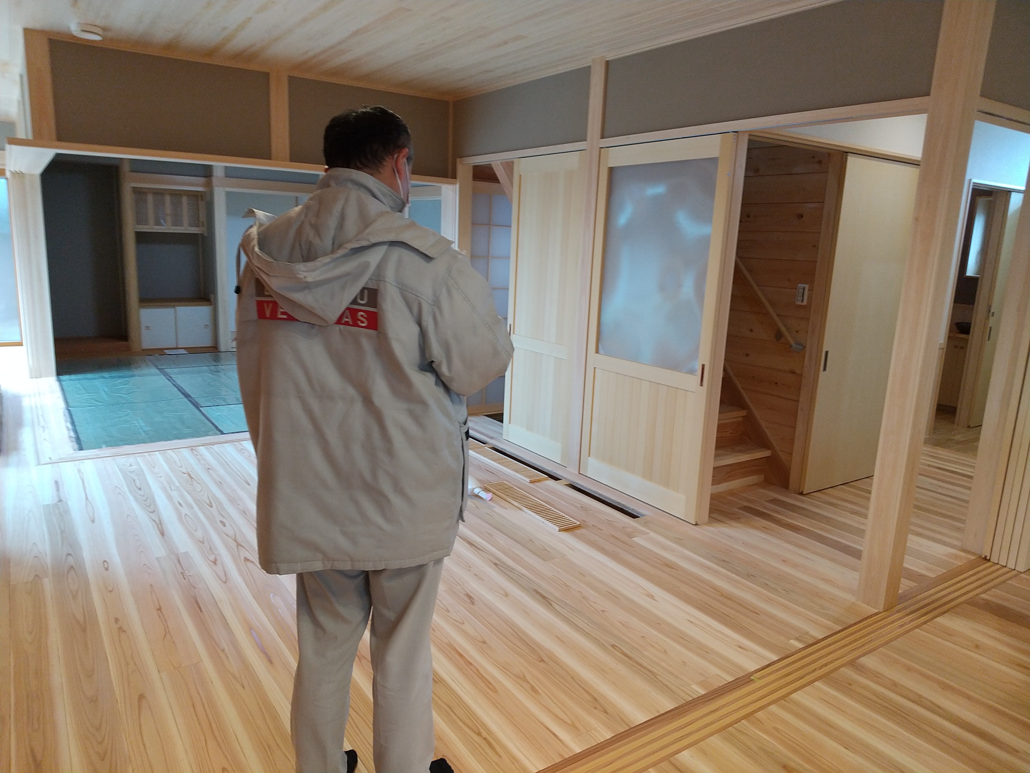 本日は、女子3人(ミノワキャッツアイ←勝手に命名してみました)で社内検査に伺いました。チェック項目を1つずつ確認し、傷や汚れなども確認していきます。i様の家は、無垢材をふんだんに使用していますので、職人さん達も大変だっただろうと思いますが、ここは厳しめの目で凹みなど確認していきます。無垢材ですので、水で濡らすだけで多少の凹みは戻ったりします。