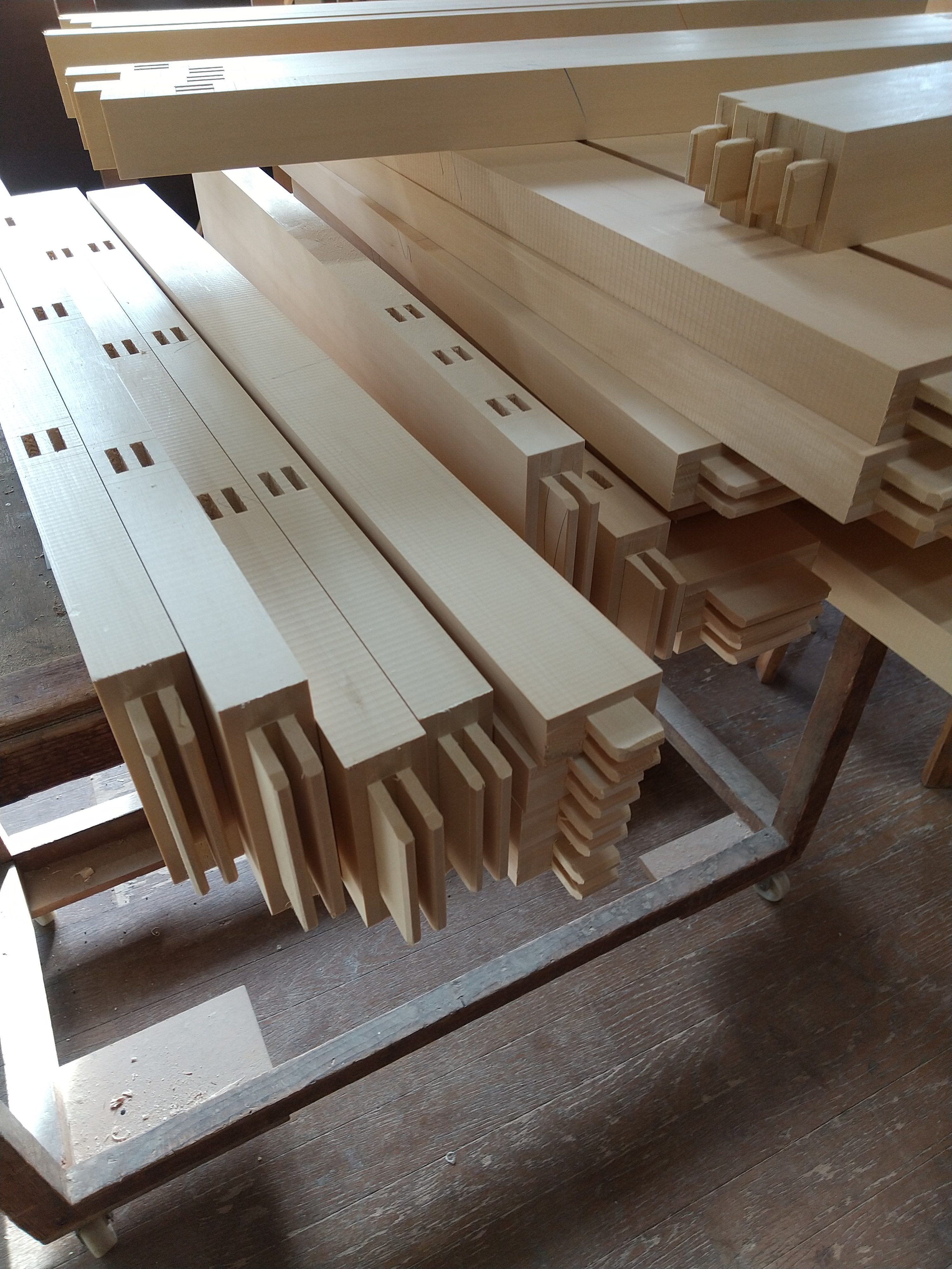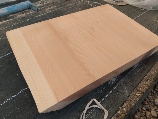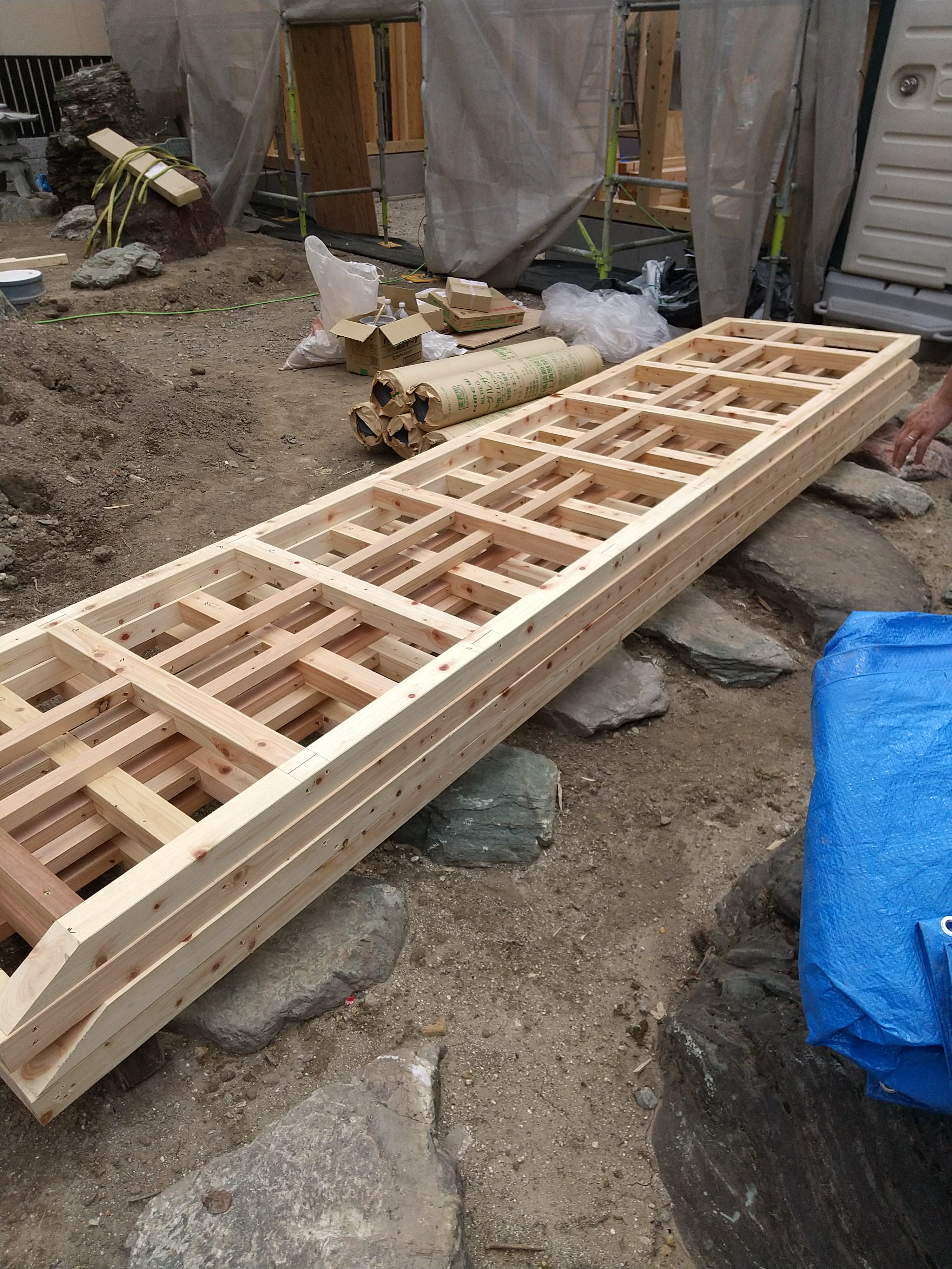 そして、プレカットではお目にかかれない、パネルを発見。ケラバ部分の垂木と母屋を合体させたような物のようです。i井棟梁が工夫して組んで来たこのパネル。どんな感じに納められたのか、最後まで見届けられなかったので、明日ちょこっと覗いてみようと思います。