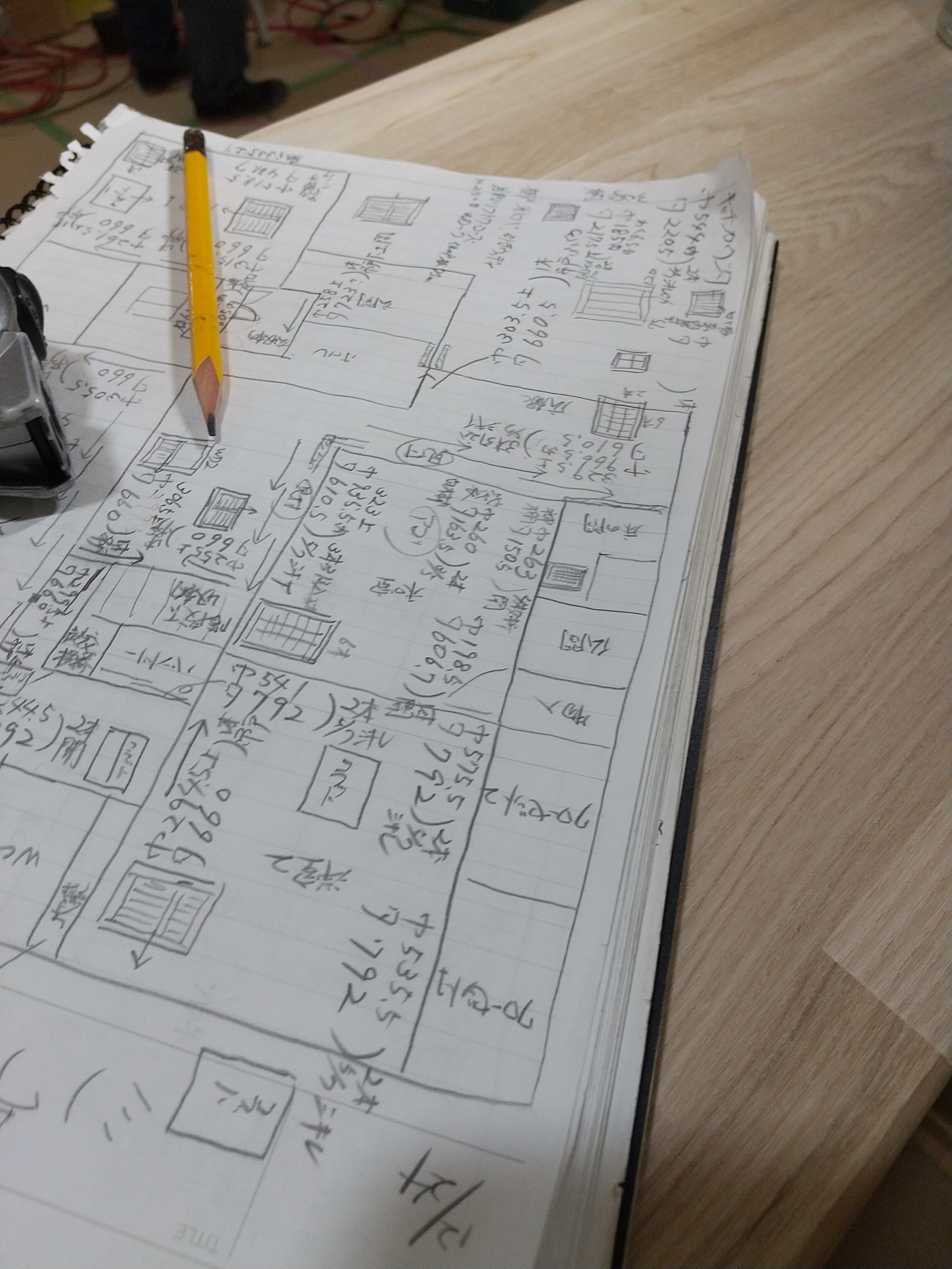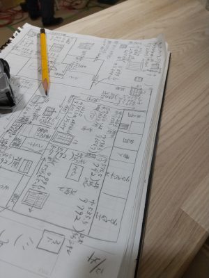昨日の夕方、a監督とk棟梁に建具の納まり、半埋め込みエアコンの納まりを相談しに行ってきました。事務所で1/10の大きめに描いた図面も、現場で見ると小さいです。h師匠が言う様に1/1がやっぱり必要です・・・。