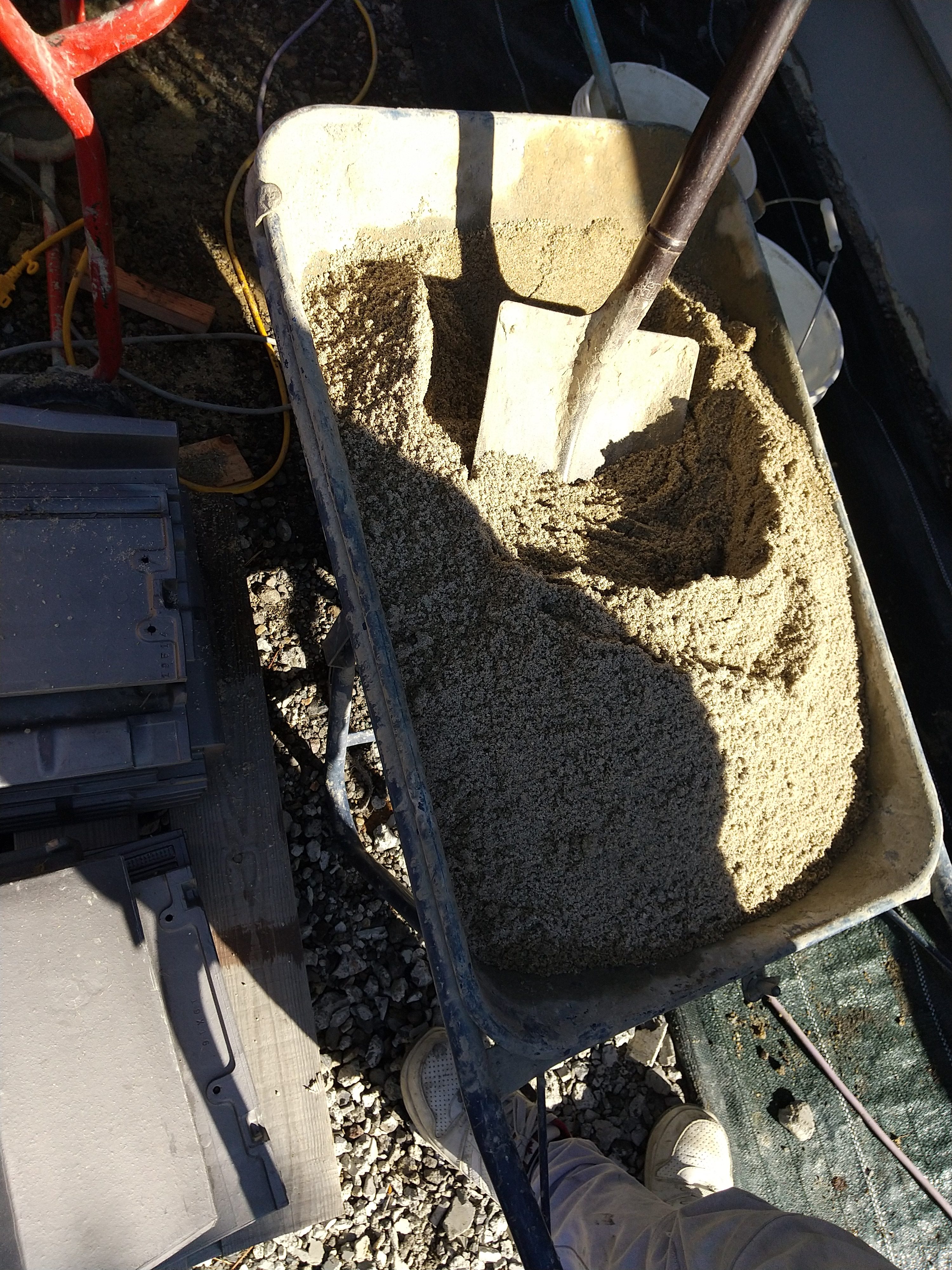昨日のお天気から一転、本日も雨になってしまいました。明日は大降りの予報。瓦屋さんは急いで瓦を運んで来ています。